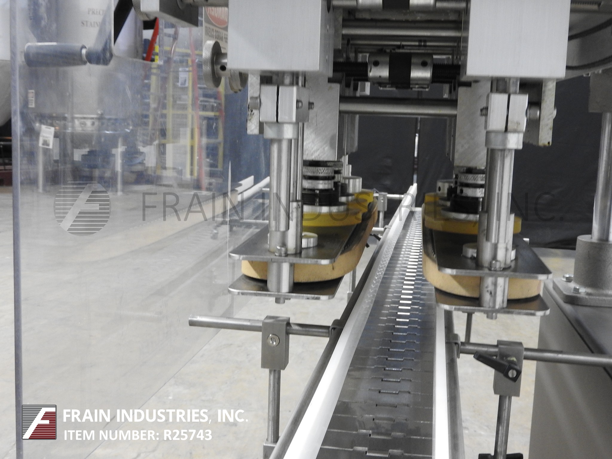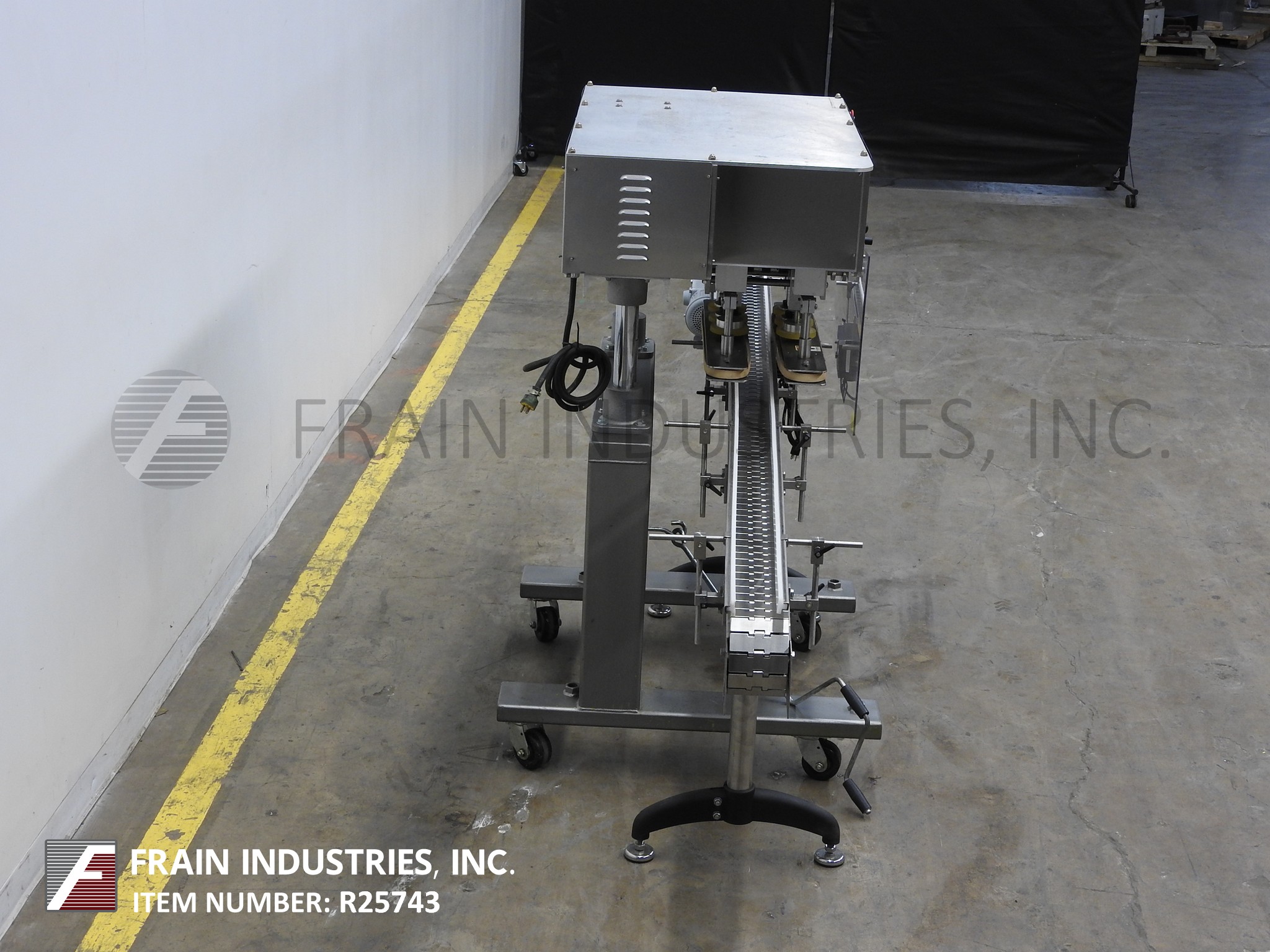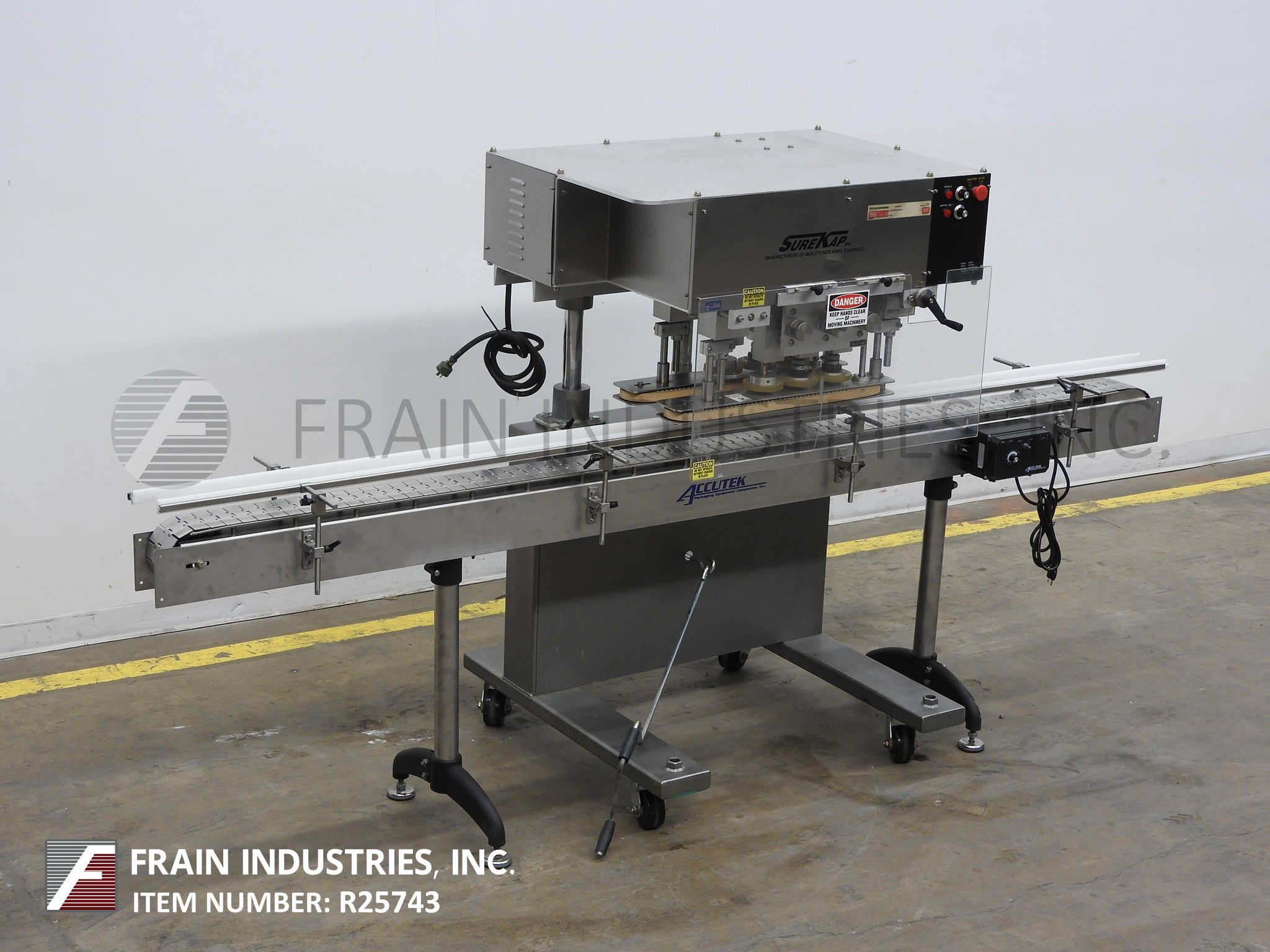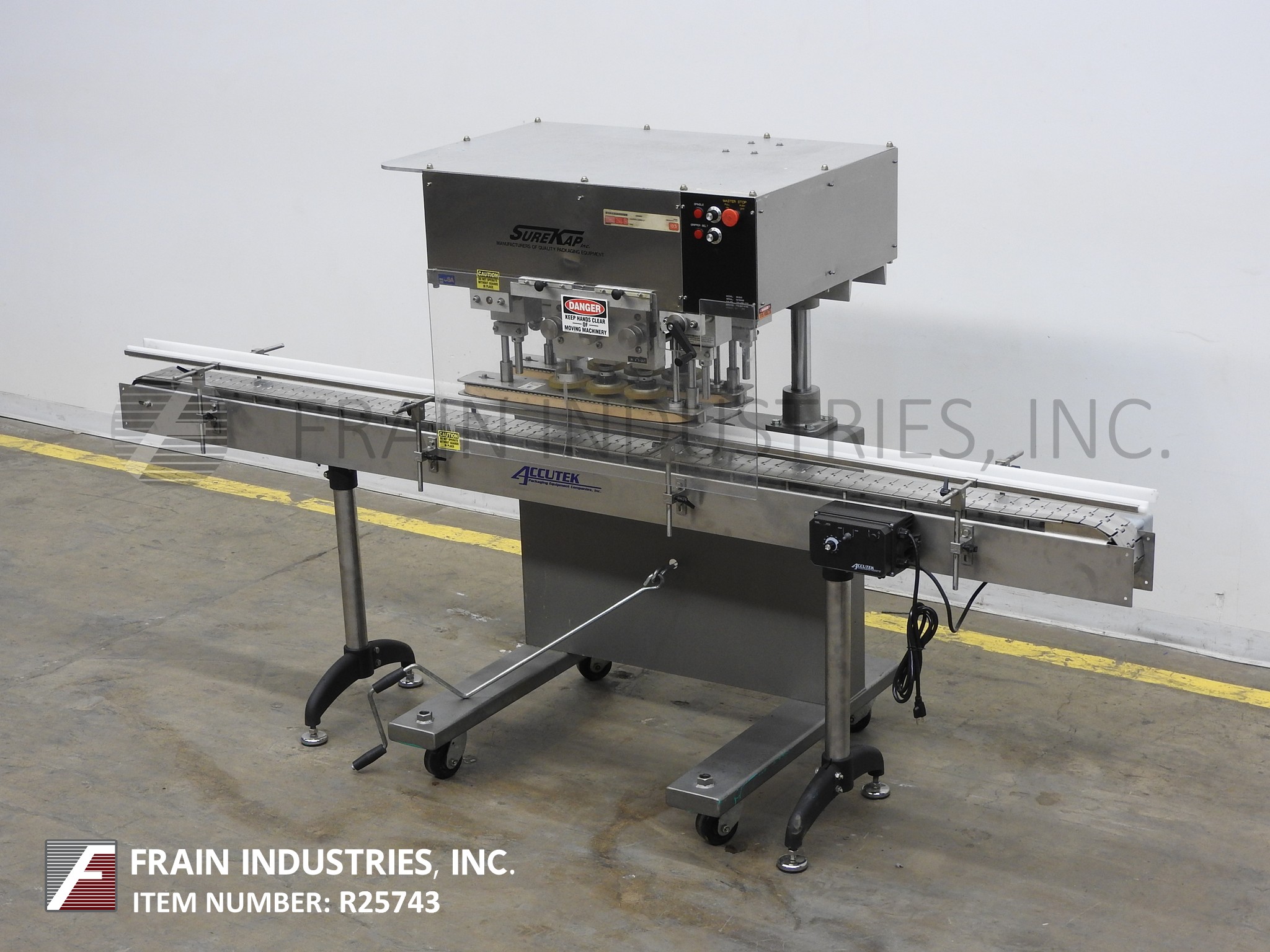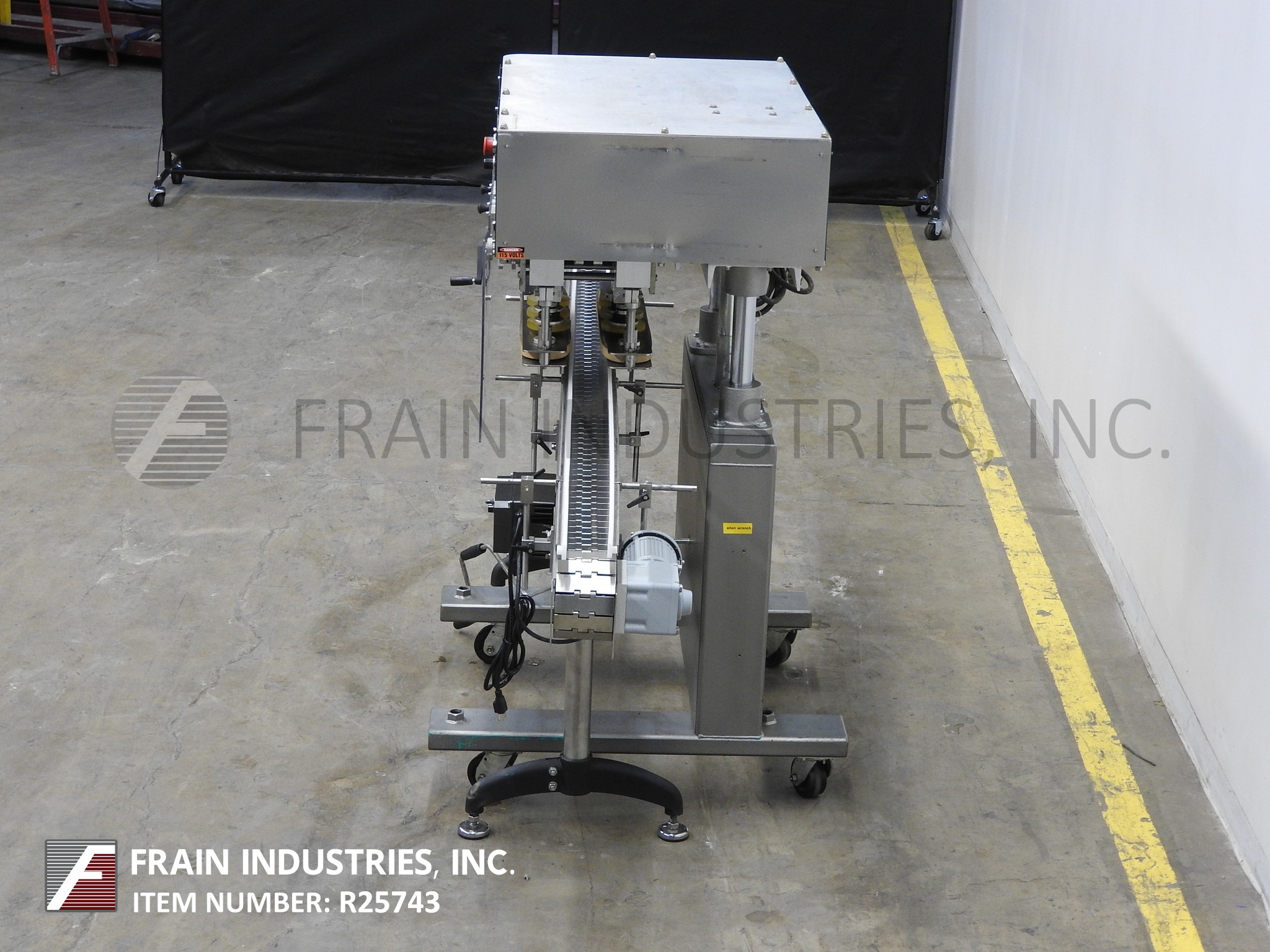 返回所有设备Surekap Model SK600,半自动,内联,不锈钢,3站,6个主轴滚动传送带或重新吸引每分钟10到90个容器 - 取决于材料,应用和操作员灵活性。帽尺寸范围:直径8毫米至110毫米。Equipped with 10’L x 4.5"W stainless steel conveyor, 24" long x 1" wide single container gripper belts, (3) hand crank adjustable spindle stations the last with clutche control. Control panel with spindle and gripper control dials, start and e-stop buttons. Mounted on heavy duty stainless steel "C" base frame with casters.