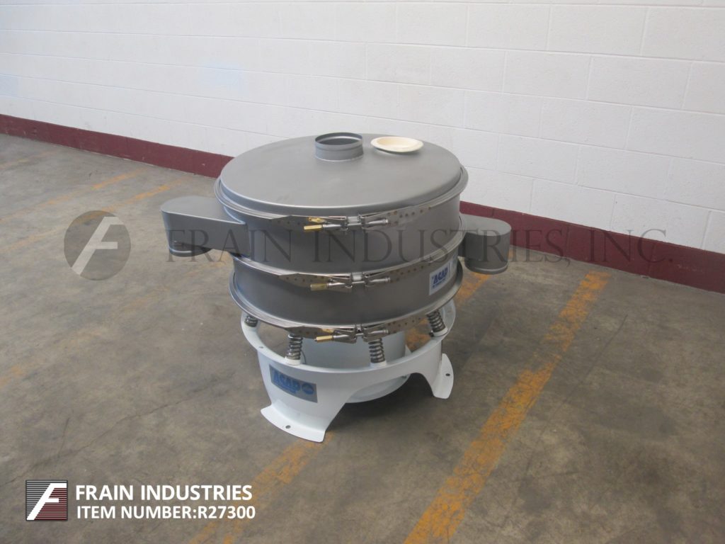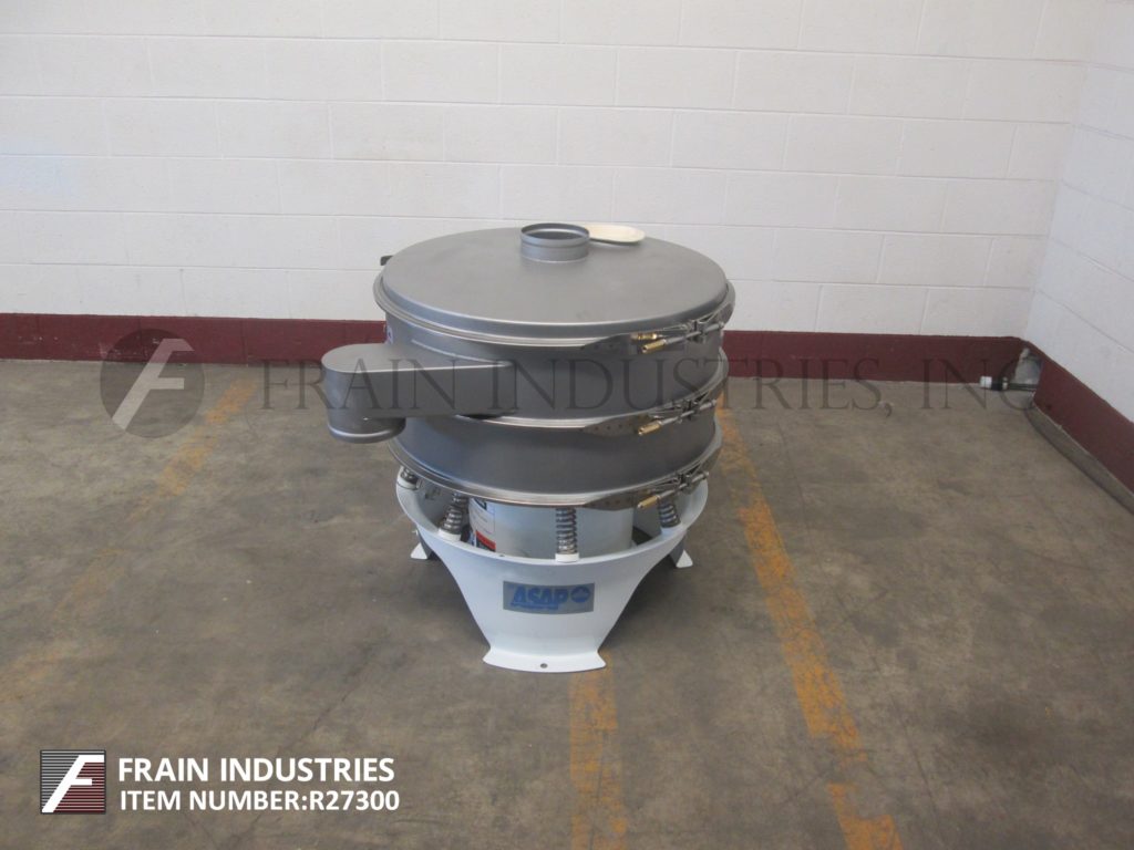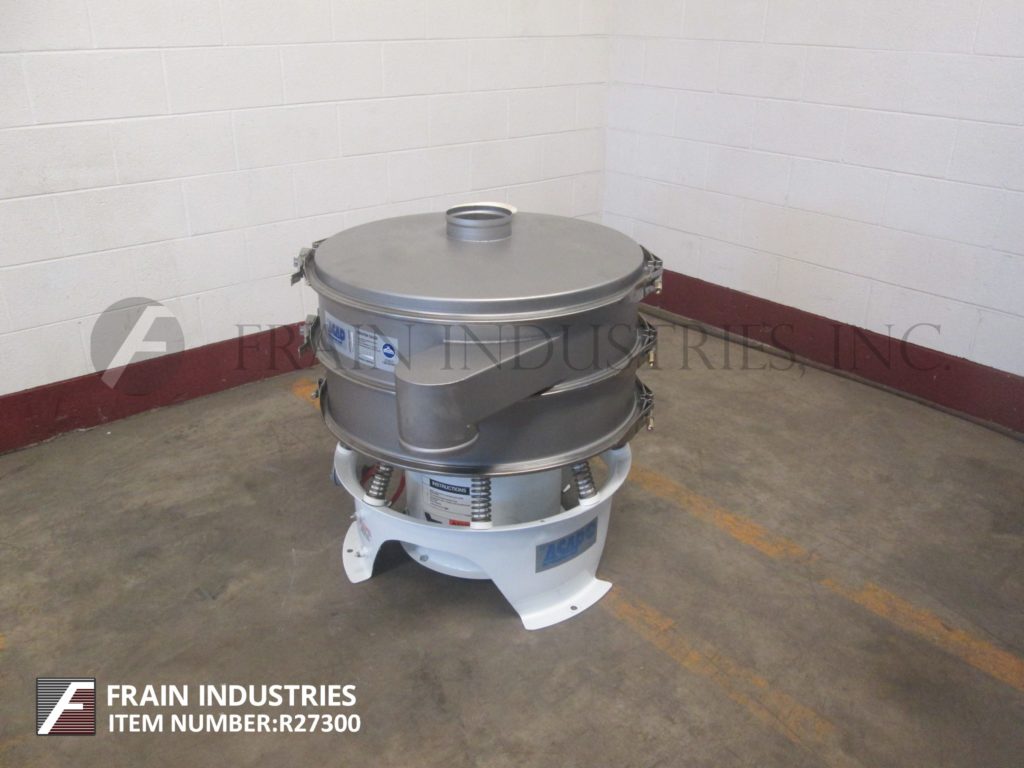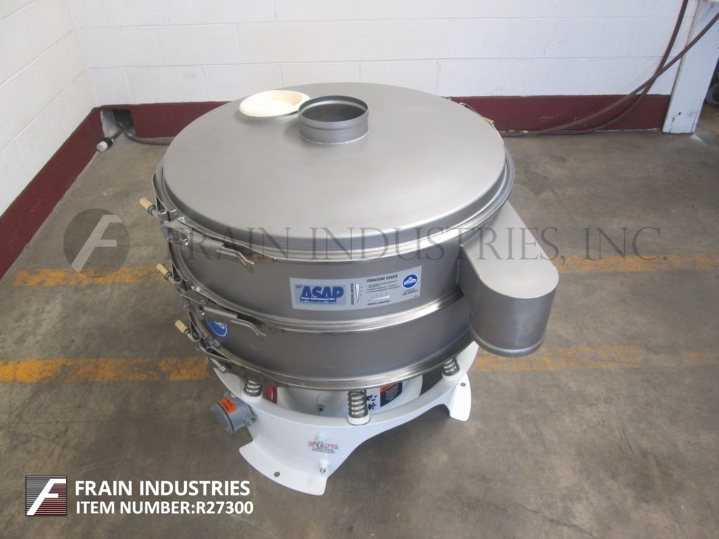 返回所有设备Sweco, MX30S66LKWC型,30"直径,单分离振动筛。每小时的量-取决于材料,应用和机器配置。配备(2)30"直径x 6"高不锈钢分离部分和1个屏幕(更换部分每应用)。每个甲板有一个9”长的排气口与6”直径的排气口。地面放电间隙;顶部23英寸,底部16¼英寸。顶盖有6"直径中心产品端口和5½"直径检查端口与插头。安装在振动式基座上。
