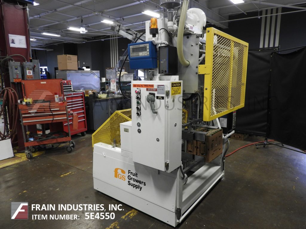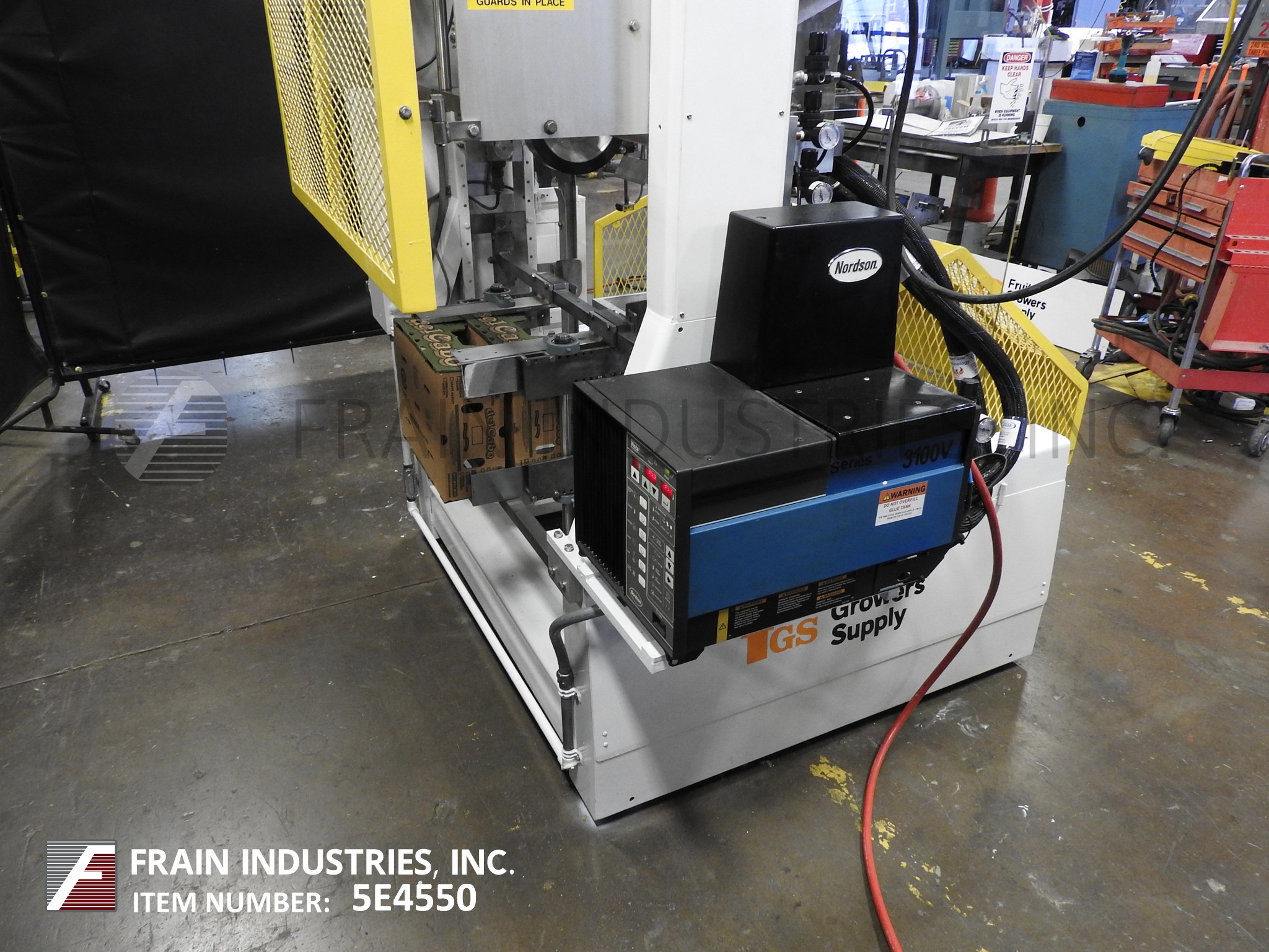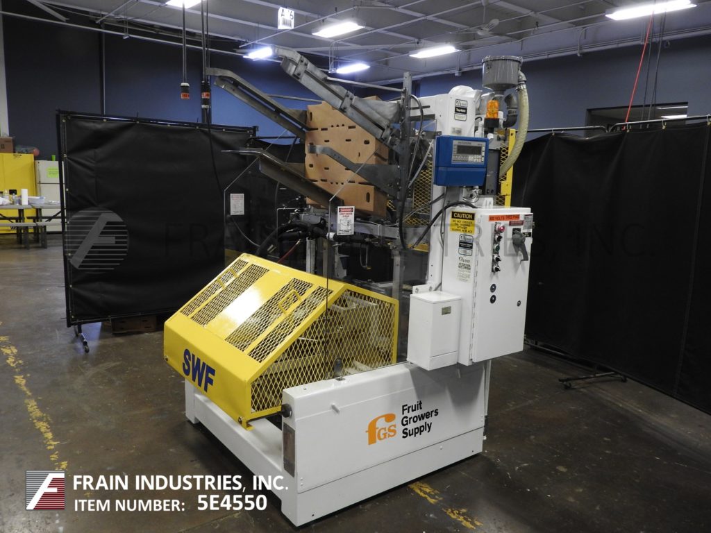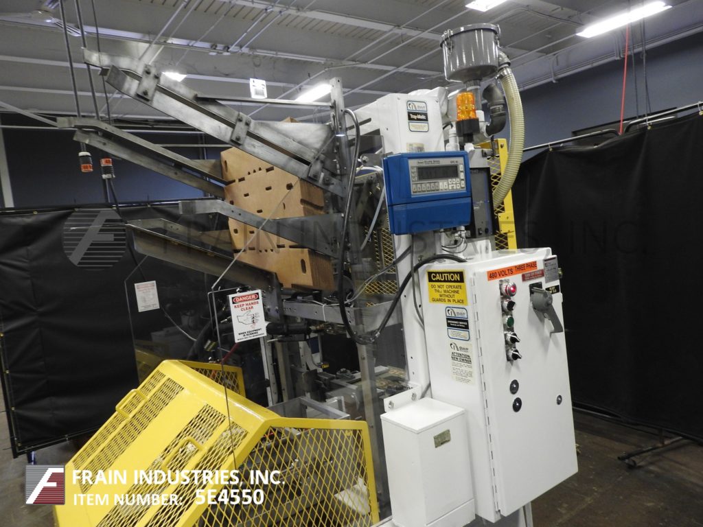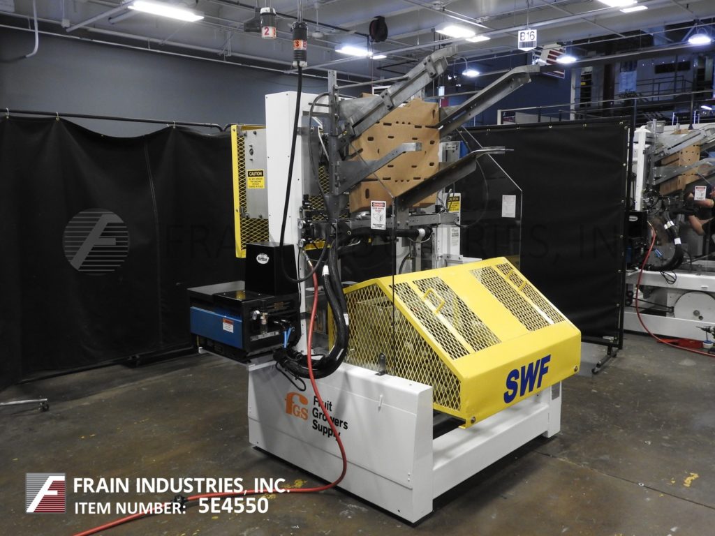 Back to All EquipmentSWF Model 1T4, automatic, tray former, hot melt glue sealer rated from 10 to 40 trays per minute – depending on materials and application. Tray size range of: 7" to 34" in Length x 8-1/2" to 22" in Width x 1" to 12" in Height, and knockdown size range: 10-1/2" to- 37-7/8" in Length x 12" to 36" in Width. Equipped with 60" Long blank case magazine, with (6) suction cup recipicating vacuum pick- n – place, dual friction blank feed wheels, Nordson 2 gun hot melt glue system with pattern controller, vacuum pump, status light bar and cage style safety guarding. Mounted on heavy duty base frame.
