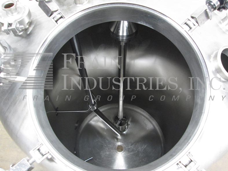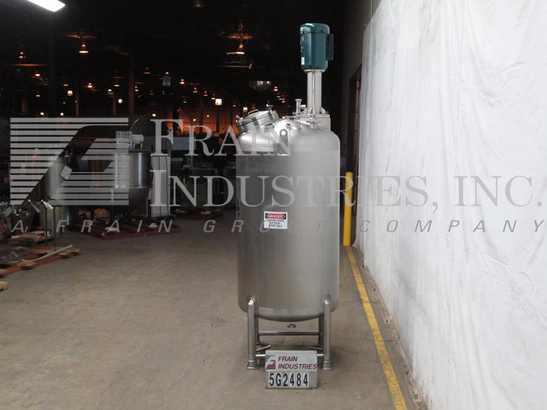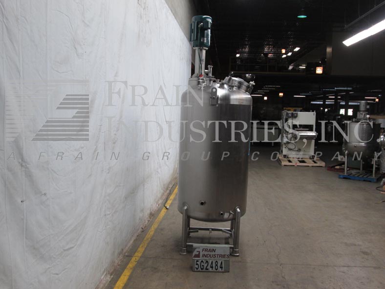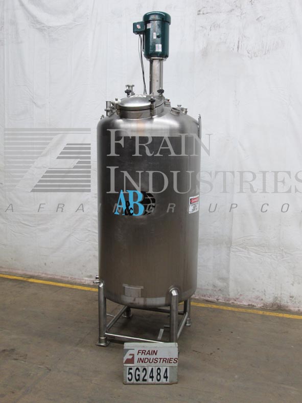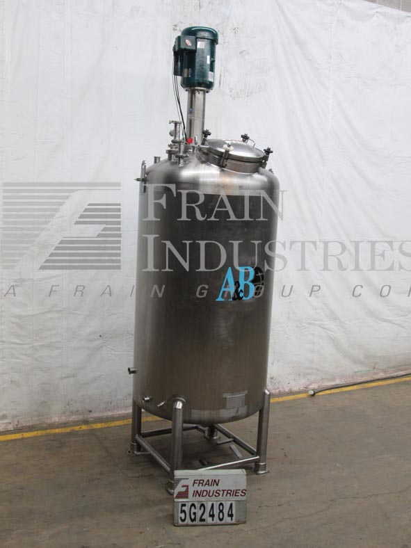 Back to All EquipmentA & B Process Systems, 450 Gallon, 316 stainless steel, vacuum rated tank. Vessel dimensions: 46" diameter and 75" Straight Wall. High shear agitator is driven by a 20 HP motor. Dome top contains (1) 18" man way with bolt down seal tight lid. (2) 2"ID/1.25"OD CIP spray balls, (5) 2.5"OD/2"ID sanitary fittings, (1) 4.75"OD/4"ID sanitary fitting and (1) 2.75"OD/1.75"ID port. Tanks sidewall has (1) 2.5"OD/2"ID sanitary fitting, (1) 2"OD/1.5"ID sanitary fitting and (1) 3/4" threaded inlet. Dish bottom has (1) 4"OD/3.5"ID center outlet with 20" ground clearance. Unit is mounted on (4) stainless steel legs.