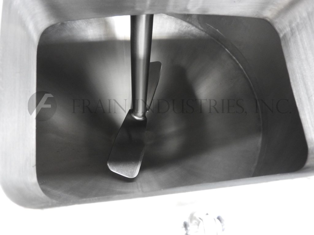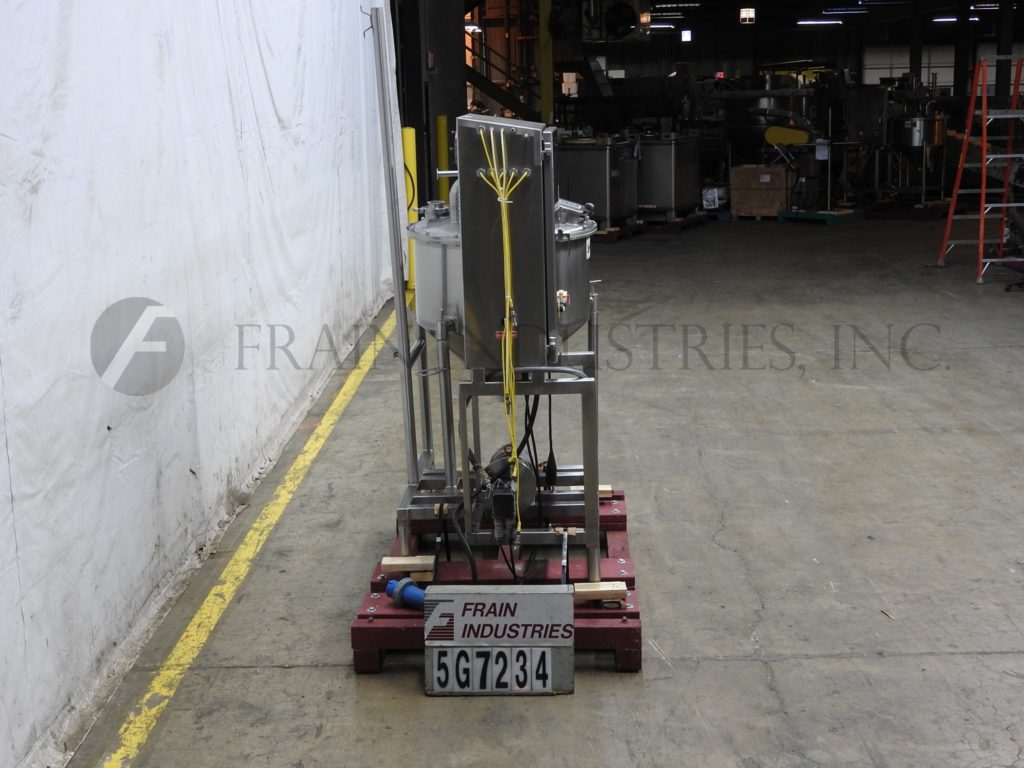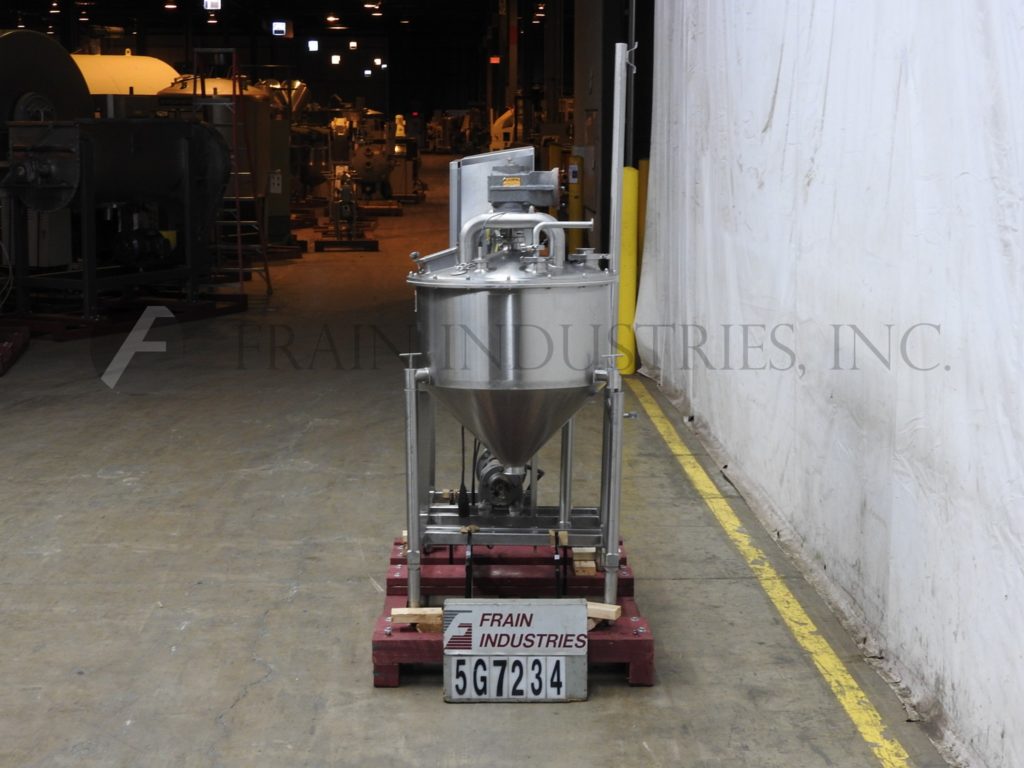 返回所有设备工业公司,50加仑容量,316不锈钢工艺罐带泵。容器尺寸:30"直径x 28"深,15"直壁和锥形底部。配有螺栓下盖,9" x 6"人孔,3/4马力顶部安装16"直径(2)桨柱搅拌器和3/4马力排出泵。控制箱包括启动和E-stop按钮。机组安装在不锈钢底座框架上。