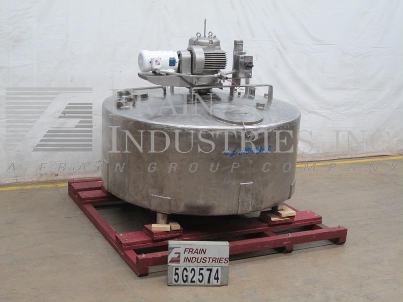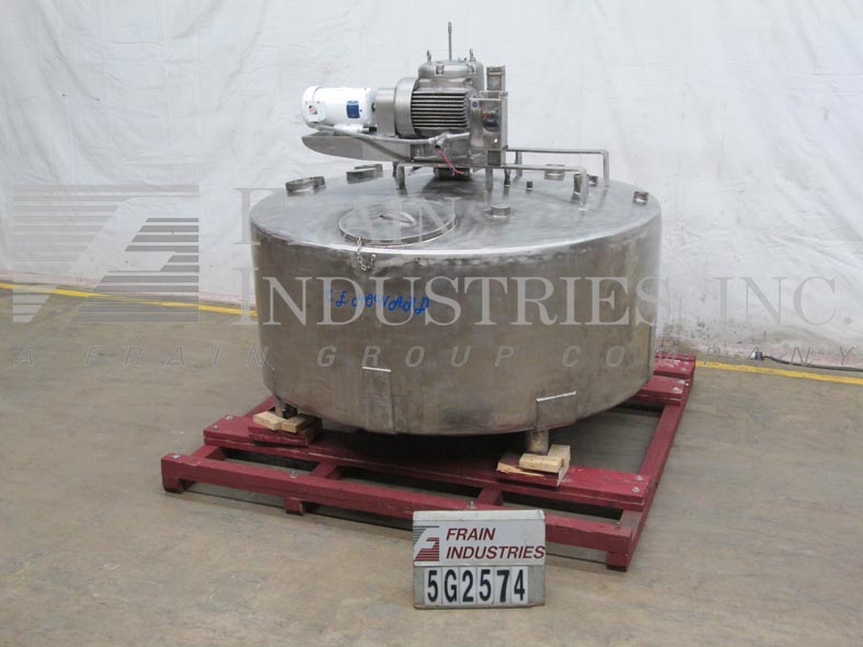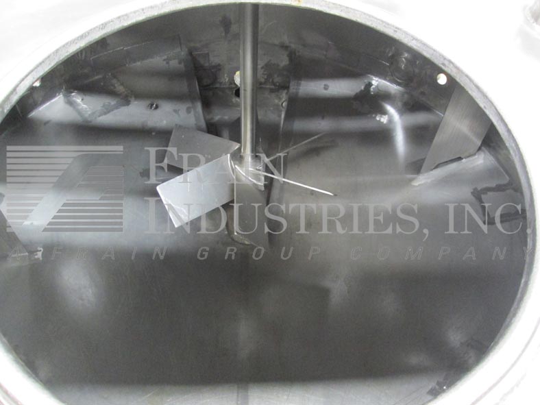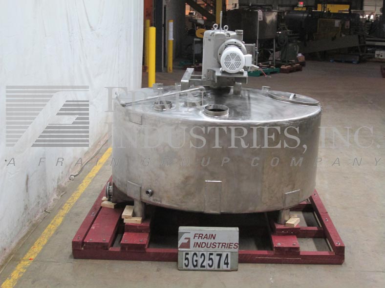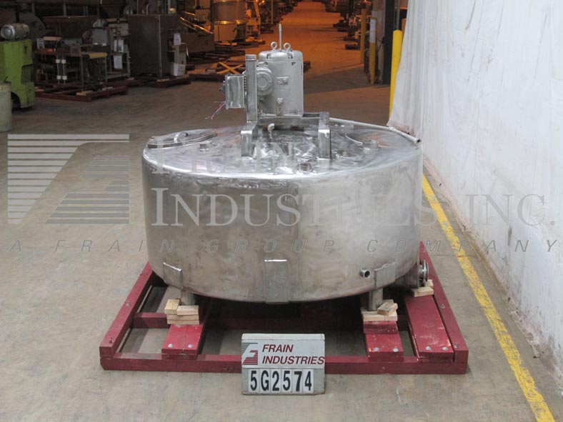 返回所有设备ce霍华德,800加仑,304不锈钢,单壁水箱。84"直径x 34"直壁。配备了一个5马力驱动单一运动24英寸直径六桨支柱式搅拌器。该容器有一个圆顶顶部,(1)8”内径,(1)6”内径,(1)4”内径,(1)3”内径,(2)2¾”内径开口。(3) 3/4英寸螺纹进口。(1) 3½”外径/2¾”ID三卡箍连接件以及(1)19”直径人工方式,可提起盖子。井壁有(2)2½”OD/1¾”ID三卡箍端口。斜面底部有(1)压力表和(1)直径8英寸的六螺栓式法兰排放,地面间隙18英寸。安装在(4)不锈钢支腿上。