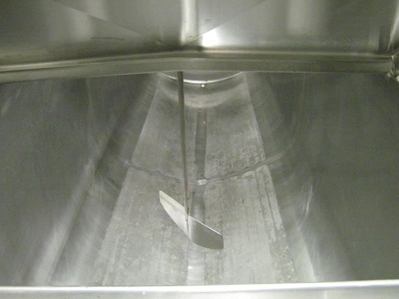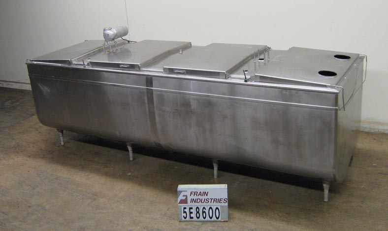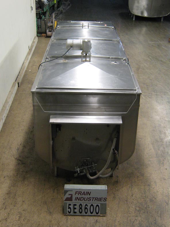 返回所有设备1400加仑,水平,304秒,低压水夹套冷却罐。有一个168“l x 48”w x 42“d内尺寸产品室,有四个32”l x 48“w翻转盖,一个有两个7”外开口,带顶部安装的桨式搅拌器,以及三个1-1/2“顶级港口,全套夹克有两个1”OD侧底冷水夹克端口,带有关闭阀门。倾斜底部有2个“外部底部底部放电,带有三层阀门和9”落地间隙,安装在八个S / S腿上,矩形结构在小地板区域提供最大容量