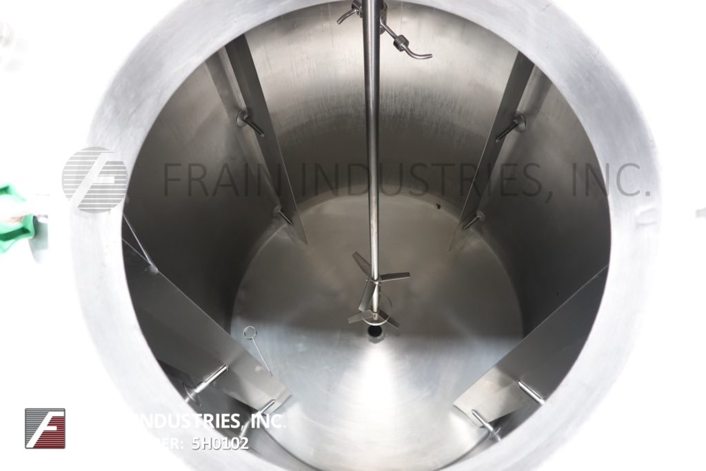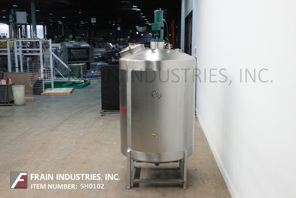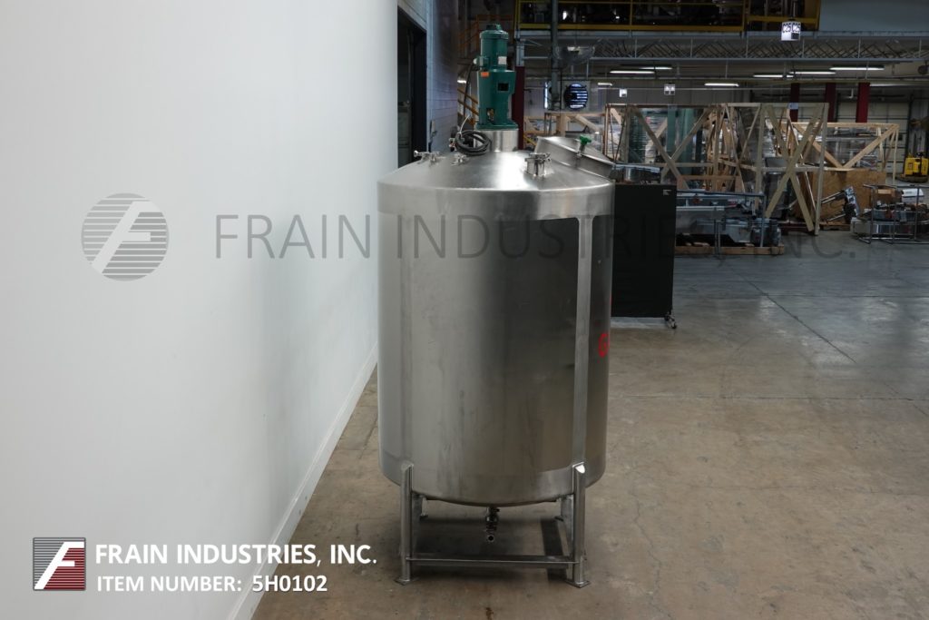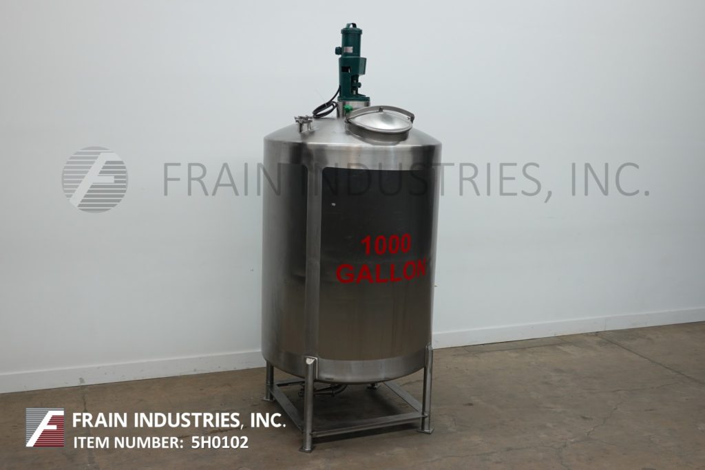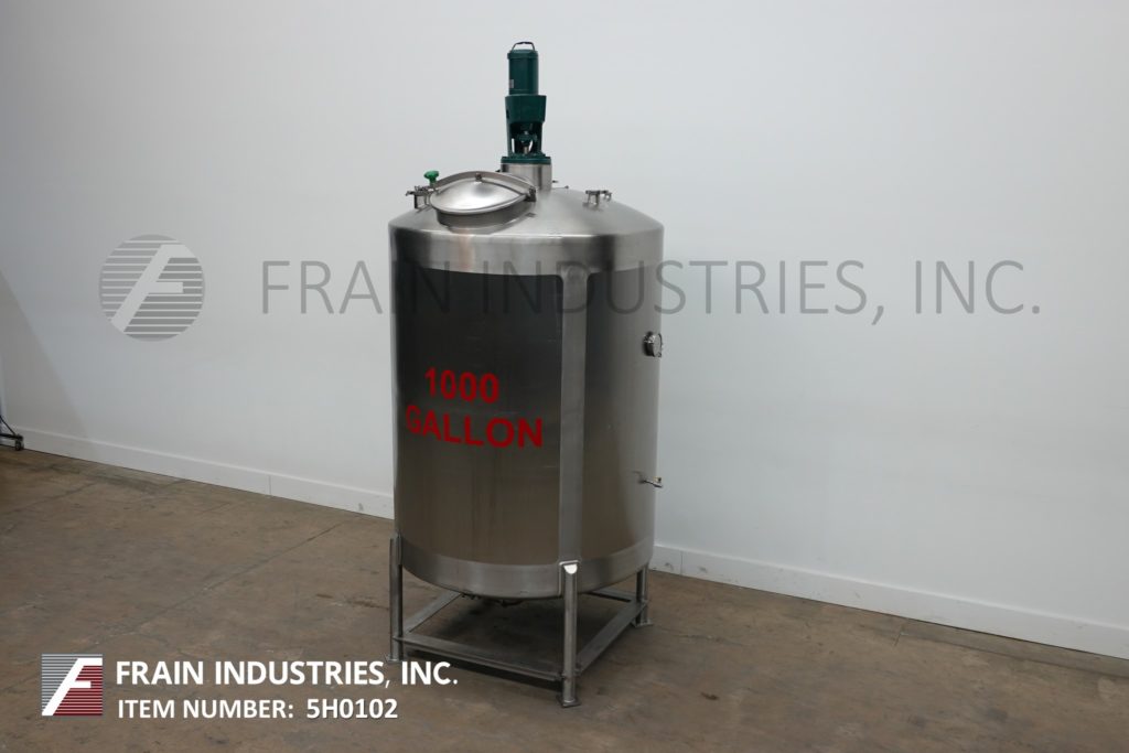 返回所有设备1000加仑容量,316不锈钢单壁罐。容器尺寸:60"直径x 74"直壁圆顶顶部和碟形底部。配备一个20英寸直径的人孔,(4)6英寸宽的挡板和0.65马力顶部安装的支柱搅拌器。单元安装在(4)管腿与3½“外径/ 3”ID三夹式底部放电与14“地间隙。