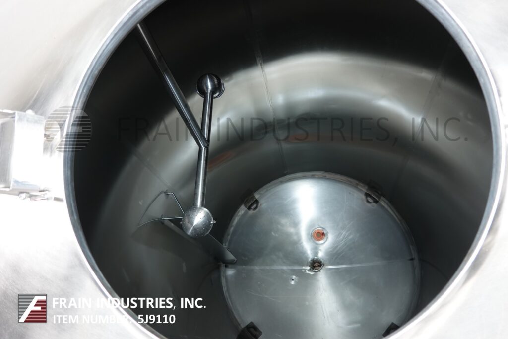 Back to All Equipment175 gallon, 304 stainless steel, skid mounted mixing tank with pump. Vessel dimensions: 40" diameter x 34" deep. Equipped with flip down lids, a 2 hp prop agitator, 3½"OD / 3"ID Tri-Clamp discharge and 3 hp centrifugal pump. Moutned on a stainless steel push cart.