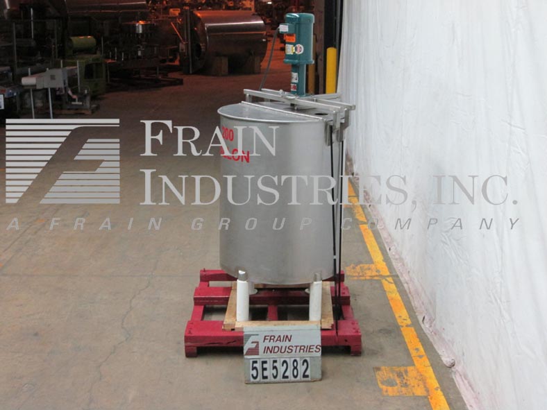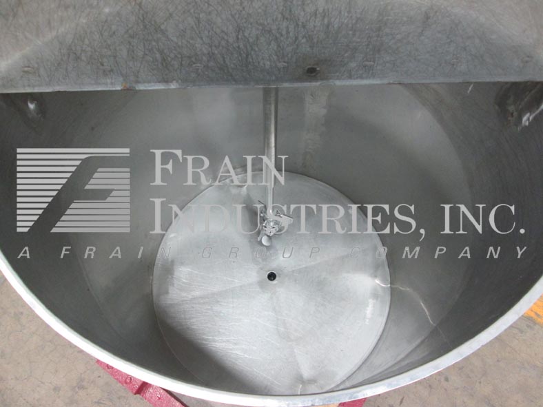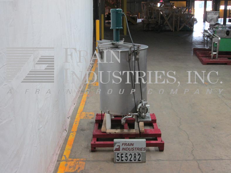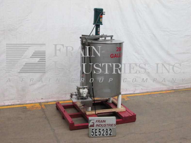 Back to All Equipment200 gallon, 304 S/S, single wall mixing tank. 38" dia x 47" straight wall, bridge mounted EMI Inc. emulsifier mixer, with 36" L x 1-1/2" diameter shaft, dual flip top covers, 2" diameter center bottom discharge with 16" floor clearance, has butterfly shot-off valve and a 7" dia Wilden diaphram pump with 2" diameter infeed / discharge ports.