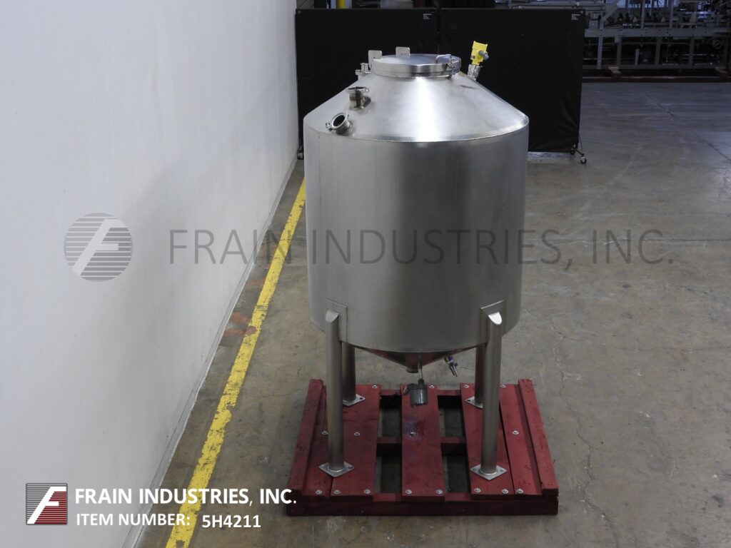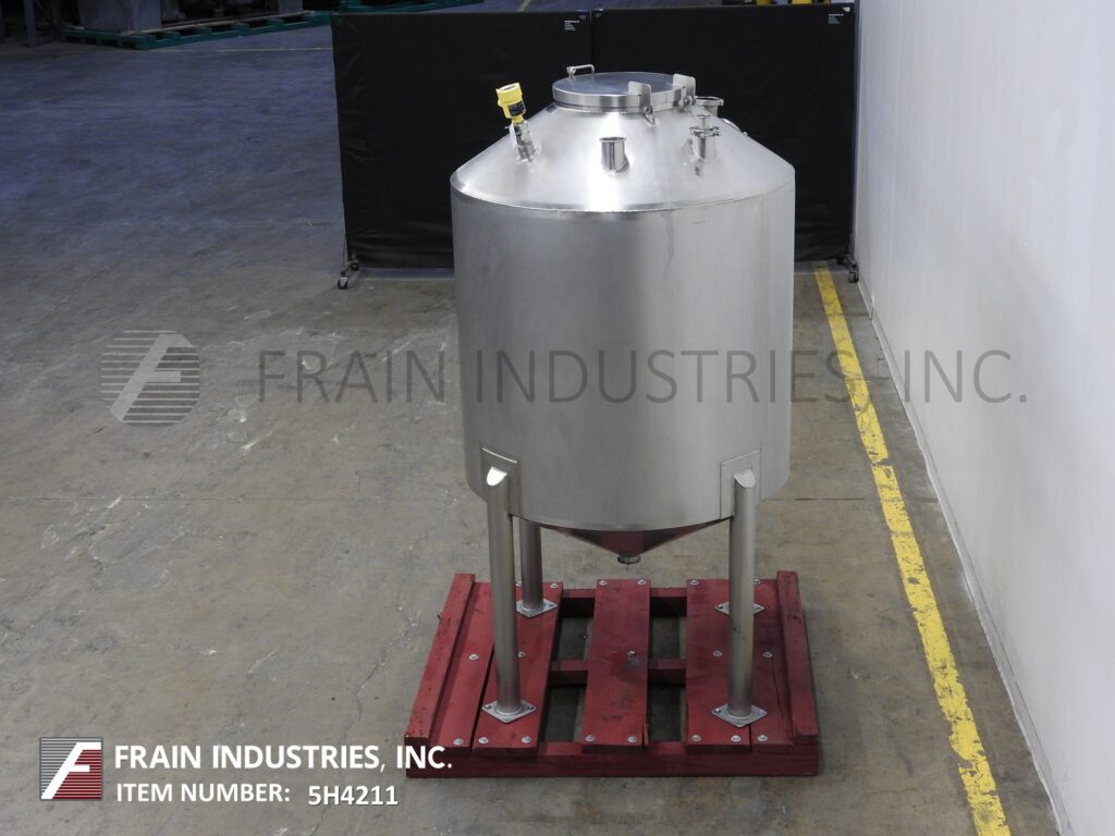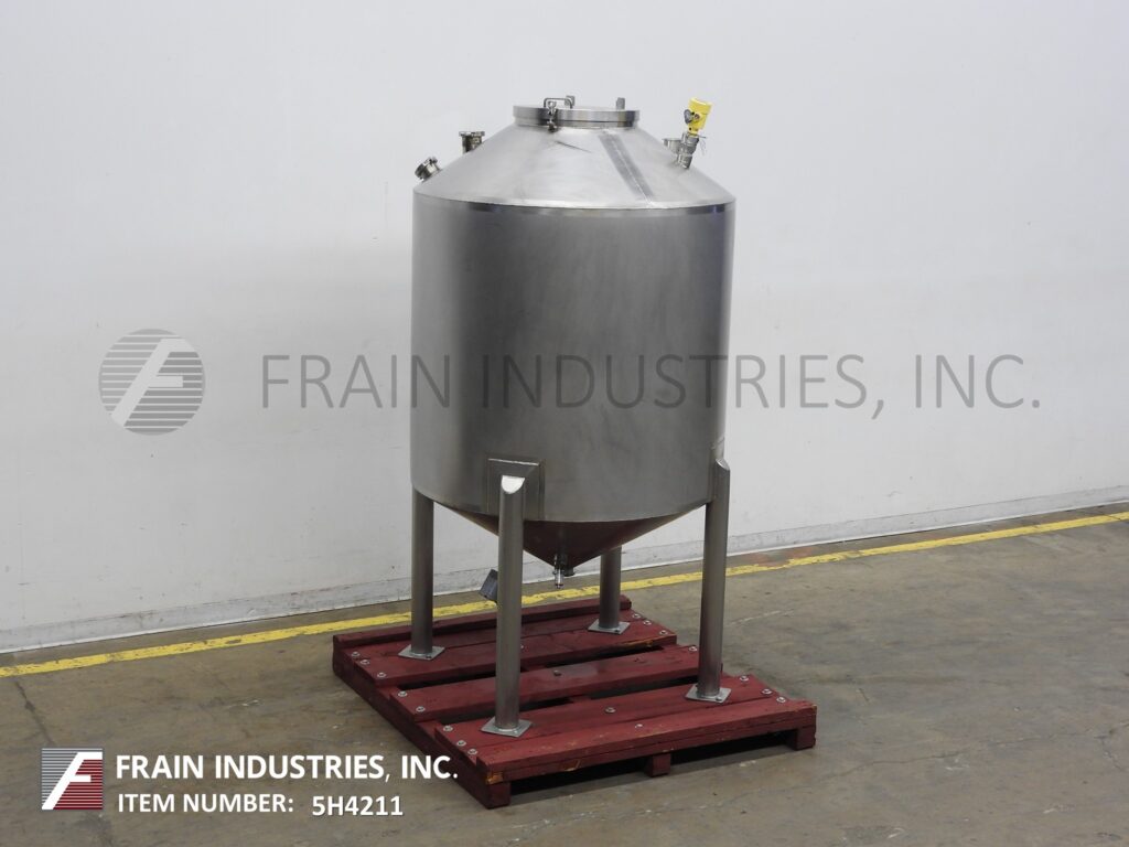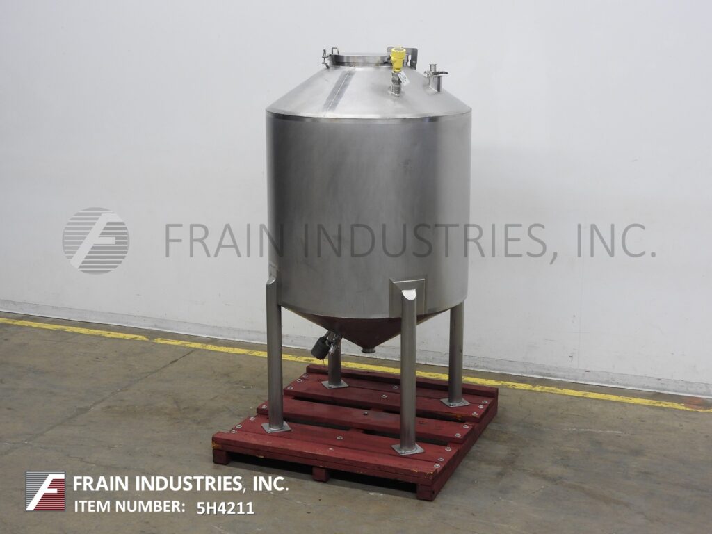 Back to All Equipment350 gallon, 304 stainless steel, cone bottom tank. Vessel Dimensions: 48" diameter x 65" deep. Equipped with an 18" manway, thermowell and 3½"OD / 3"ID Tri-clamp style bottom discharge with 16" ground clearance. Mounted on (4) legs.