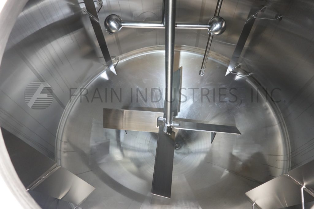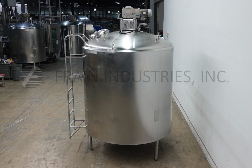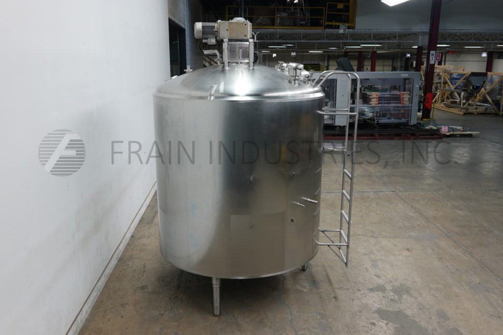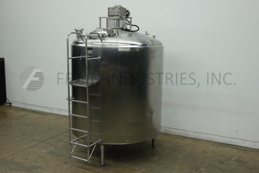 3,000 gallon capacity, 316 stainless steel insulated tank. Vessel dimensions: 80" diameter x 92" deep with a 88" straight wall and slant bottom. Equipped with a 18" diameter man way with flip bolt down cover, top mounted prop agitator, (2) CIP spray balls supplied by a 3½"OD / 3" ID Tri-clamp fitting, thermowell, fixed interior baffles and 3½" OD / 3" ID Tri-clamp style bottom discharge with 14" ground clearance. Mounted on (3) tube legs.