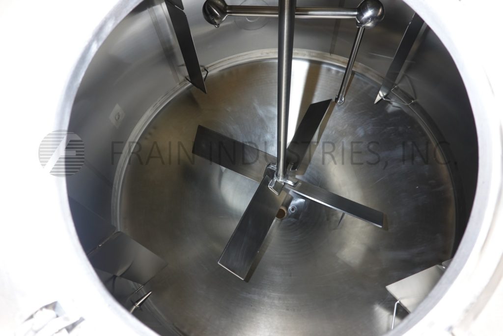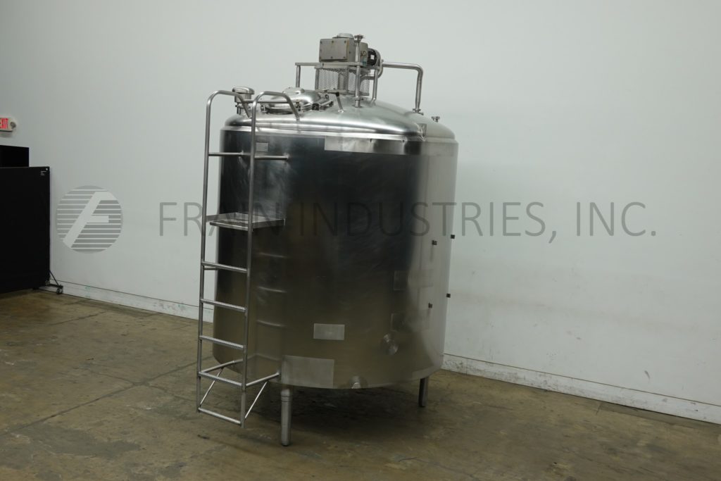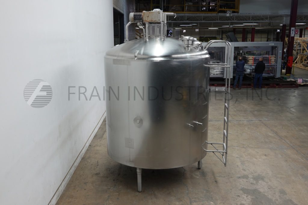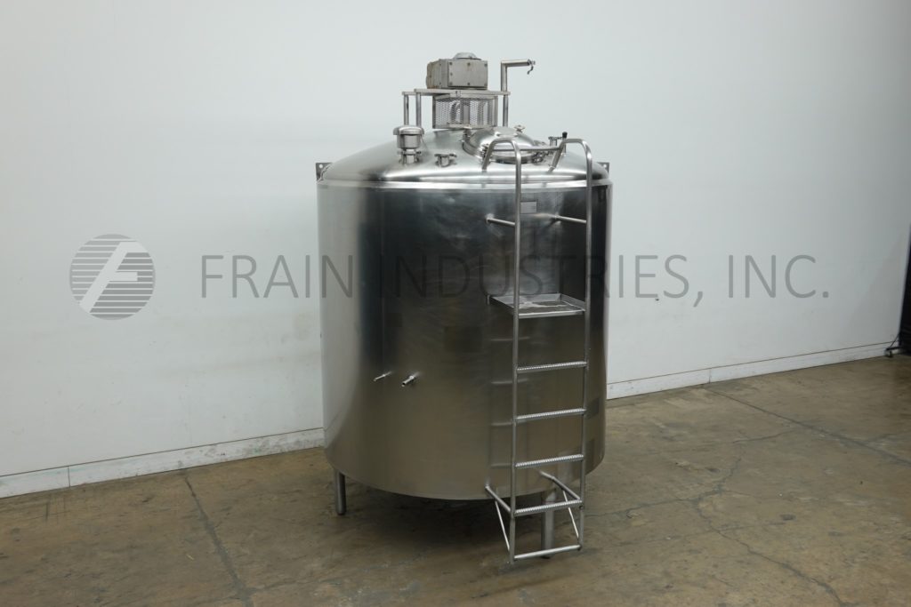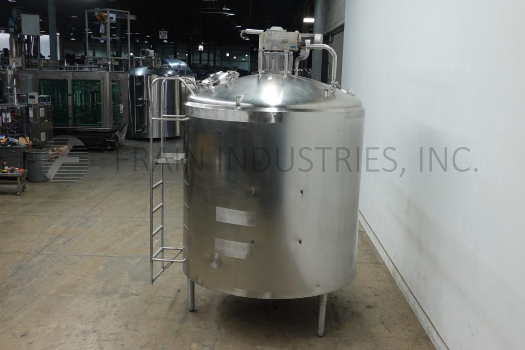 Back to All Equipment3,000 gallon capacity, 316 stainless steel insulated tank. Vessel dimensions: 80" diameter x 92" deep with a 88" straight wall and slant bottom. Equipped with a 18" diameter man way with flip bolt down cover, top mounted prop agitator, (2) CIP spray balls supplied by a 3½"OD / 3" ID Tri-clamp fitting, thermowell, fixed interior baffles and 3½" OD / 3" ID Tri-clamp style bottom discharge with 14" ground clearance. Mounted on (3) tube legs.