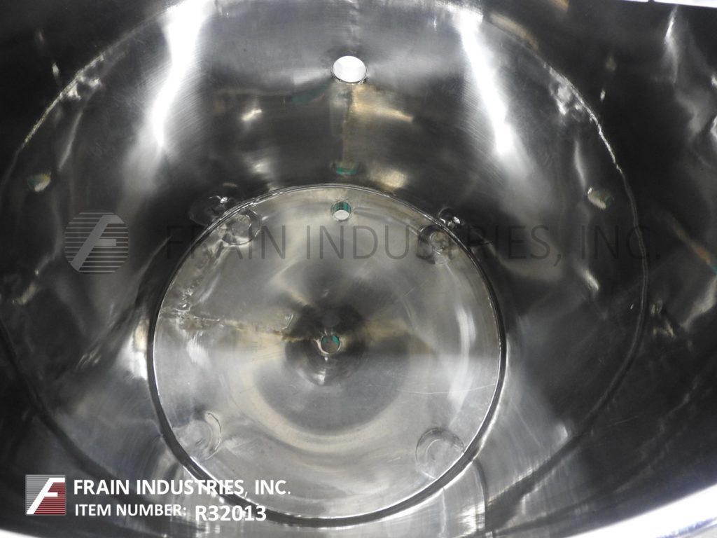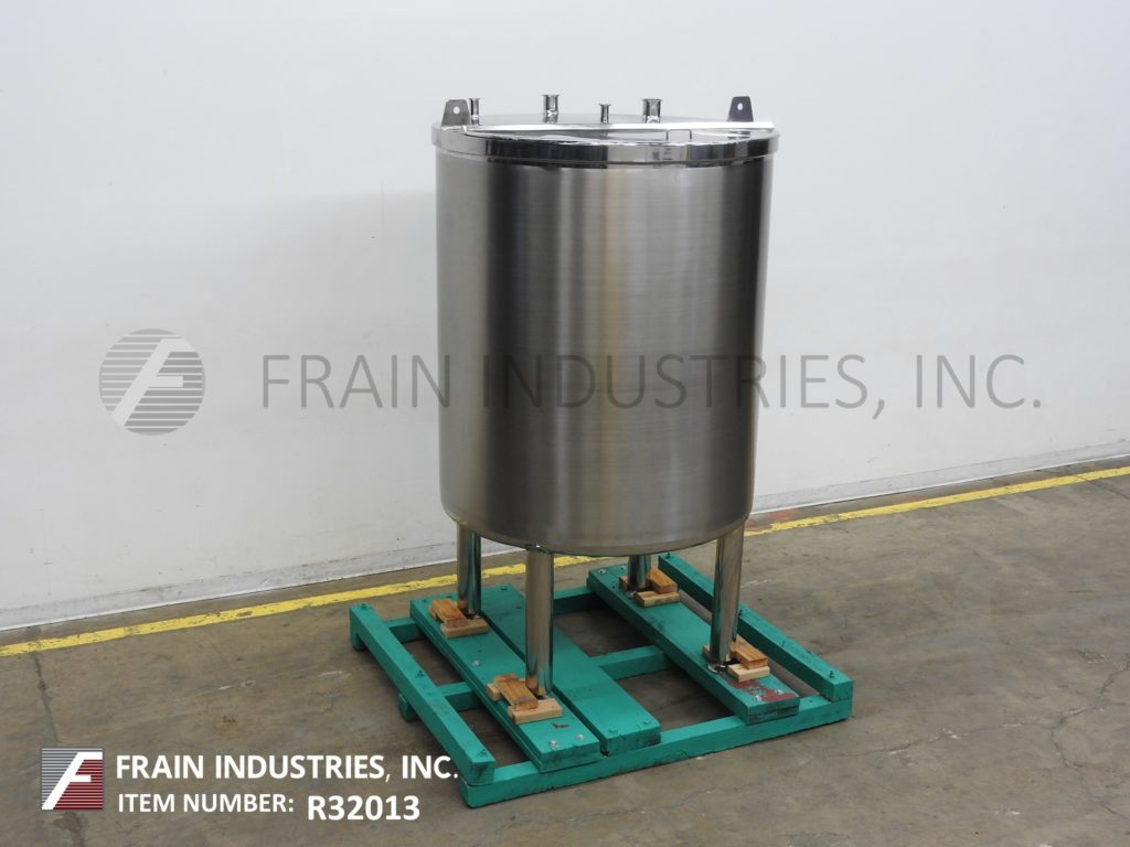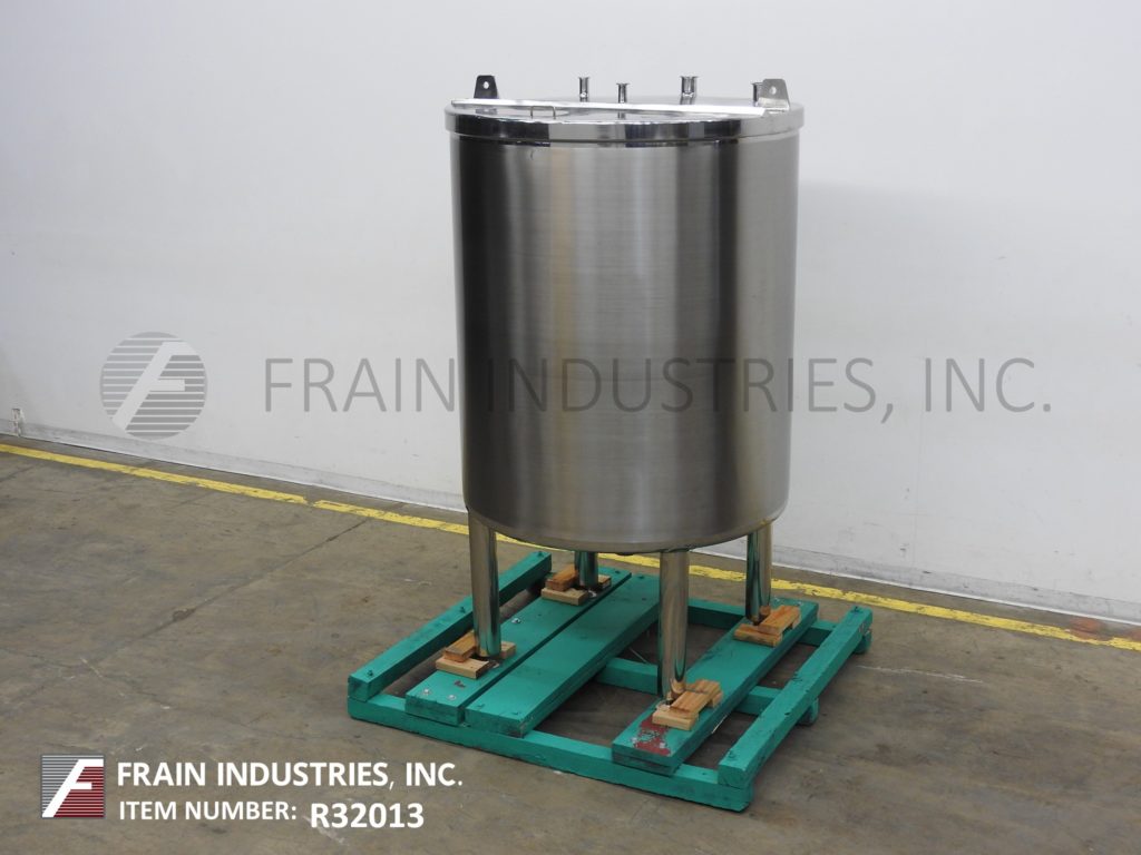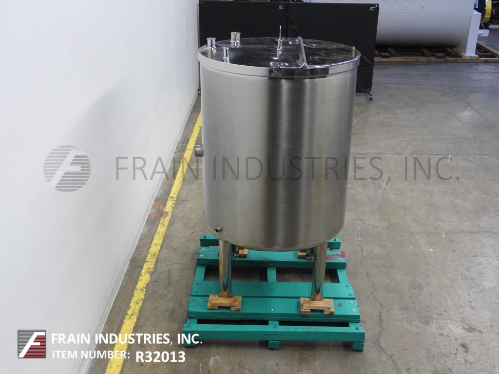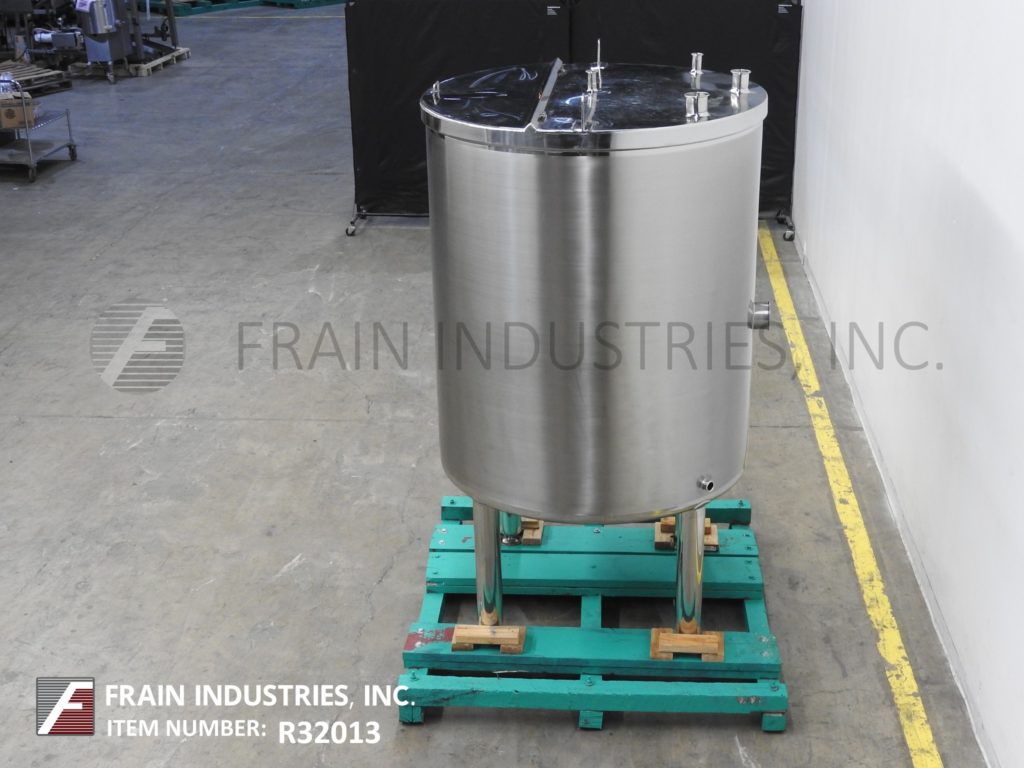 返回所有设备500加仑,304不锈钢,单壁水箱。容器尺寸:50"直径x 66"深,60"直壁。配备1/2翻转盖和3½“外径/ 3”ID三夹式中心底部卸料口与16“地板间隙。安装在(4)腿上。