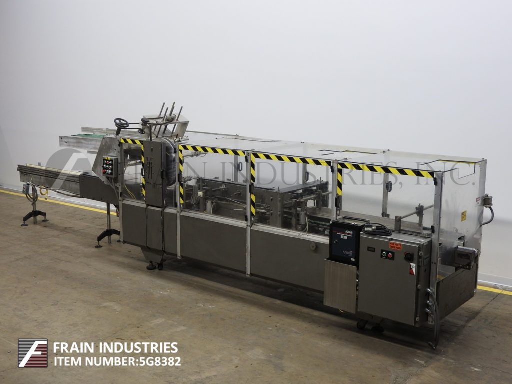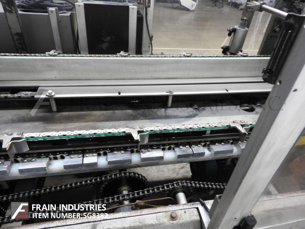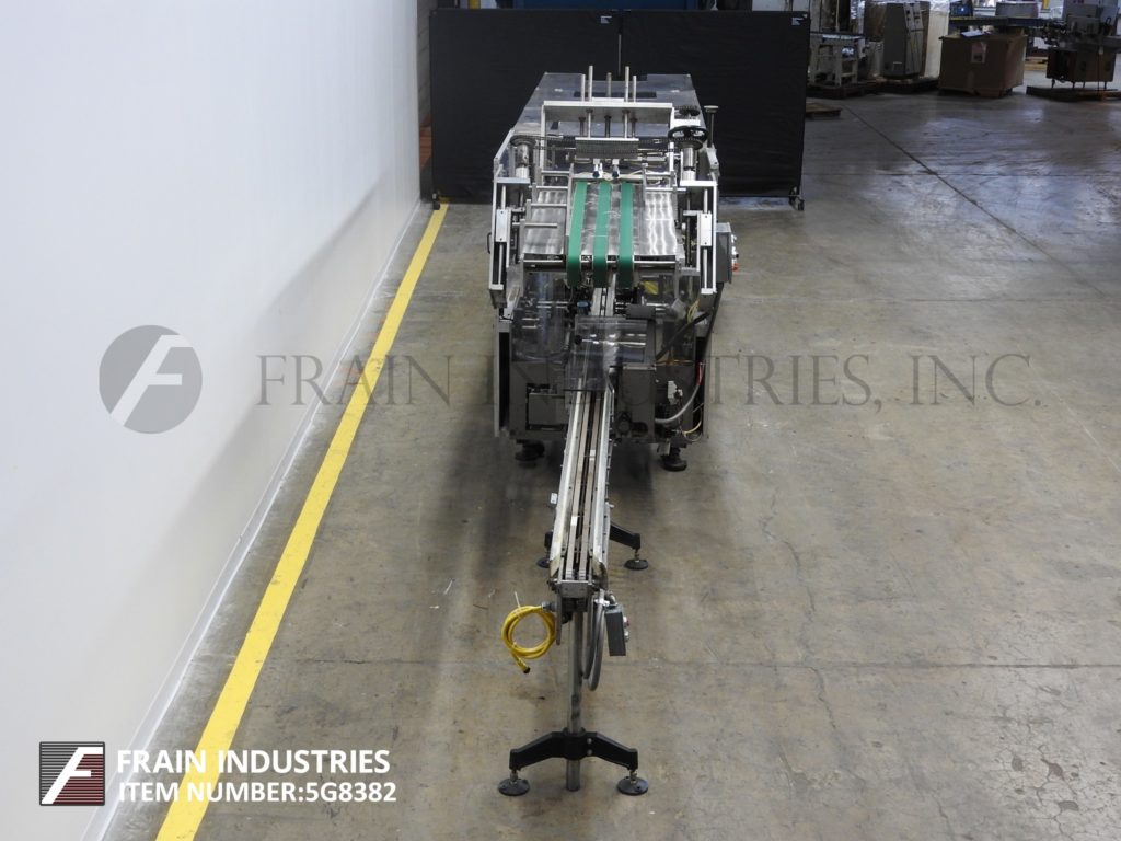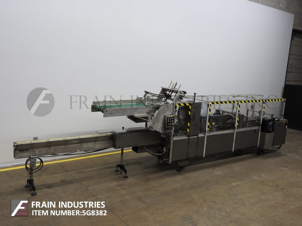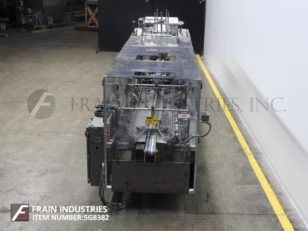 返回所有设备坦尼,510-280型,自动,连续,折叠,卷盒机。根据材料、应用和机器配置的不同,额定每分钟80至280箱。(1)链条装置设置在12"中心。配备2½"宽x 118"长产品在饲料输送机与单一36"长产品蜗杆螺丝,10"宽x 64"长动力(3)带空白纸箱杂志,(4)头旋转picn -place, 3¼"宽x 62"长架空输送机与旋转塔克,产品夹具装配与wrap plow关闭器,72“长的二次凸耳侧链分度输送机和3¾“宽x 22”长的产品卸货带式输送机。控制面板有启动/停止/堵塞复位的按钮控制和慢跑/运行的控制开关,手动/自动,真空开关。包括变速控制。安装在重型基础框架与安全防护。