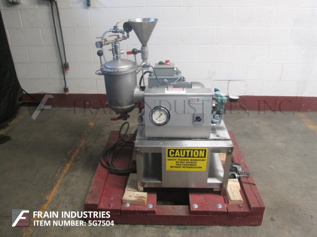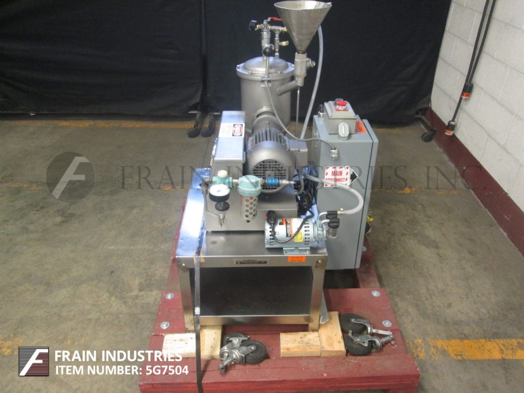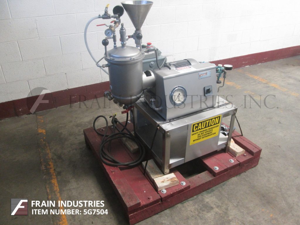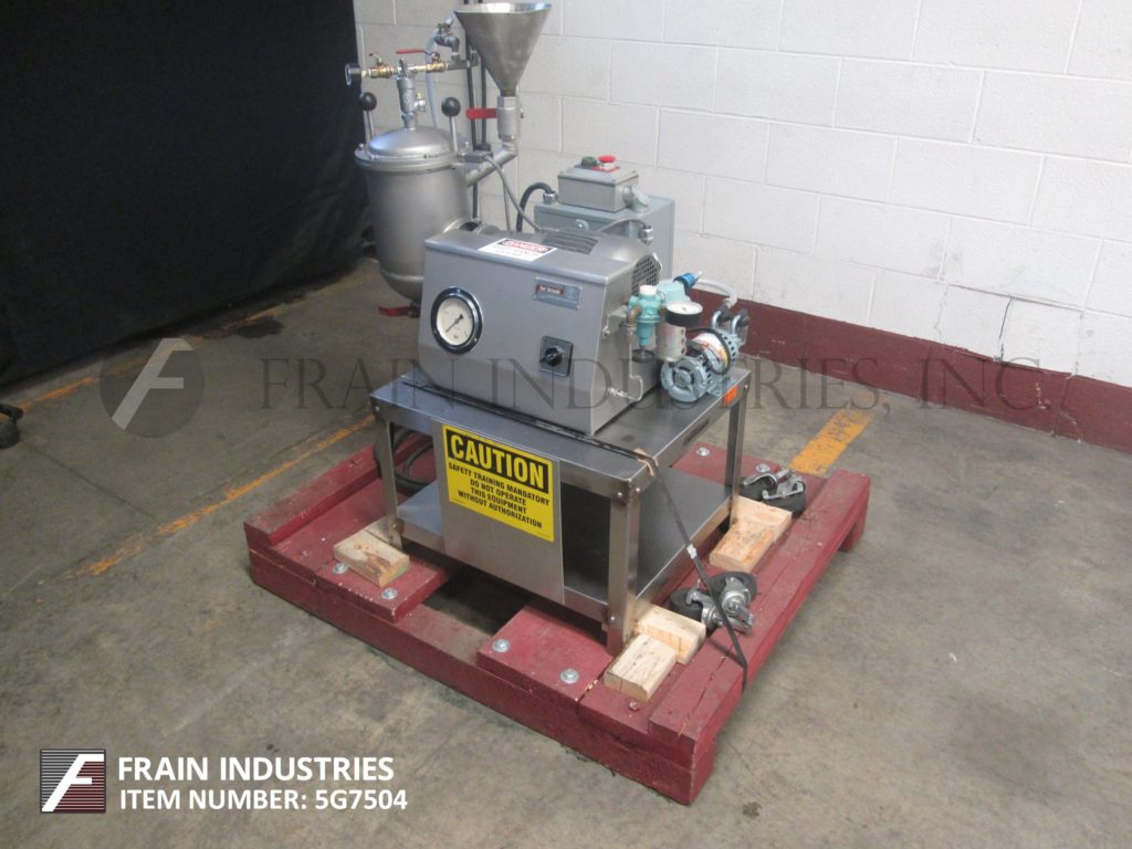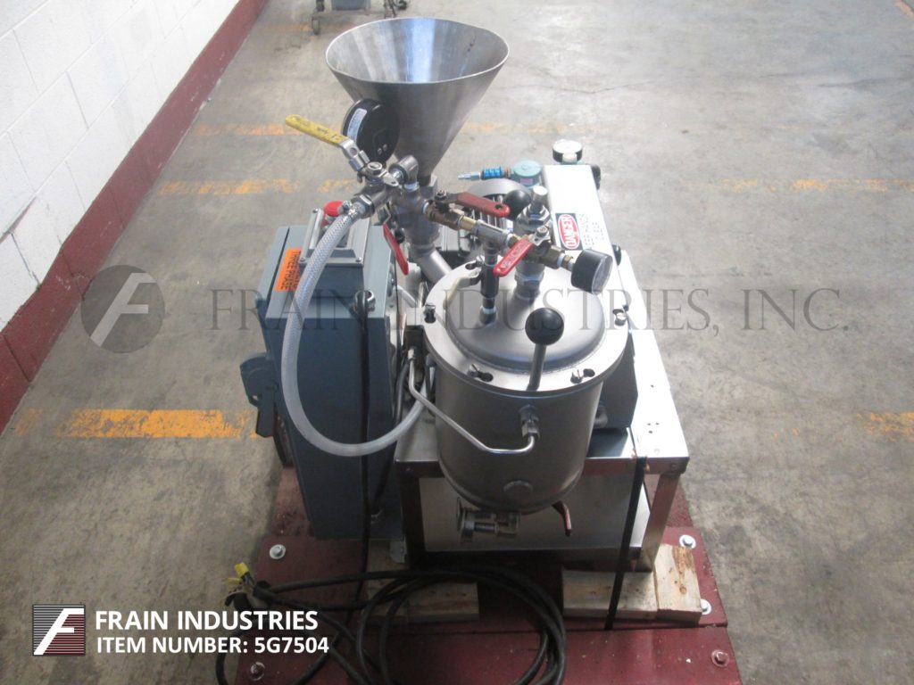 返回所有设备Ter Braak, 1½加仑,304不锈钢,夹套,实验室/先导压搅拌机。配备8"直径x 12"深层产品搅拌碗,螺栓向下提升盖子,搅拌式搅拌由1 / 2马力驱动,顶部1" NPT产品充电与球阀,3 / 4 " ID底部排放与球阀。安装在20“x 24”不锈钢底座框架。