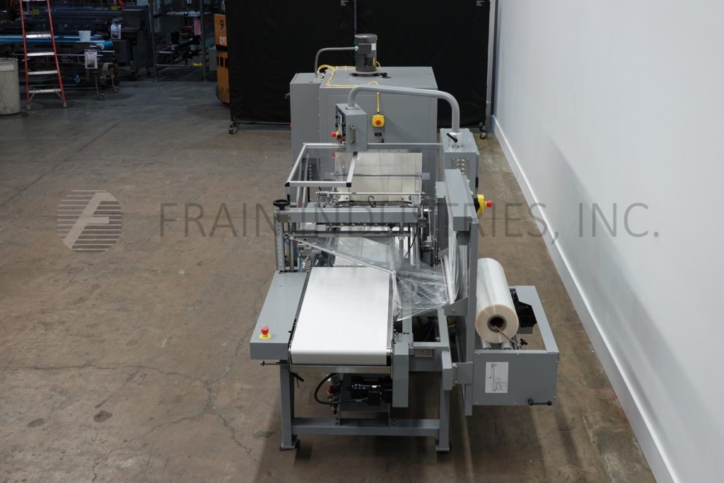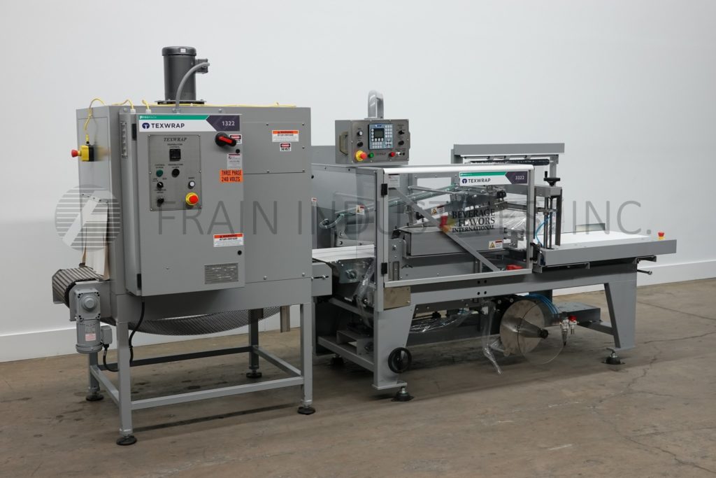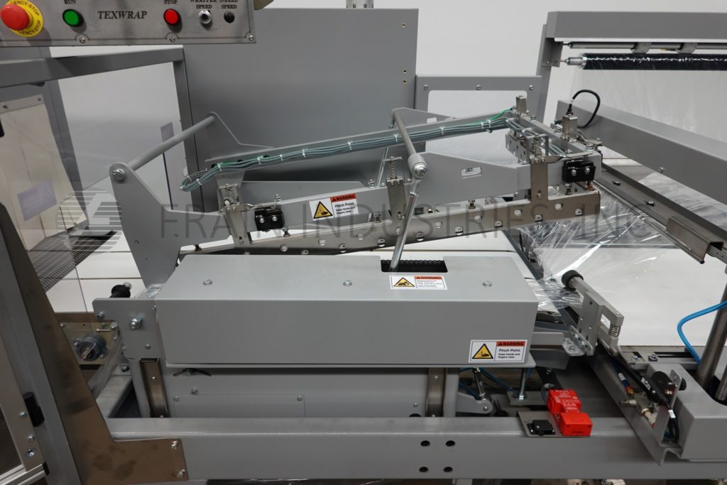 Back to All EquipmentTexwrap Model ST-3322 /1322, automatic L-Bar sealer and shrink tunnel. Package size range: 2" to 32" in Length; 2-3/4" to 19.5" in Width; to 10.5" in Height. Equipped with 46" long x 19" wide in feed conveyor, 22" wide cross seal bar, 33" long side seal bar, closing conveyor with 3 neoprene belt (each 49" long x 6" wide), perf wheel, scrap re-wind and safety guarding. MicroLogix 1400 with swing arm touch pad and E-Stop. Film specifications: center fold film 6" to 28" in Width; to 15" in diameter