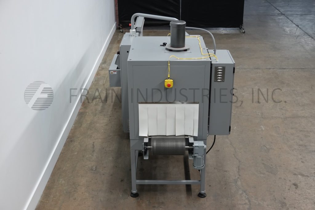 Texwrap Model T-1322 single zone shrink tunnel. Total aperture: 13-1/2" in Height; 22" in Width; 42" tunnel Length. Equipped with 15-1/2" wide x 66" long stainless steel mesh conveyor and top mounted blower. Controls for temperature (up to 400° F), conveyor speed and variable velocity air flow.