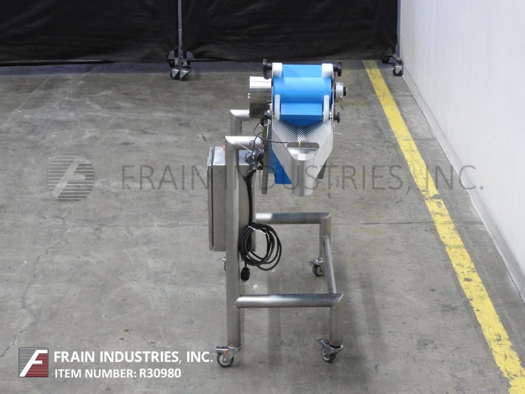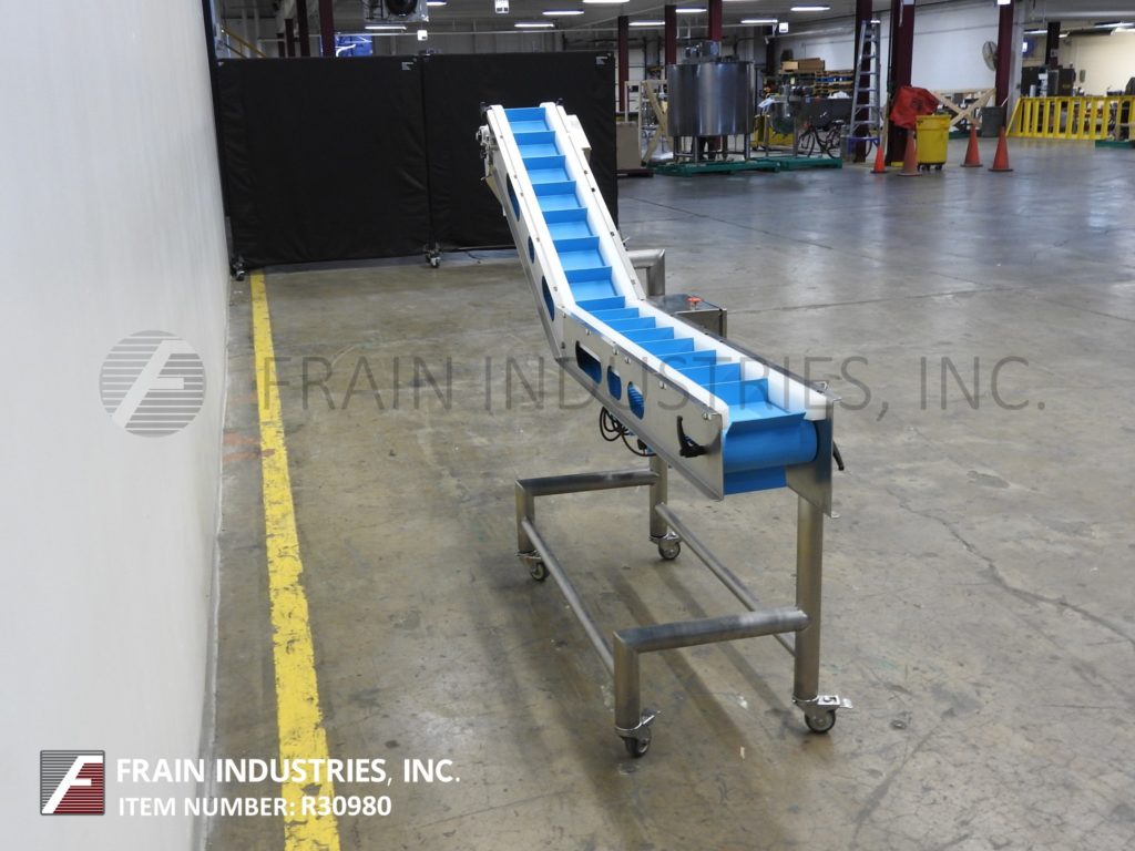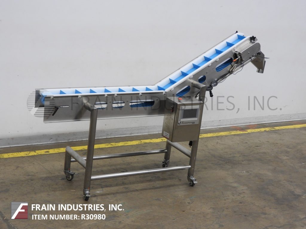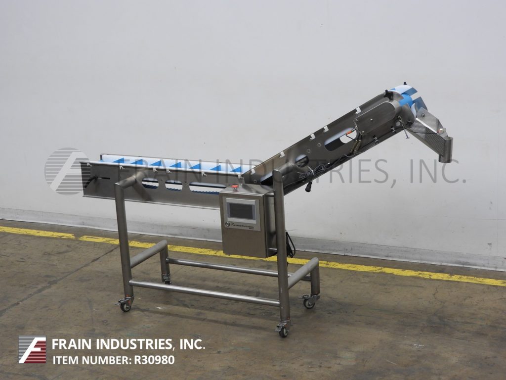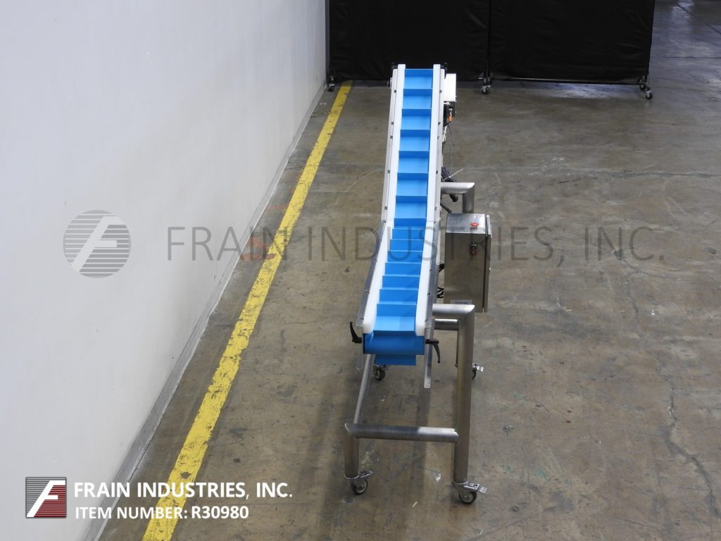 返回所有设备白金包装组,型号A71721,伺服驱动不锈钢斜带输送机。配备6“宽x 92”长的食品级皮带2“高夹板设置在6”中心。48”长的水平运行有36”的充电高度。44”长的倾斜段有60”的排放高度。控制面板与按钮启动/停止控制和触摸屏人机界面。安装在不锈钢框架与脚轮。
