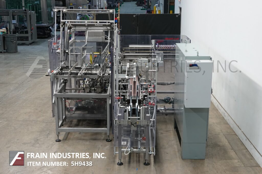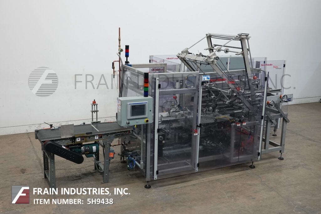 Back to All EquipmentThiele, Model ZB20A, Automatic, case and tray erector packer, hot melt glue sealer. Rated from 5 to 10 cases per minute – depending on materials and application. Case size range: 6" to 12" long x 10¾" to 19¾" wide x 2" to 6" deep. Equipped with (4) chains adjustable set on 33¾" centers with 5" high lugs, 36" long blank case magazine with (6) suction cup reciprocating vacuum pic n place, single push arm product loader, mechanical flap closers, Nordson hot melt glue system, case compression section Control panel has A/B PLC with A/B touch screen HMI. Mounted on heavy duty frame with interlocking plexy glass safety guarding and statis lights.