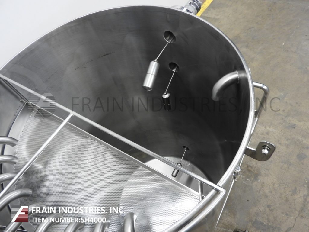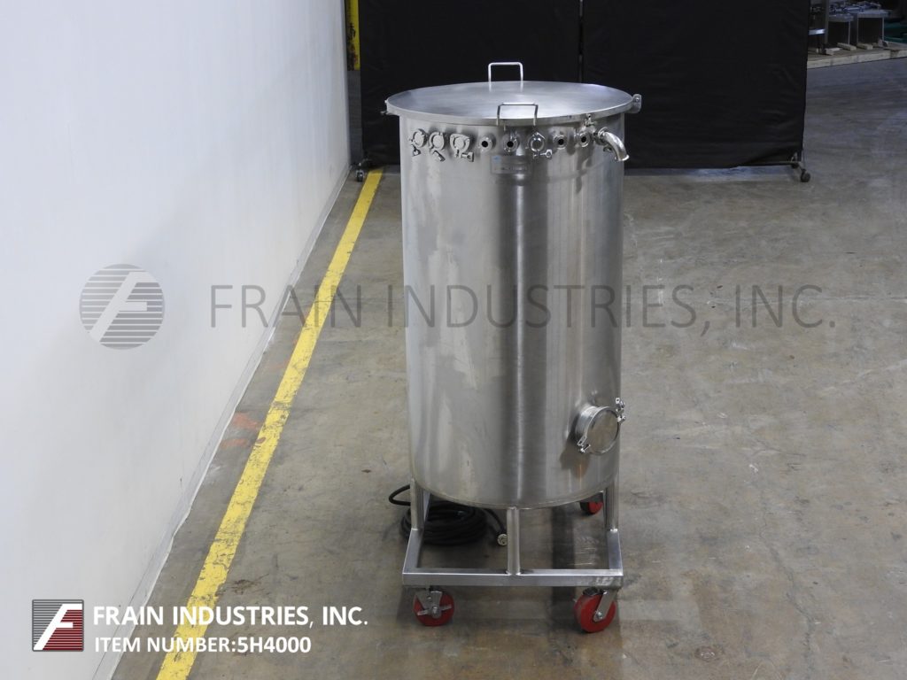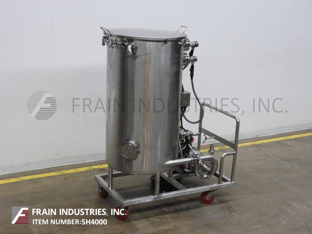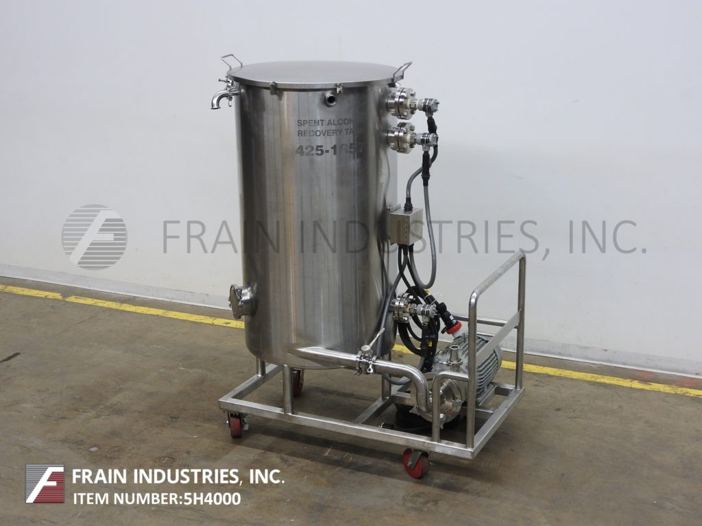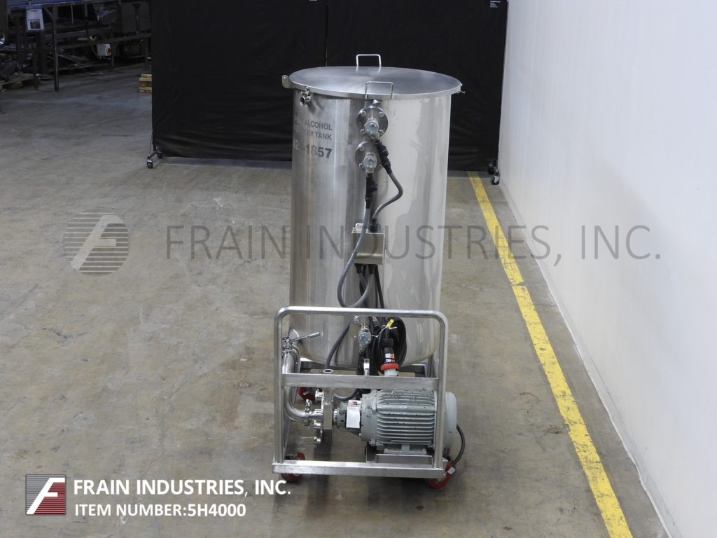 返回所有设备TSI, 150加仑,304不锈钢撬装便携式回收/再循环罐。容器尺寸:32"直径x 60"深,56"直壁。配备升降盖,(3)组件液位传感器,3½”OD / 3”ID三夹式底部排水口,地面间隙15”和3”ID / 2½”ID底部侧排放到Fristam, FPX型离心泵,配有7”直径叶轮,由10hp电机驱动。系统安装在重型不锈钢底座和脚轮。