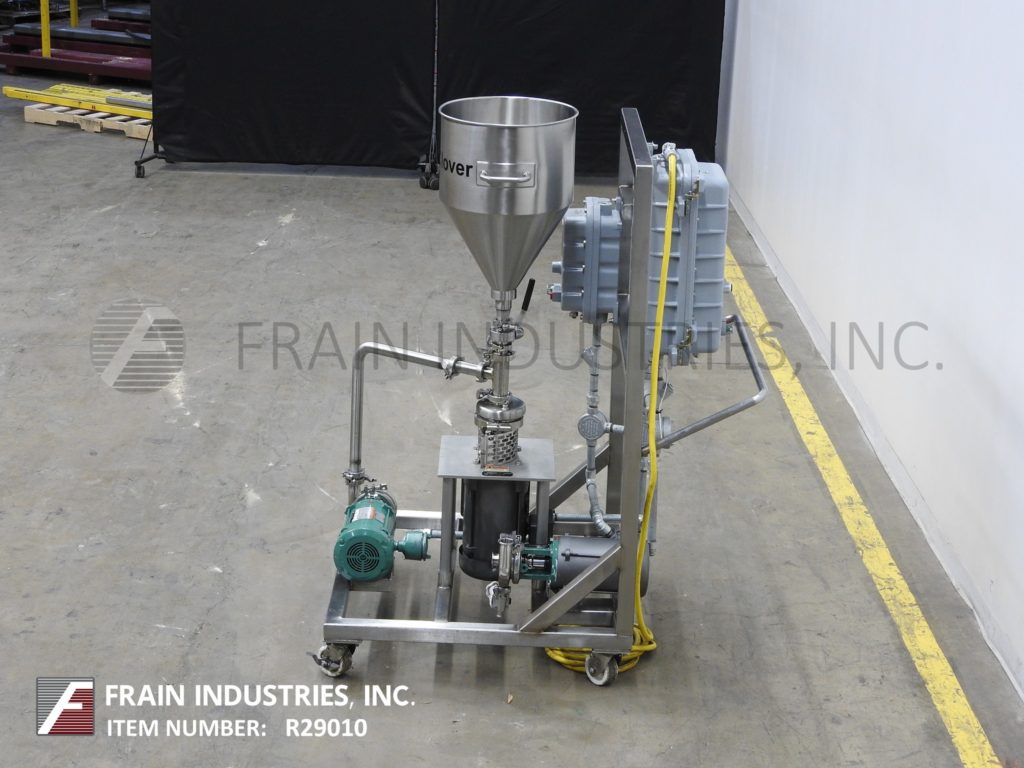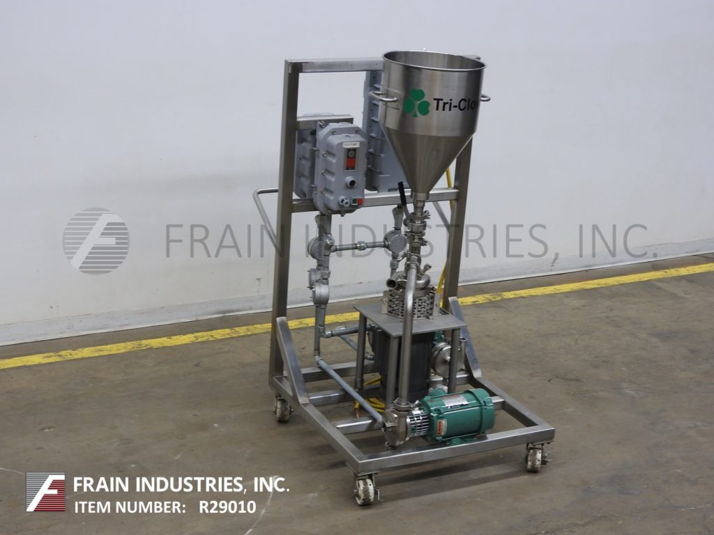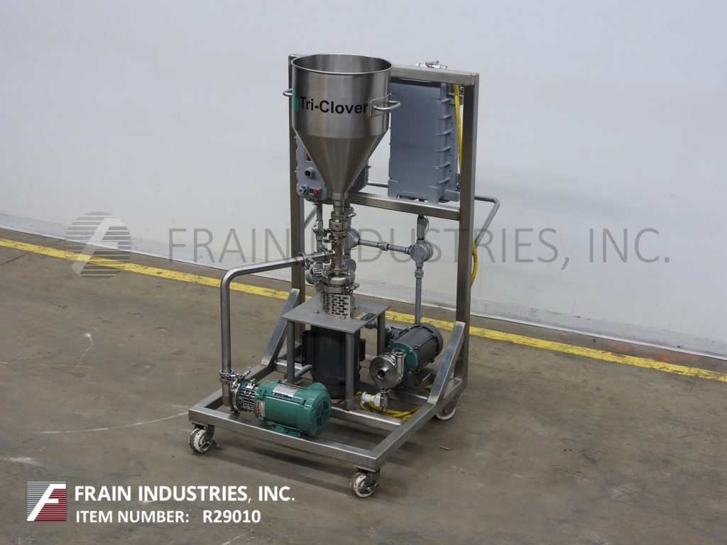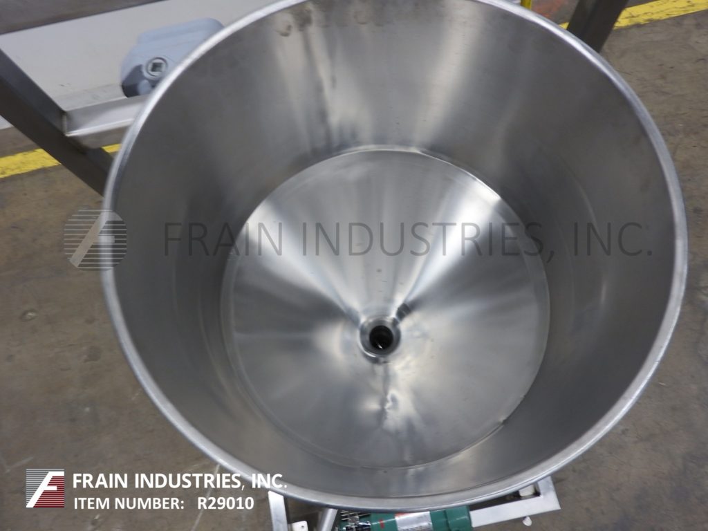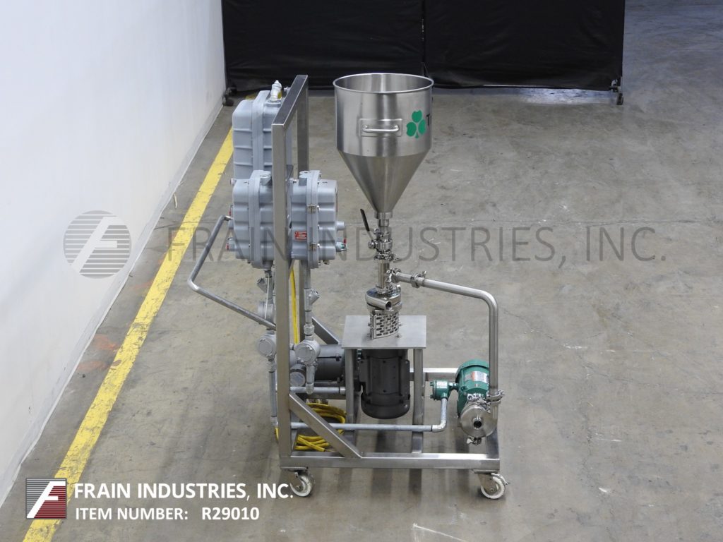返回所有设备Tri-Clover,型号F1114LMDG-MBV-B60-S,不锈钢三搅拌器,吸收率取决于材料和应用。配备16“od x 22”深漏斗风格不锈钢产品料斗,直径1.5英寸的产品电荷,1 HP离心液供应泵,5个HP底部混频器电机驱动和1 HP辅助/转移泵。控制面板按钮开始/停止并安装在不锈钢推车上。
