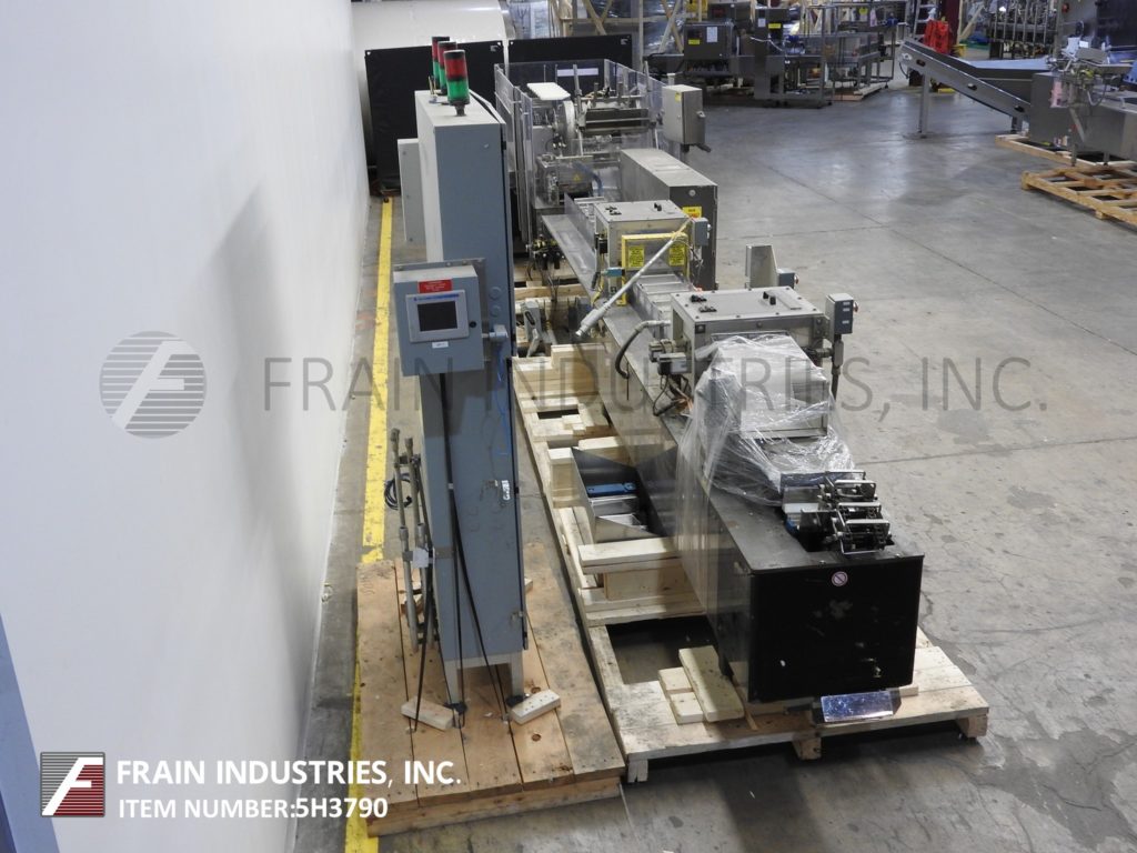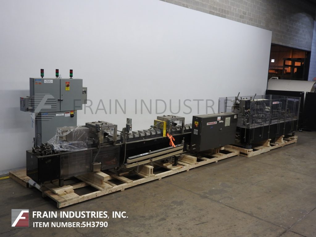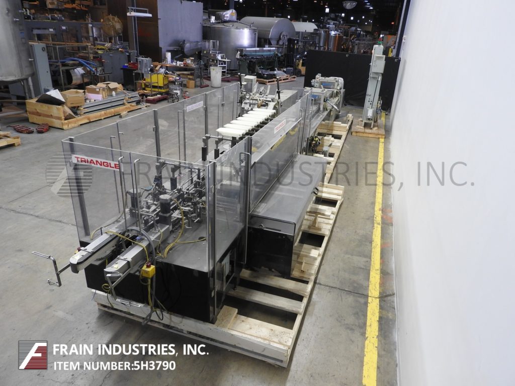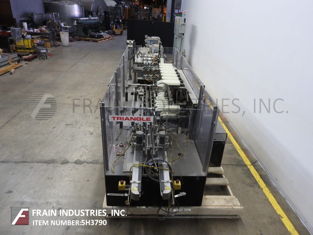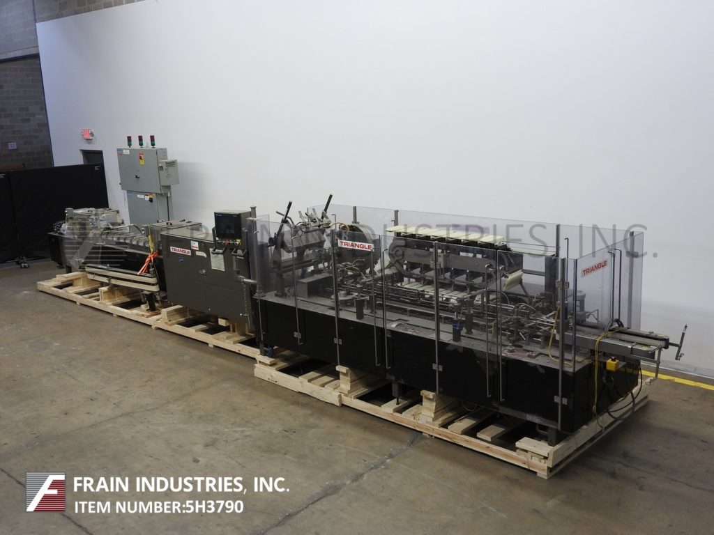 返回所有设备三角形cs - e2 -750型,自动,水平,连续运动,热熔胶盒盒数每分钟-取决于材料和应用。纸箱尺寸范围:按应用。配备190"长产品在饲料输送机与6"长x 3-1/2"宽x 11"深固定产品桶和2侧旋转袋给料机和砂子。72"长2带自动空白纸箱杂志,3头旋转pic n的地方,(4)链条可调系统设置在7-1/2"中心与5"高x 1"宽的凸耳,桶凸轮装载机,旋转顶部保持输送机,无产品/无纸箱探测器,诺德森热熔胶系统,主要和次要皮瓣关闭和28“长双侧皮带压缩和放电部分。控制面板有A/B CPU控制器与A/B摆动臂触摸板控制和面板视图与纸箱开/关,运行/慢跑开关,启动,停止和e-stop按钮。安装在重型基础框架与多水平腿和Lexan安全防护。