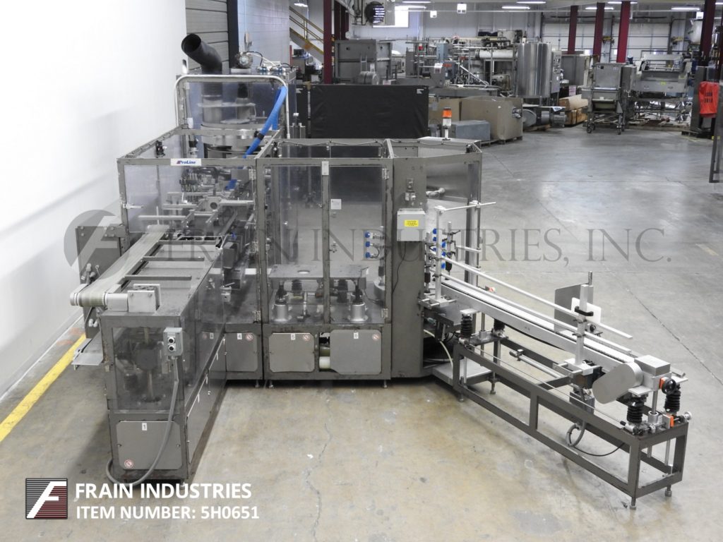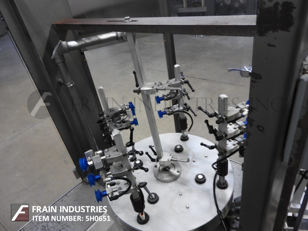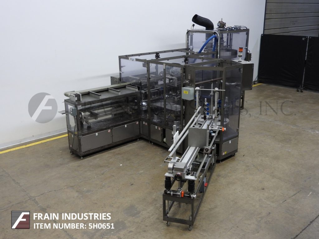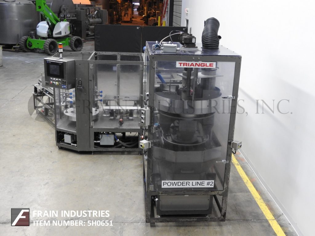 返回所有设备三角型脯氨酸系列,自动立式,热熔胶纸箱每分钟数量取决于材料,应用和机器配置。尺寸范围:每应用。配有2条固定在10"中心7"长链条;5-3/4”宽;4”深固定产品桶。72"长(2)链动力空白纸箱杂志,(4)头旋转挑选在地方,(2)链(4)5" ID口袋旋转产品填充系统与(4)8"长x 6-1/2"宽x 14"高不锈钢产品漏斗除尘系统和Seko量规。控制面板有A/B CPU,带有A/B面板视图和A/B变速驱动控制器,运行,慢跑,驱动速度,电源开关和无产品开关,启动,停止和e-stop按钮控制增加和减少产品按钮在纸箱的每一端。安装在重型基础框架与锁定安全保护。