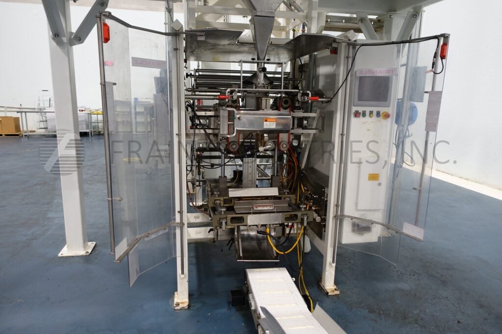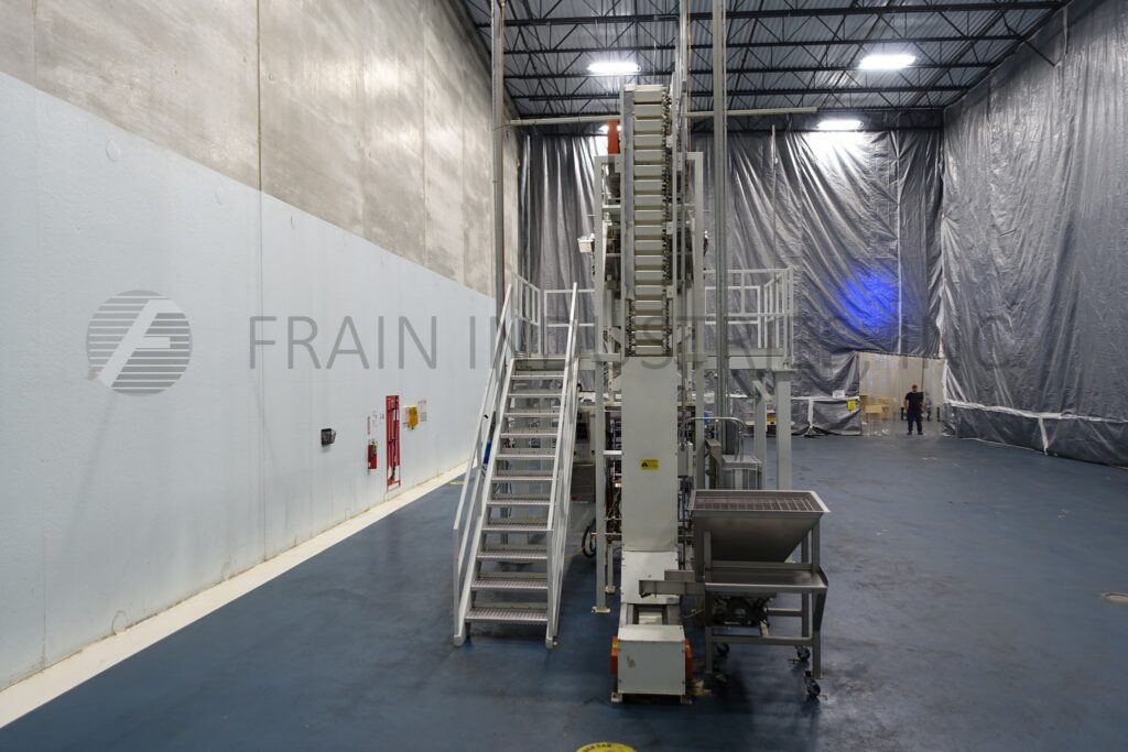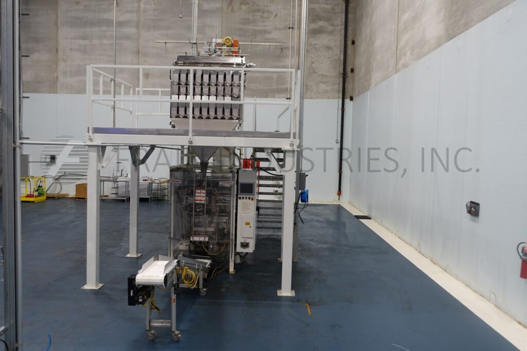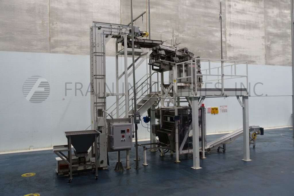 Back to All Equipment三角形, Model A918SHF2 / XYM15CHP, Complete scale bagging system with number of bags and product per minute – depending on material and application. Equipped with 36" wide x 36" long x 25" deep vibratory product supply hopper has 12" wide feed pan and bucket elevator with 9" long x 5" wide x 2½" deep product buckets and 176" discharge height with 30" wide x 48" long (6) lane vibratory feed pan goes into 9 lane in-line combination scale system to vertical form fill and seal bagger with 12" long vertical seal bar and 9 -7/16" wide horizontal seal jaws with hole punch. Video Jet DataFlex 6530 hot stamp coder and 11¾" wide x 143" long take away conveyor with 34" discharge height. System includes 129" x 90" mezzanine platform set 98" off the ground with 42" high safefty rails.