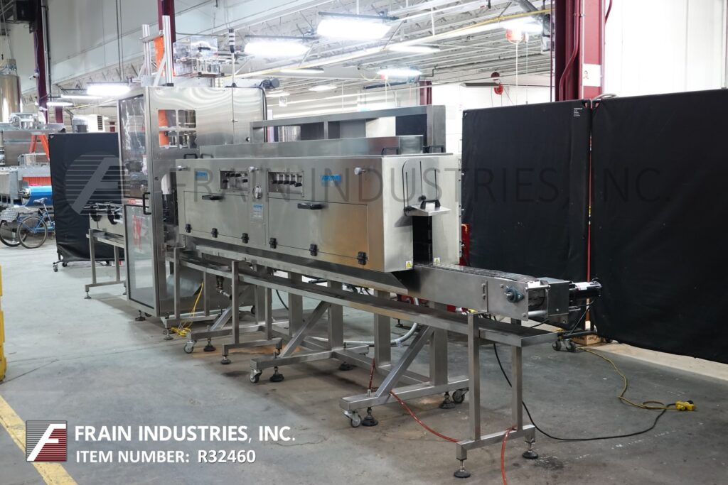 Back to All EquipmentTRIpack Model HSA-240 / AMF WSN, stainless steel, shrink neck bander and sleever with conveyor and steam shrink tunnel system. Rated from 20 to 200 containers per minute – depending on materials and application.