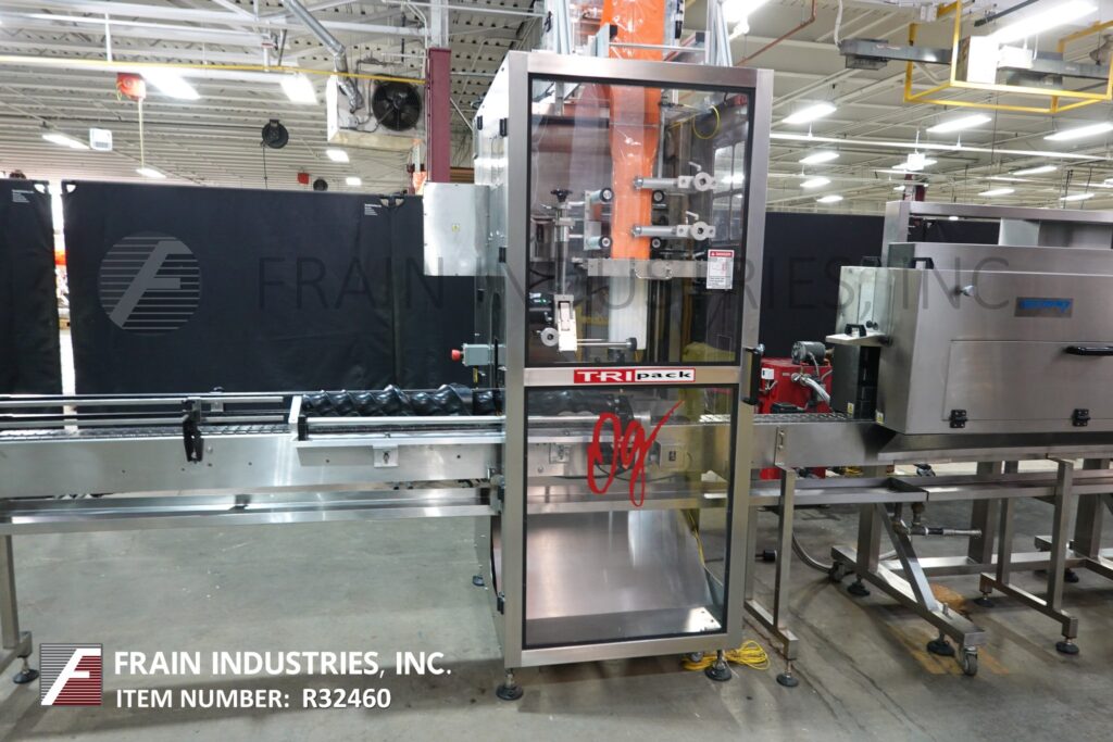 TRIpack Model HSA-240 shrink sleever with Layflat sleeve size range of: 40mm (1.6") to 245mm (9.8"). Cut length range of: 30mm (1.2") to 250mm (10"). Product OD range of: 25mm (1") to 100mm (4") and capable of running most shrinkable films with proper change parts. Equipped with powered film assist assembly, zero tension web design, loading / unwind station with 19" maximum film OD and 288" long x 4¾" wide stainless steel delron container conveyor. Mandrel / bullet design film delivery system and multi-blade knife assembly, with material out sensor, film tensioner and low film indicator. Control panel has A/B PLC with HMI operator interface, interlocking safety guarding and e-stops.