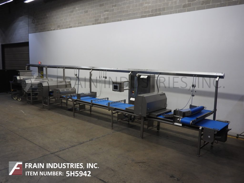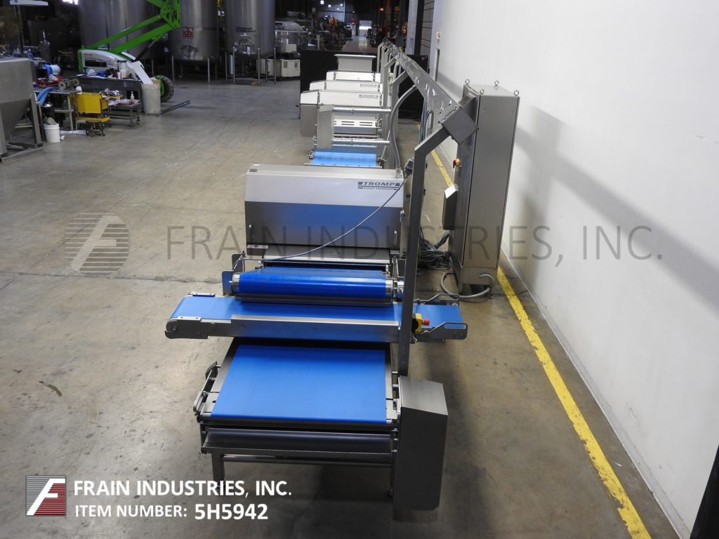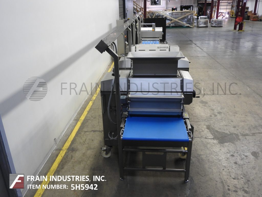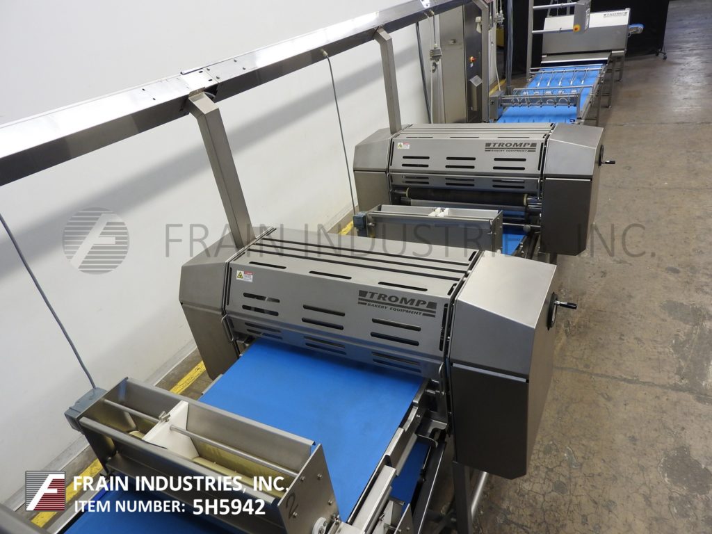 返回所有设备Tromp多用途,不锈钢,内联,烘焙化妆线,结合面团和面粉沉积,辊压,喷雾湿润,分切,折叠成型,剪切切断和废料清除,每小时产品数量取决于材料,应用和输送速度。线由668“长x 35-1/2”宽的产品进料输送机、紧急停止和额定每分钟13.8英尺,3卷面团存款12“长x 12“宽x 32“深面团料斗和切断刀和3辊压片机拉,形成一张面团从存款人和放置在传送带上的产品。有(4)其他面粉分离器通过这条线,以防止面团粘在传送带上,(4)其他2个辊式面团薄片通过这条线,以减少和薄化面团薄片,以达到所需的厚度,所有都有多个36英寸长x 8英寸外径的辊。还有(6)垂直圆形面团分切刀(6)架空的用于面团润湿的喷水喷嘴(6)带有气动切刀的面团折叠管和面团废料清除、收集和回收输送机。远程控制面板有触摸屏控制的PLC控制器,A/B变速控制器和以太网功能。安装在不锈钢框架与脚轮和调平腿。