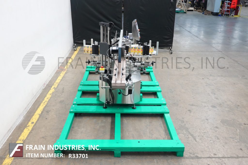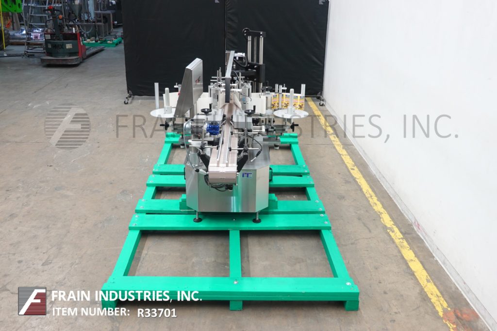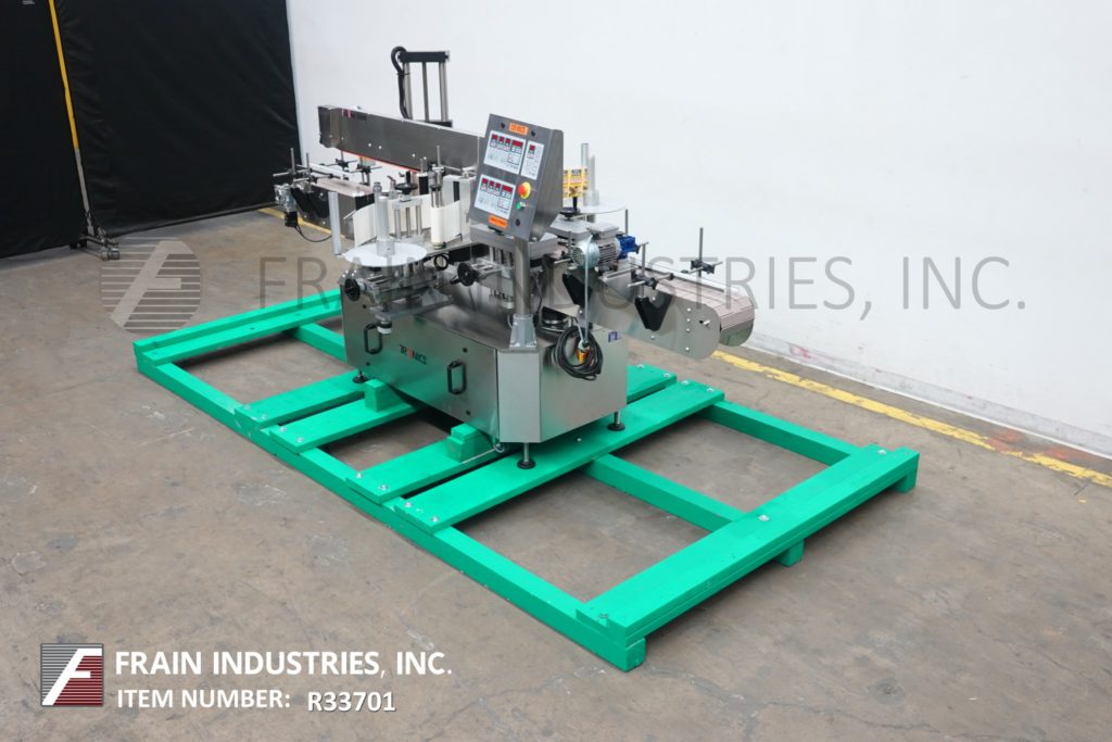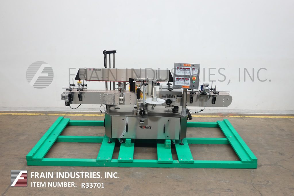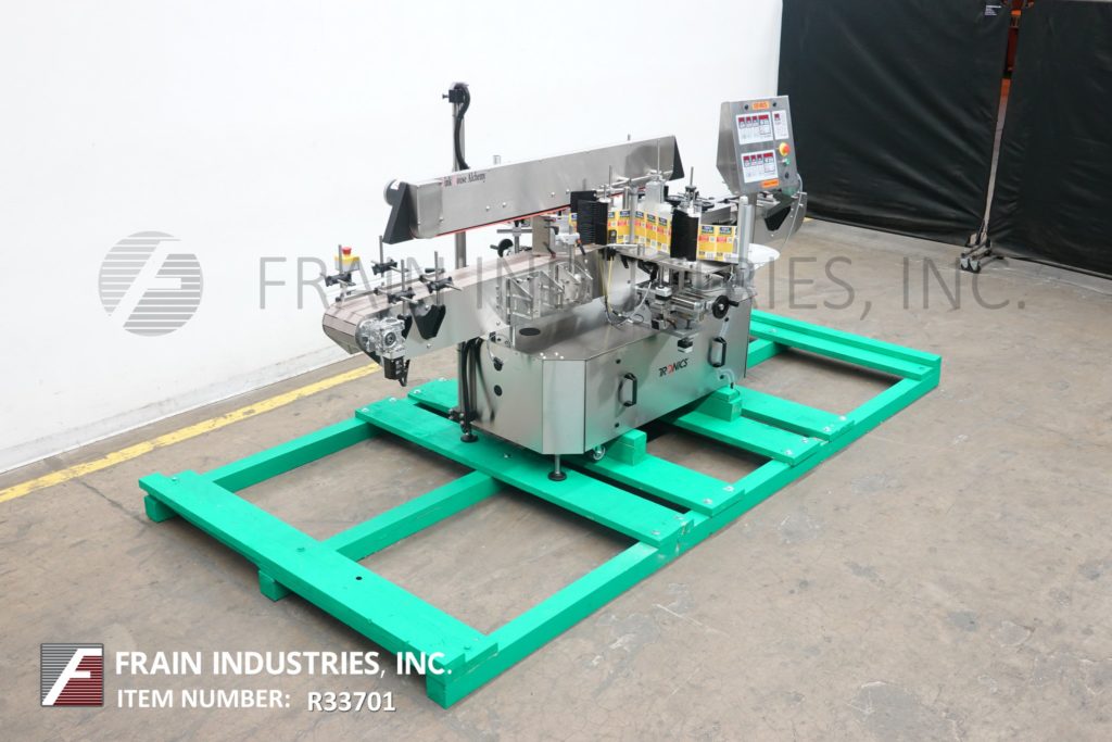 返回所有设备Tronics型号3S3,不锈钢,右手,正面,背面和包装,压敏标签。额定值从100“到1200”的正面和背面标签和50“到600”的包装标签每分钟的产品数量-取决于材料和应用。标签尺寸范围:高度1“至8-1/2”;12英寸长,可以处理直径达8英寸的容器。配备120“长x 7”宽塑料缩醛树脂产品在进料输送机,导轨可调60”长x 1”宽上按住输送机,间距,调整链条的容器平方,双重标签与9“高削皮器板块和16”长x 6”高边包装输送机所有手动曲柄可调
