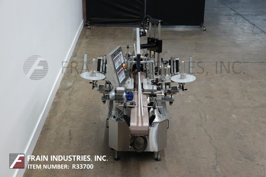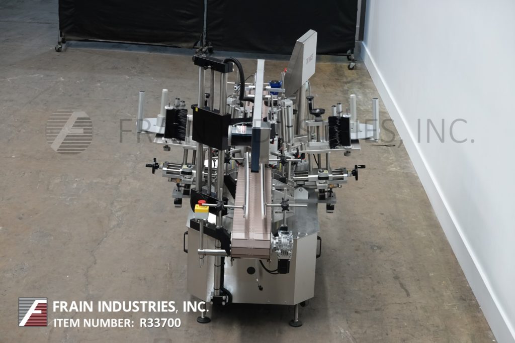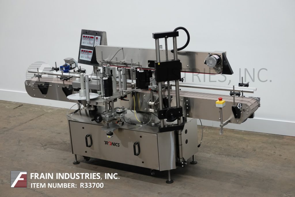 返回所有设备Tronics型号3S3,不锈钢,右手,正面,背面和包装,压敏贴标机,正面和背面标签上的额定值为100“至1200”,包装标签上的额定值为50“至600”,每分钟产品数量-取决于材料和应用。标签尺寸范围:1英寸至8-1/2英寸高;长度为12英寸,可处理直径不超过8英寸的容器。配备120“长x 7-1/2”宽的塑料Delrin产品进料输送机,带可调导轨,60“长x 1”宽的顶部压紧输送机,间隔轮,用于集装箱方形的对齐链,带9”高剥离板的双标签头和16“长x 6”高侧包装输送机,全手动曲柄可调