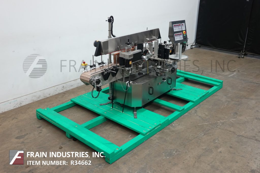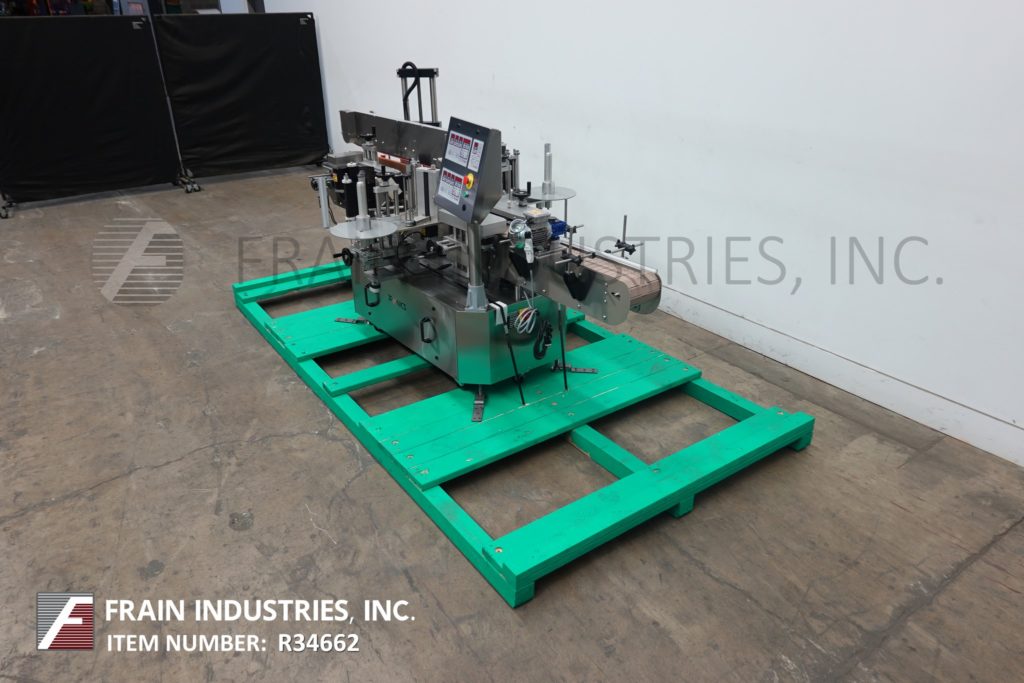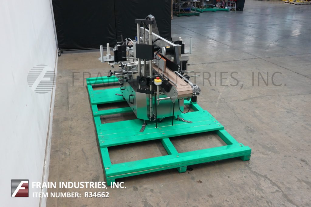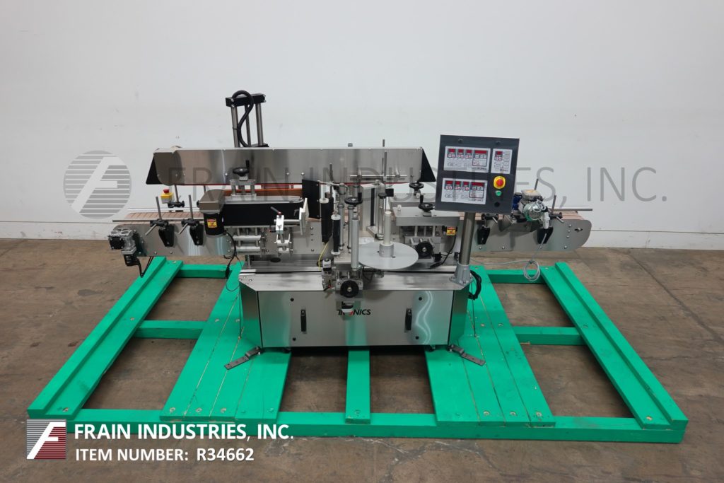Back to All EquipmentTronics Model 3S3, stainless steel, right hand, front, back and wrap, pressure sensitive labeler rated from 100" to 1,200" on front and back labels and 50" to 600" on wrap labels per minute with number of product – depending on materials and application. Label size range: 1" to 8-1/2" in Height; 12" in length and can handle containers up to 8" in diameter. Equipped with 120" long x 7-1/2" wide plastic Delrin product in feed conveyor with adjustable guide rails, 60" long x 1" wide top hold down conveyor, spacing wheel, aligning chains for container squaring, dual label heads with 9" high peeler plates and 16" long x 6" high side wrap conveyor all hand crank adjustable