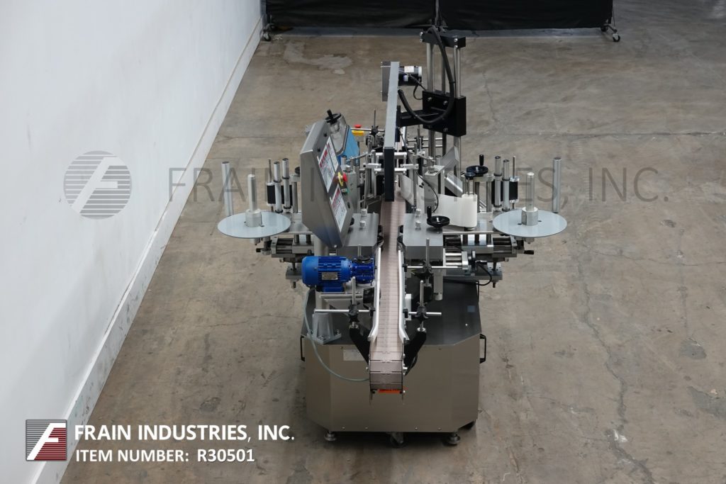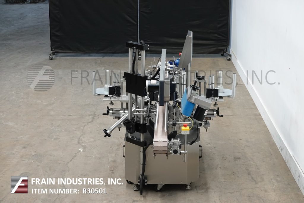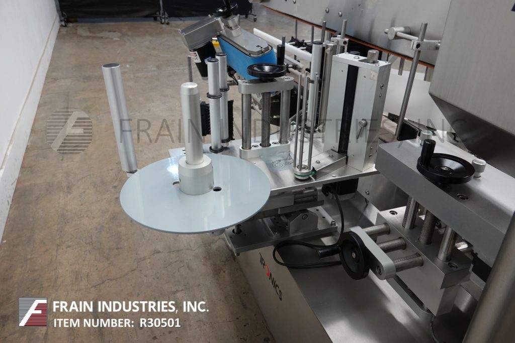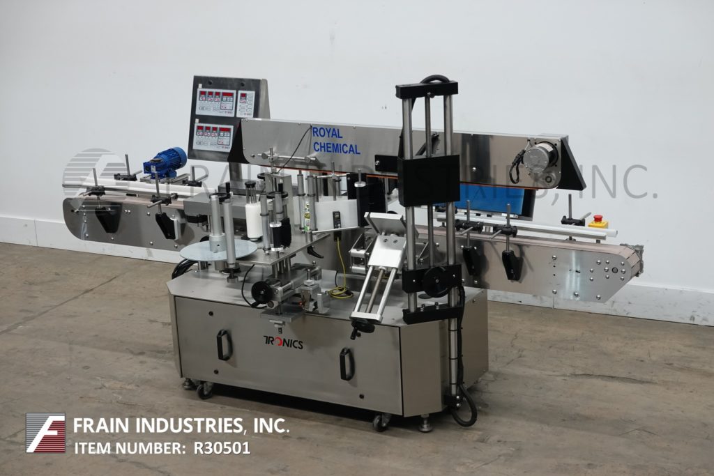 Back to All EquipmentTronics, Model 3S3, stainless steel, front, back and wrap, pressure sensitive labeler. Rated from 100" to 1,200" on front / back labels and 50" to 600" on wrap labels per minute with number of product – depending on materials and application. Label size range: 1" to 8½" in Height; 18" in length and can handle containers up to 8" in diameter. Equipped with 120" long x 4½" wide plastic Delrin product in feed conveyor with adjustable guide rails, 60" long x 1" wide top hold down conveyor, spacing wheel, aligning chains for container squaring, dual label heads with 9½" high peeler plates and 16" long x 5½" high side wrap conveyor all hand crank adjustable. Control panel has touch pad controls with read out and e-stop. Mounted on stainless steel base frame with casters and leveling legs.