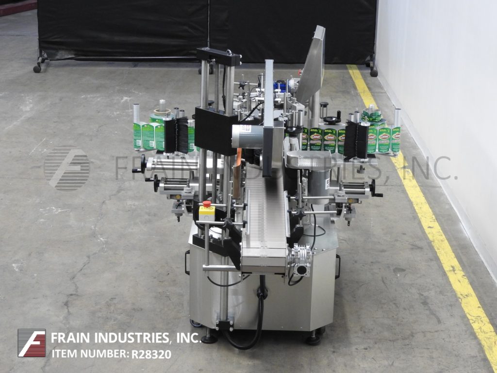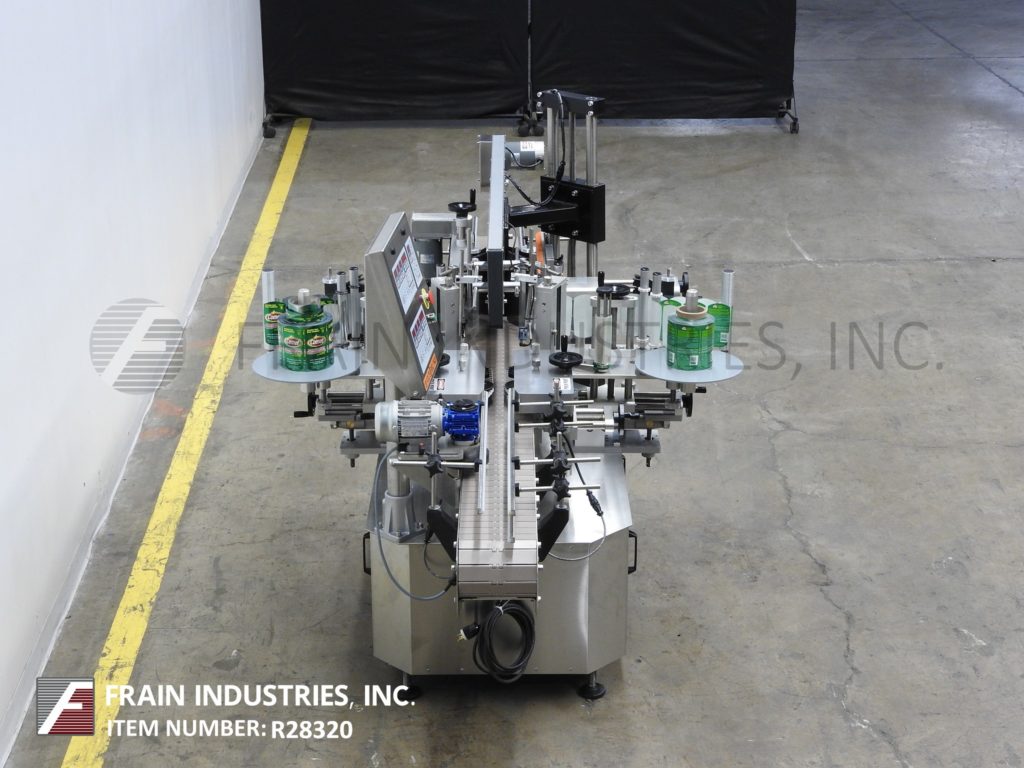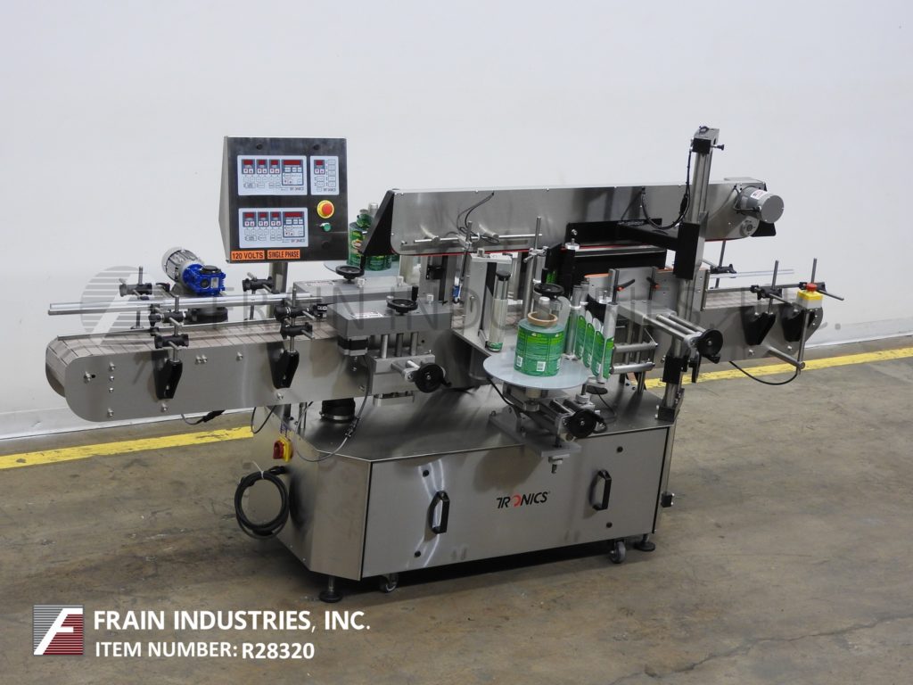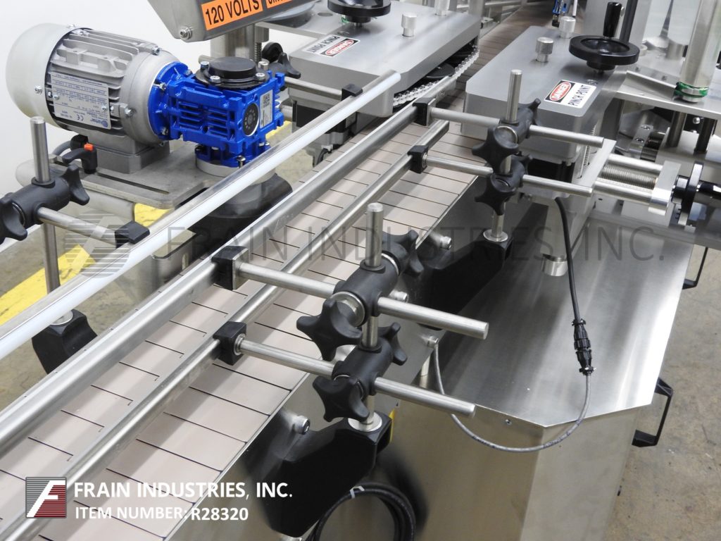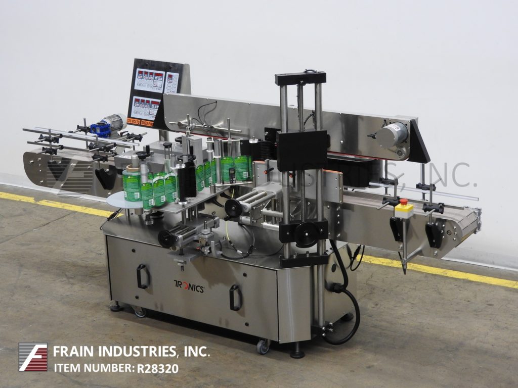 返回所有设备Tronics Model 3S3,不锈钢,前,背部和包装,压敏贴标器从前/后标签100“到1,200”,纸张标签每分钟100“至600英寸,产品数量 - 取决于材料和应用。标签尺寸范围:1“至8-1 / 2”高度;12“长度,可以处理直径高达8英寸的容器。配备120英寸长x 7-1 / 2“的宽塑料delrin产品,采用进料输送机,可调导轨,60”长x 1“宽顶部盖上输送机,间距轮,对准集装箱平方的链条,