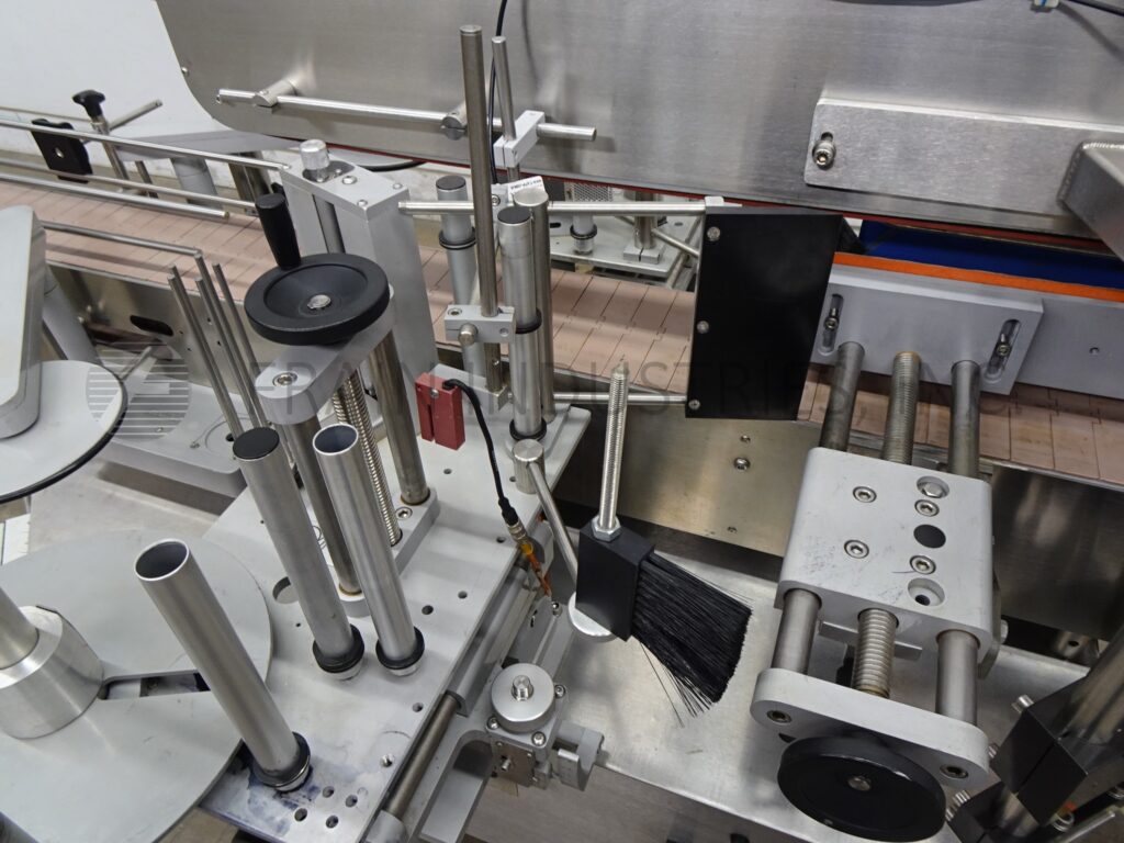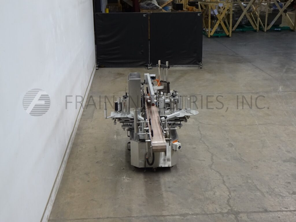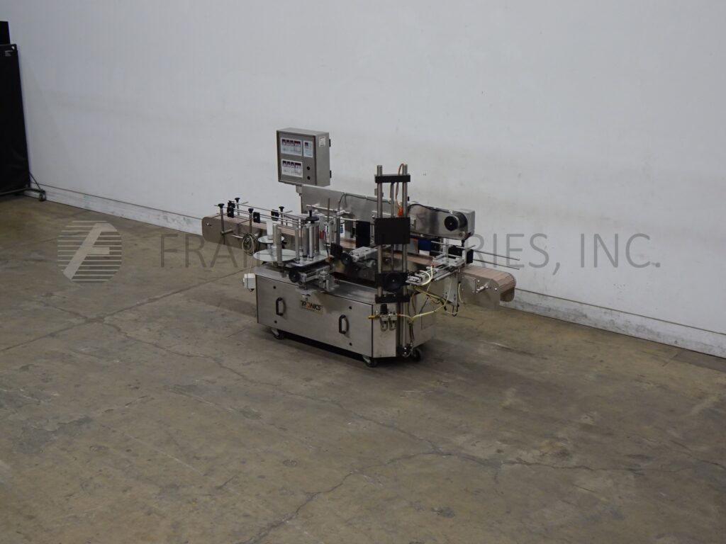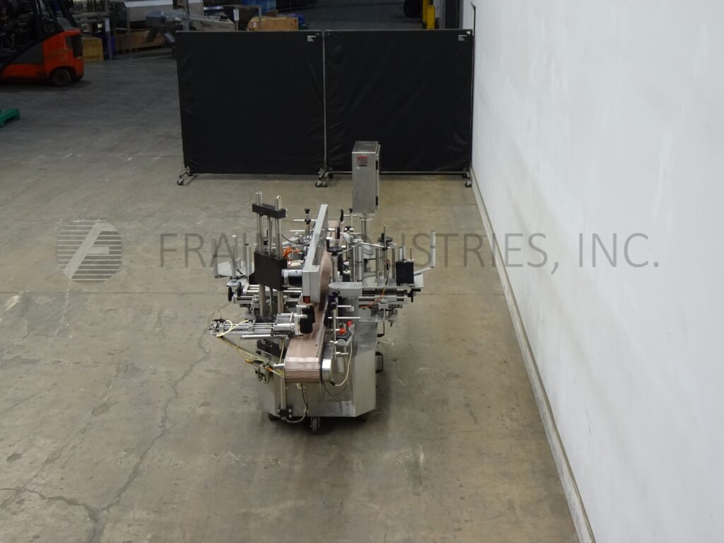 Back to All EquipmentTronics Labeler, Model 3TDSC 31 CDE,front/back wrap, pressure sensitive labeler with number of product per minute – depending on materials and application.Equipped with 120" long x 7½" wide plastic Delrin product in feed conveyor, left and right label heads, and 9½" high peel plates on both sides. Wrap conveyor, 14" long x 3½" high, 60" long x 1" wide Overhead conveyor. Mounted on stainless steel frame with a touch pad controller.