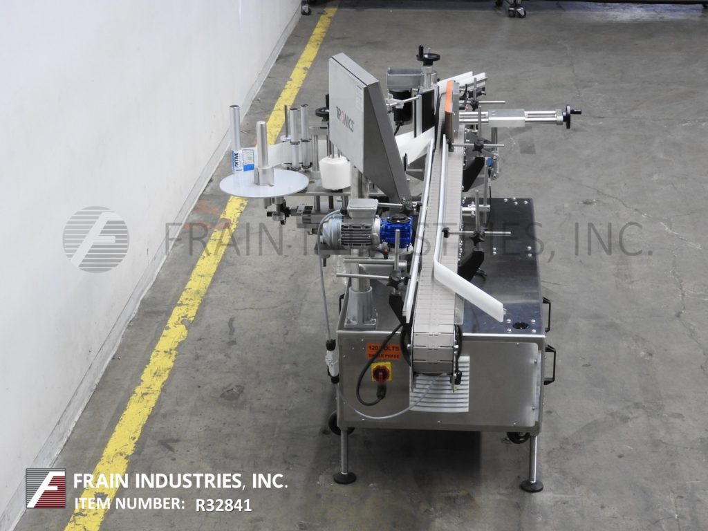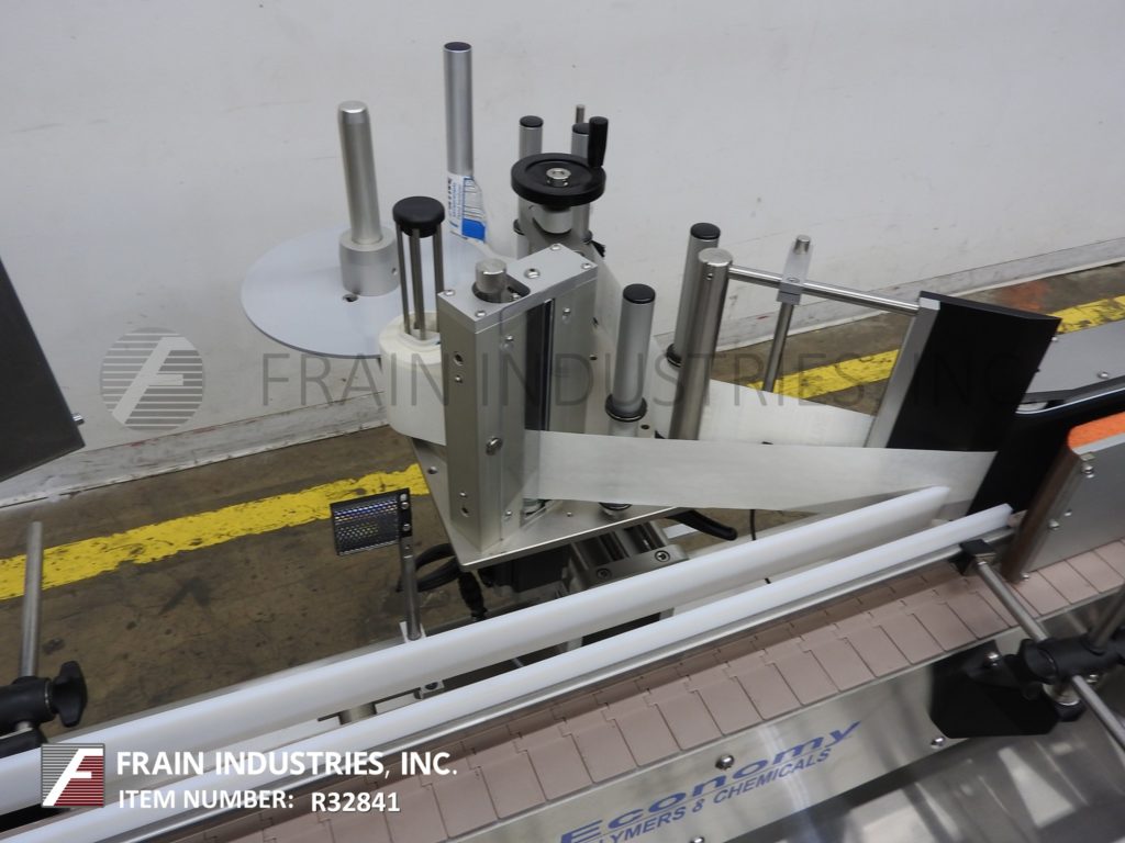 返回所有设备Tronics型号S30,不锈钢,开放式框架,步进驱动,压力敏感,包装贴标器从100“到1,200英寸的每分钟,标签和容器数量 - 取决于材料和应用。标准标签尺寸范围:1/4“至8-3 / 4”宽度x 1/4“至39”的长度,可高达+ / - 1/32的标签放置。可以用适当的变化部件处理多达10加仑的容器的许多形状和材料。配备4-1 / 4“宽X 120”长塑料Delrin产品,进给输送机,可调节导轨和32“在进料/放电高度,具有间距凸轮指数,没有容器/无标签,单标头有9”高削果板和9“高标签应用刷,6”高侧“21”长x包装带,机器是手工曲柄可调,并在1-1 / 2“OD芯上有13”OD标签卷轴。控制面板具有触摸板控制,读出,最多100个工作存储器,并具有电子停止。安装在带有脚轮和平整腿的不锈钢框架上。