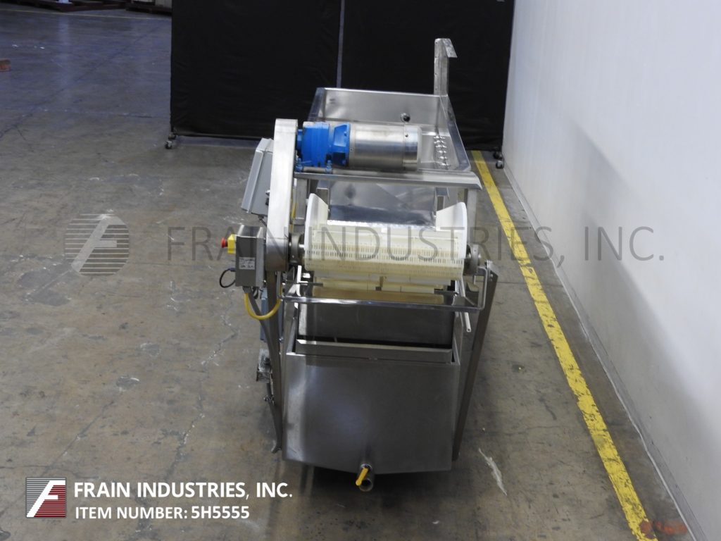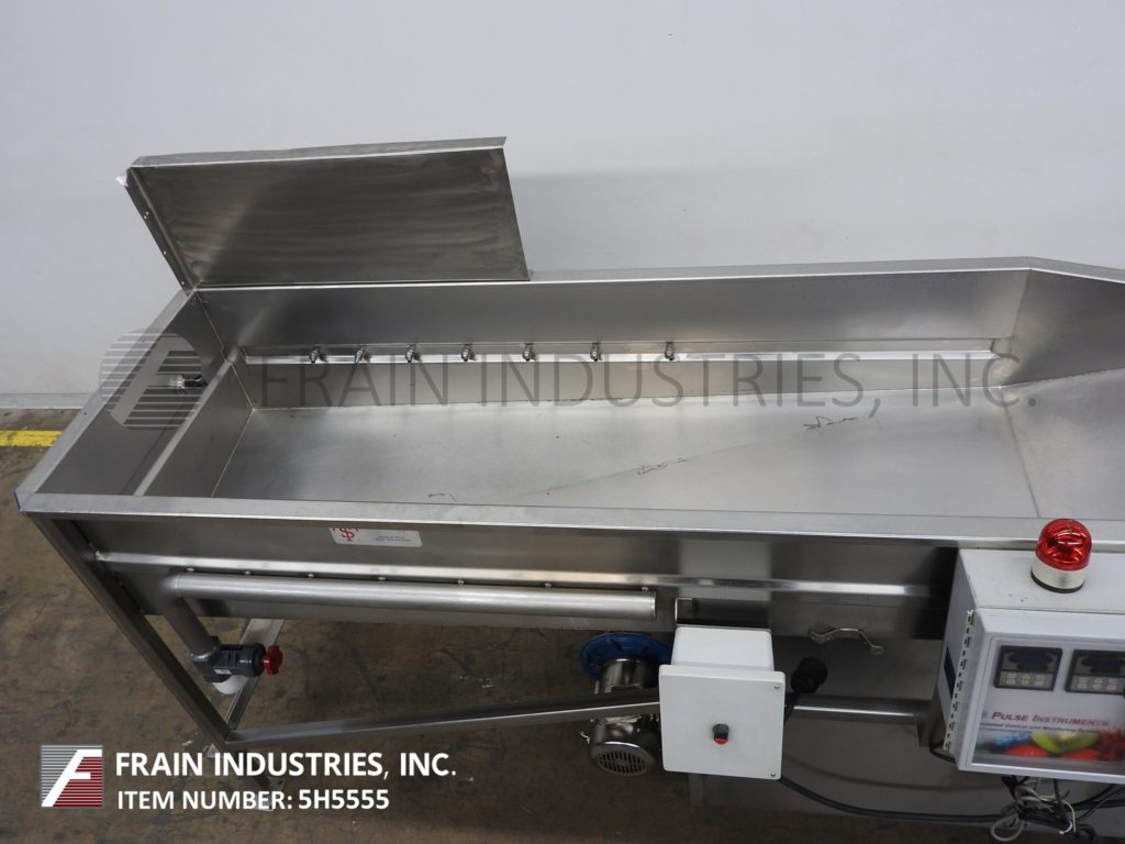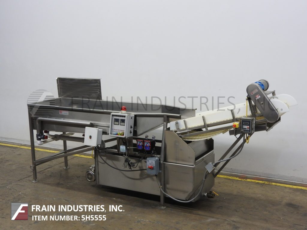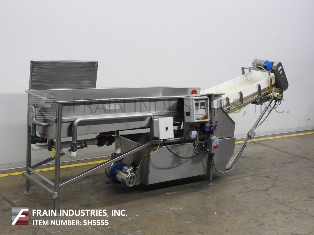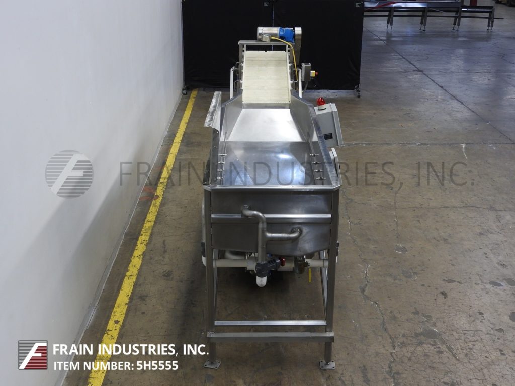 返回所有设备TS设计公司,模型喷射水槽洗涤器是一个不锈钢,喷射喷雾除砂器设计用于清洗和清除石头和沙子从叶产品每小时的产品磅-取决于材料和应用。全304不锈钢结构,配有水筛过滤系统,可过滤1/32英寸及以上的颗粒。配备106"长x 32"宽x 22"深清洗槽(7)1/2"外径侧安装水射流喷嘴设置在6"中心(7)每边和2-1/2"外径端底部端口。64“长x 23”宽倾斜cleated产品卸料输送机20“宽x 1”高cleats设置在10“中心和3/4马力顶部安装电机驱动器变速控制器和71“卸料高度。68"长x 32"宽x 29"深底部溶液槽,2-1/2"外径端底部端口。不锈钢3hp离心循环泵与脉冲仪器监测和控制消毒系统监控磐城清洗溶液计量泵,水故障和统计光3-1/2" / 2-1/2" PVC和2-1/2"不锈钢管道。安装在全不锈钢底座上,带有启动和停止按钮。