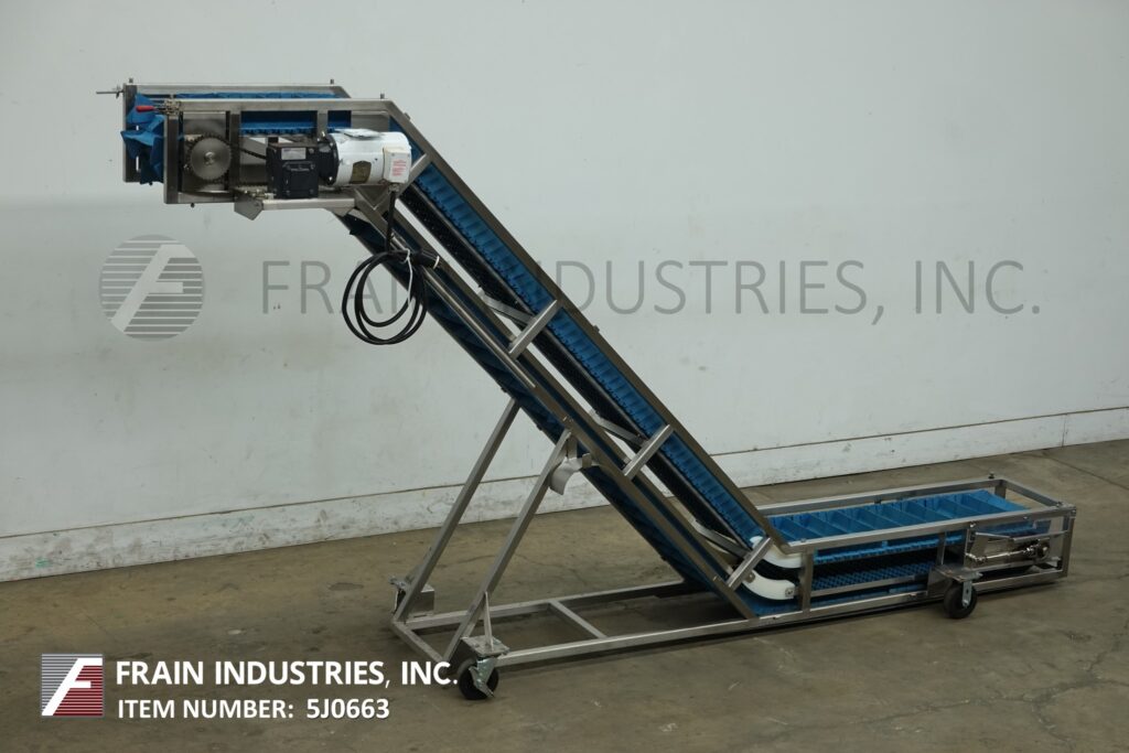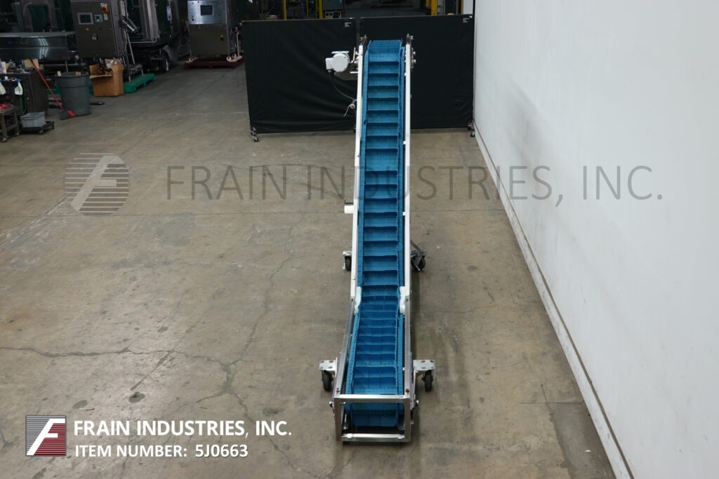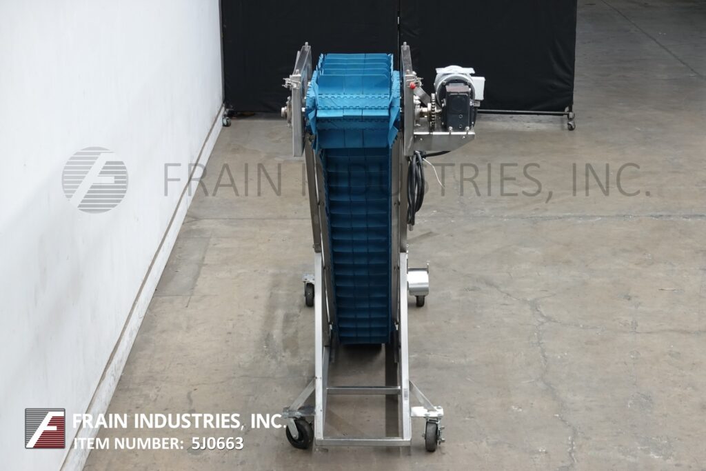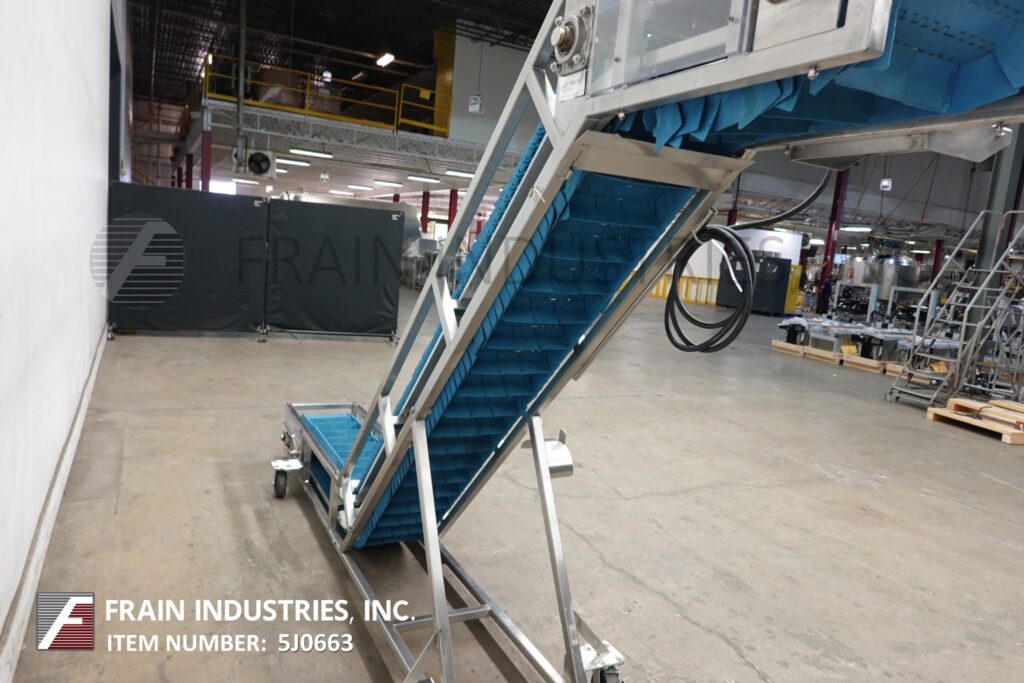 Back to All EquipmentUltra Fab Inc, stainless steel, inclined cleated conveyor. Equipped with 11" infeed height, 12" wide conveyor belt with 3" high cleats set on 5½" centers. Conveyor has 55" long bottom horizontal run, 100" long incline, 24" long top horizontal run with 78" discharge height. Powered by 1 Hp motor drive. Mounted on stainless steel frame with casters.