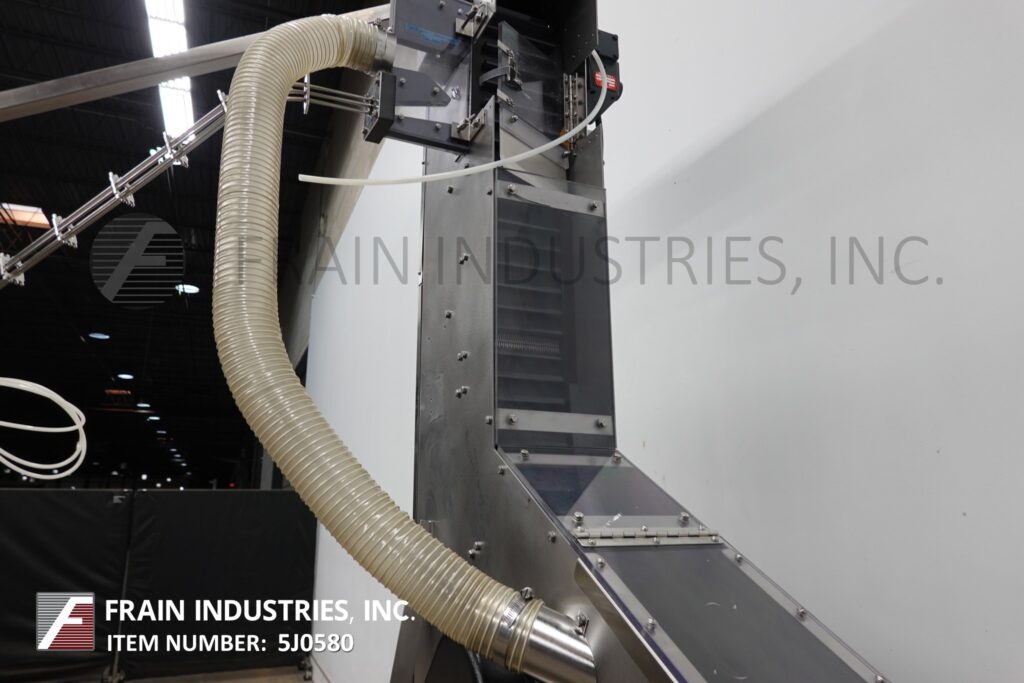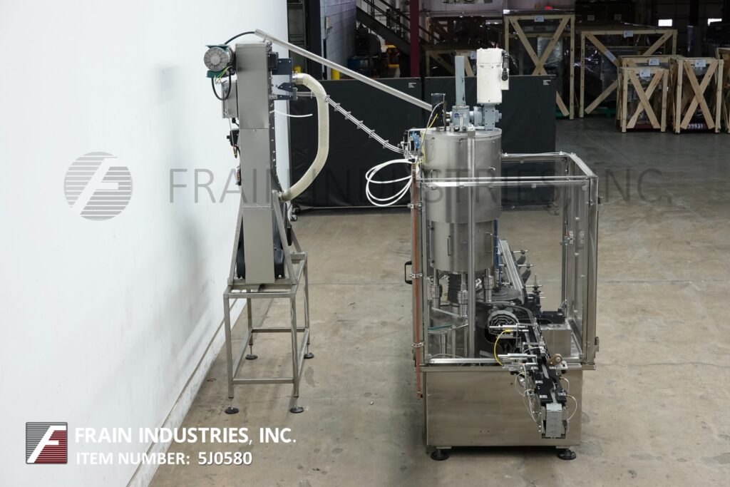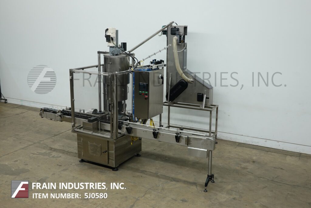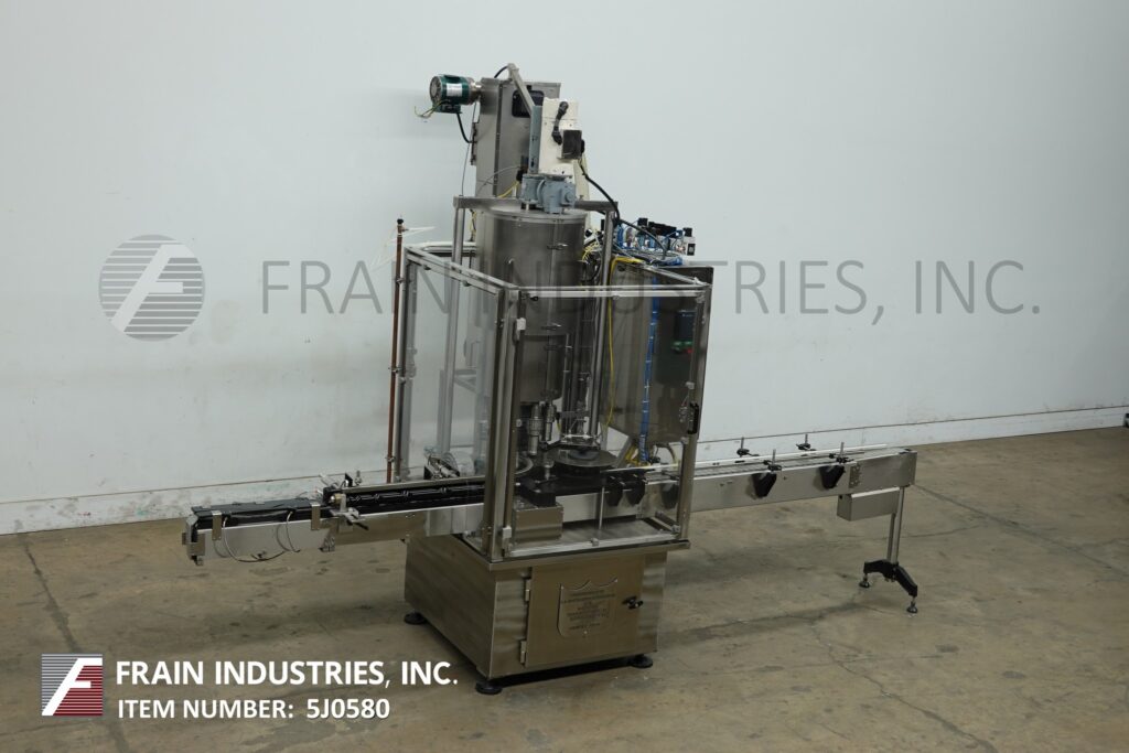返回所有设备装瓶机,型号RC-4-14,不锈钢,(4)头,旋转卡盘盖。额定20至120集装箱每分钟-取决于材料和应用。瓶盖尺寸不超过110毫米,容器容量不超过6升(有适当的更换部件)。配备倾斜cleated瀑布式瓶盖分选机,给料机和有65“长x 6“宽输送机与¾“高夹板设置在2“中心,72“长x 4“宽Delrin容器在饲料输送机,与32“长蜗杆螺杆星轮进料和出料,(4)扭矩露天卡盘设置在10“中心,并能够做各种帽适当的改变部分和顶部安装升降千斤顶方便调整和访问。控制面板有A/B控制器与A/B面板视图和A/B powerflex变速控制器与封盖启动,停止,复位和e停止按钮,门锁,瓶停止,皮带注意,盖门,盖卡盘和供应空气压力表。安装在不锈钢框架上,配有安全门保护和调平腿。
