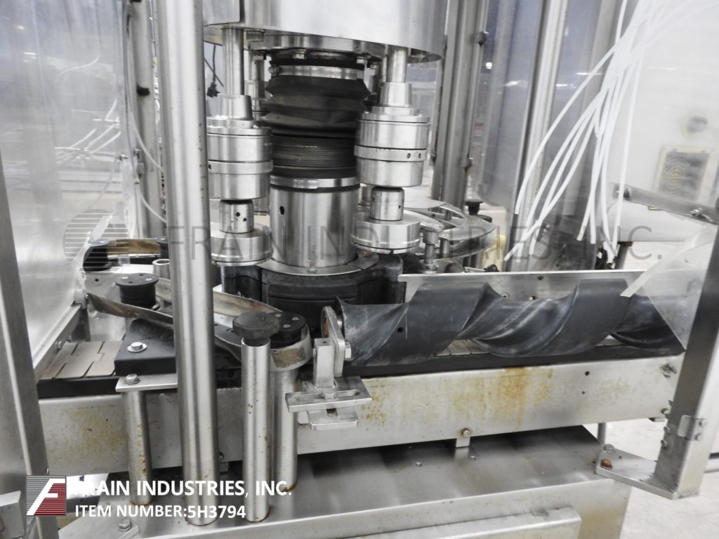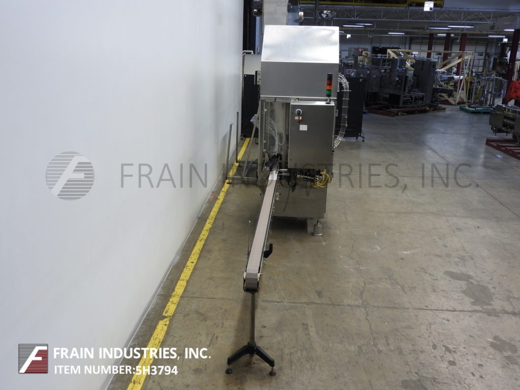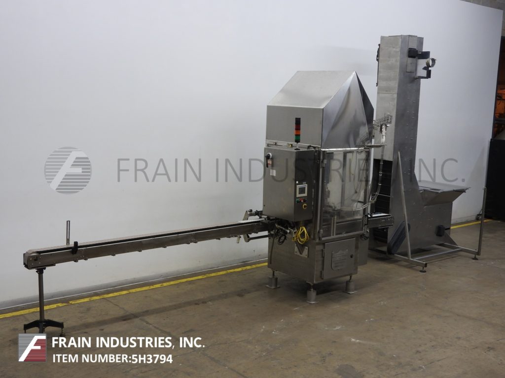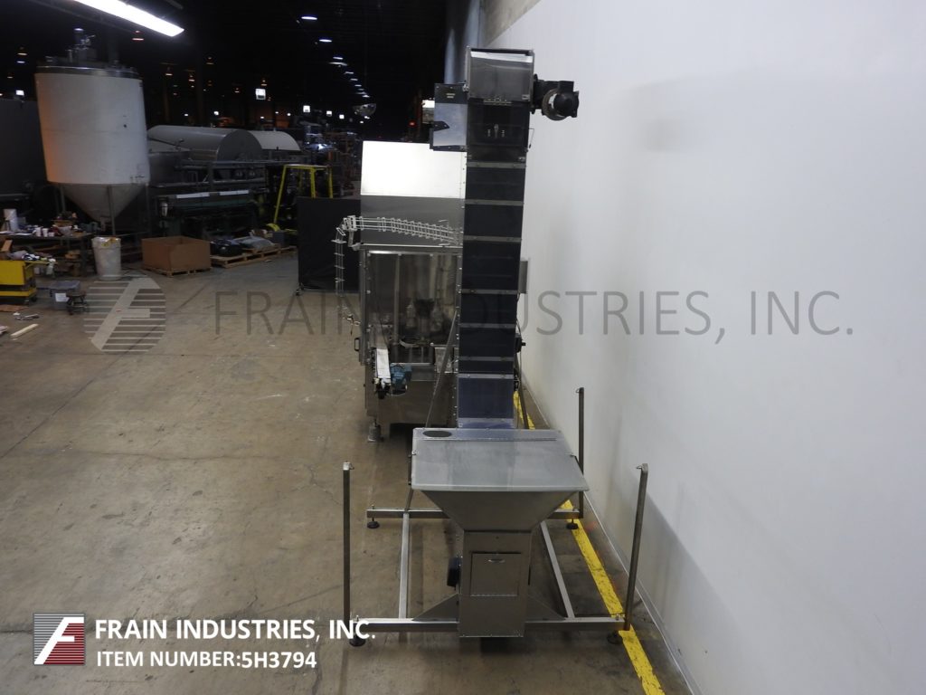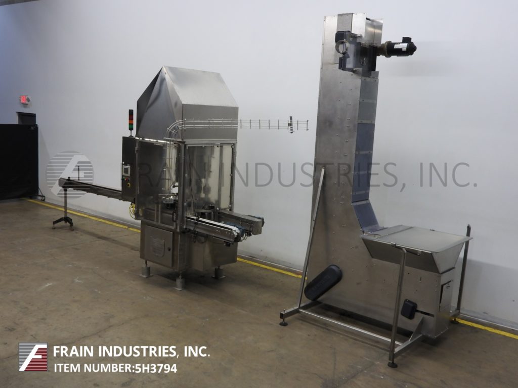 返回所有设备你的瓶子Model TC-4-14, stainless steel, 4 head rotary chuck capper and feeder rated from 16 to 40 containers per minute – depending on materials and application Equipped with 201" long x 4-1/2" wide plastic delrin belt conveyor with worm screw in feed, cap feed chute and 16" OD rotary turret with top mounted motor drive and cone style cover and (4) pneumatic chucks, set on 10" centers with 84" long x 4-1/2" wide plastic delrin belt conveyor with star wheel discharge. Control panel has A/B controller and A/B Panel view with start, stop, reset, e-stop push button controls and statis light bar, with air chuck controls and gauges. Mounted on a stainless steel base frame with safety door guarding. Also a
