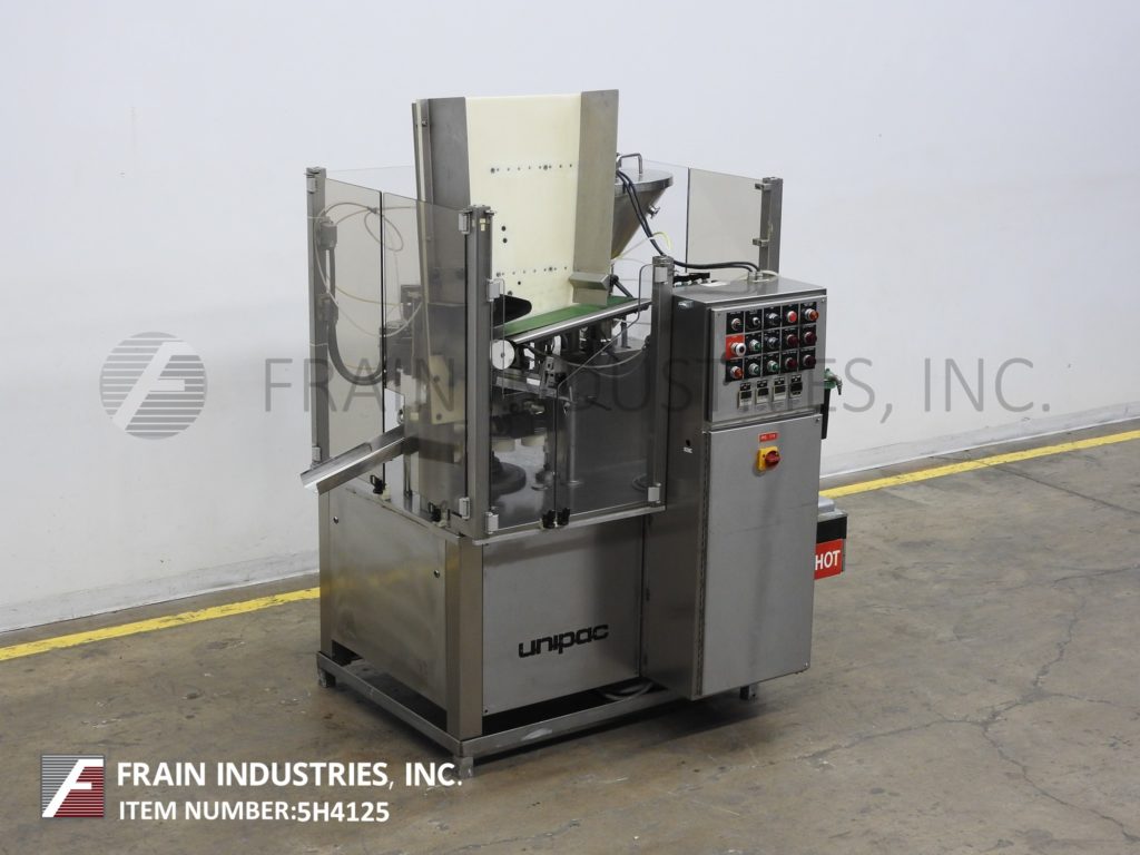 返回所有设备Unipac,银80型,自动,塑料或层压管填充和封口机。额定从10到40管每分钟-取决于材料,应用和机器配置。管尺寸范围:直径10mm至50mm;高度50mm至250mm。填充尺寸范围:3ml到450ml,根据不同的应用需要适当的更换部件。配备管库,管压降器,18" ID x 20"深夹套不锈钢产品料斗液位检测,12口袋旋转塔,注册,底部向上填充,热颚密封系统,修整站和联锁安全防护。控制面板有按钮启动/停止和数字温度控制。安装在重型基础框架。