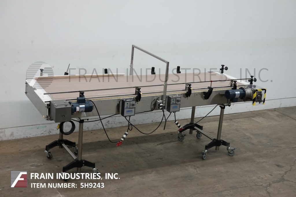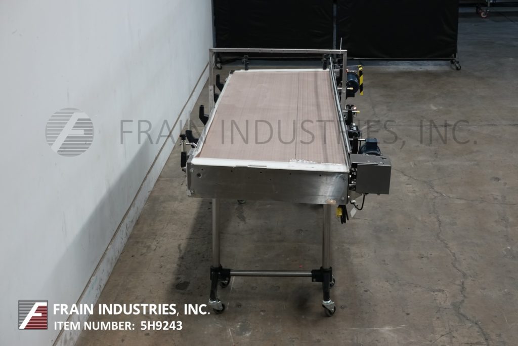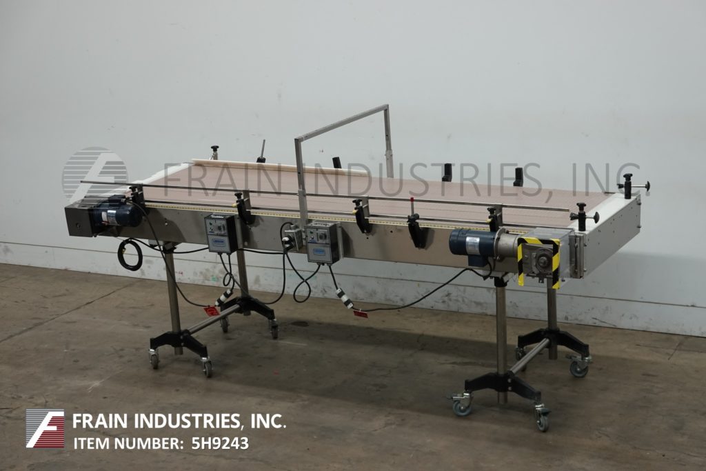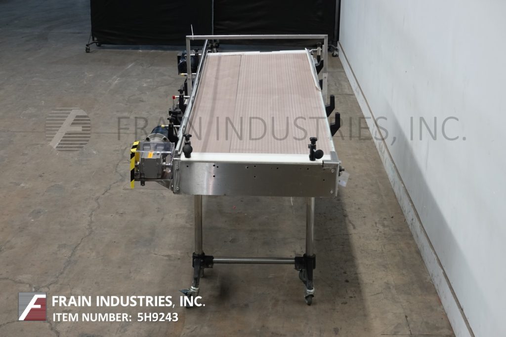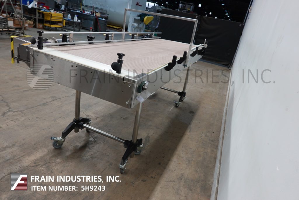 Back to All Equipment36" wide x 112" long, stainless steel bi-directional off-line accumulation table with number of containers per hour – depending on materials and application. Equipped with 36" wide x 112" long belts with variable speed controls, adjustable guide rails and 40" to 45" feed and discharge height range, with (2) ½ Hp motor drives. Mounted on (4) leg stainless steel frame.