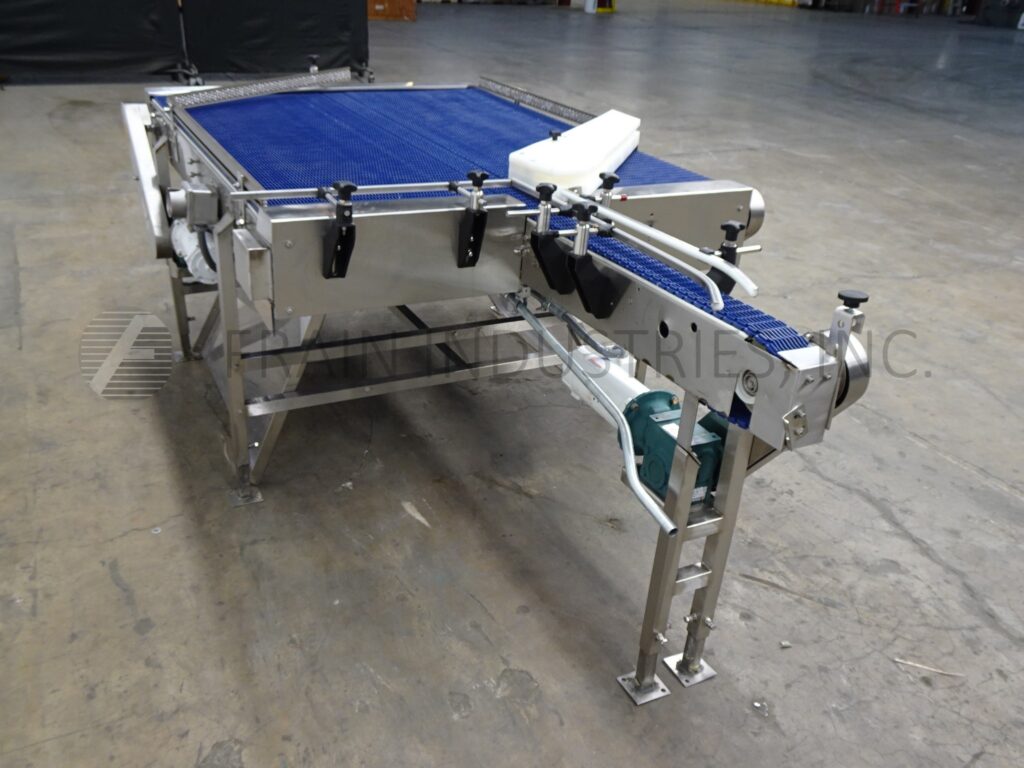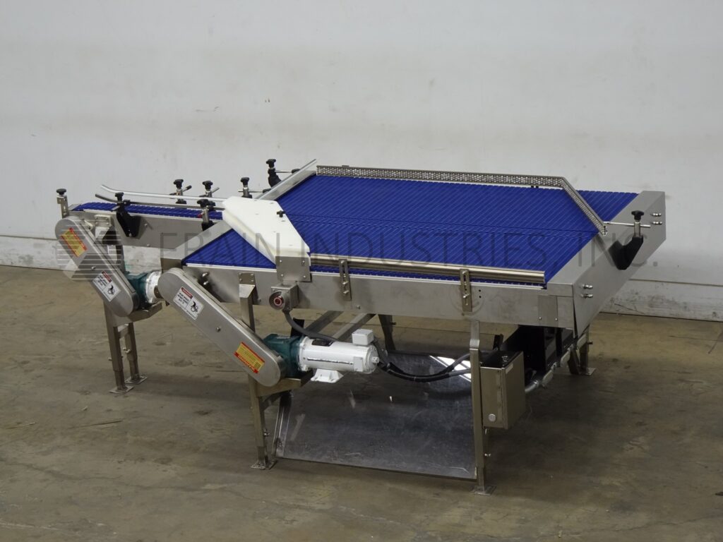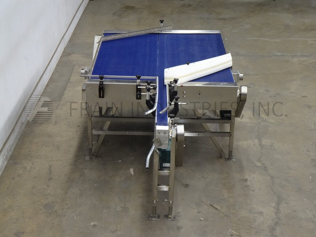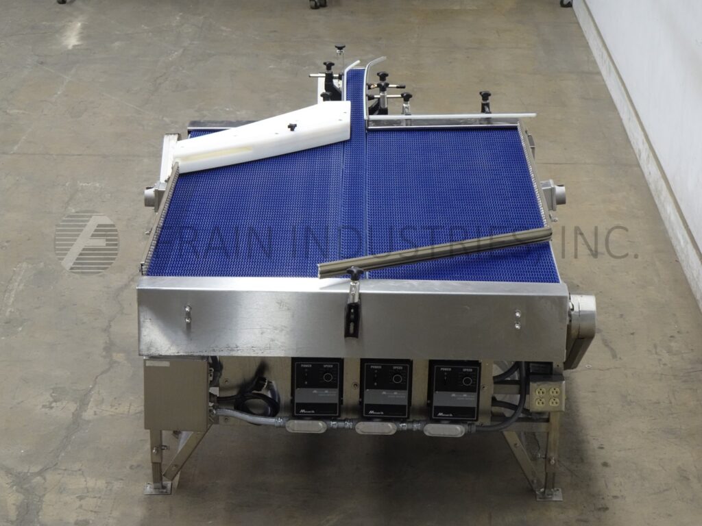 Back to All EquipmentStainless steel, accumulation table, 3¼" wide x 102" long product feed conveyor (2) 24" wide x 64" long bi-directional accumulating belts which feed into the product conveyor. Mounted on a stainless steel base frame with height adjustable legs and casters with an infeed / discharge range of 34" to 38". Control panel with variable speed.