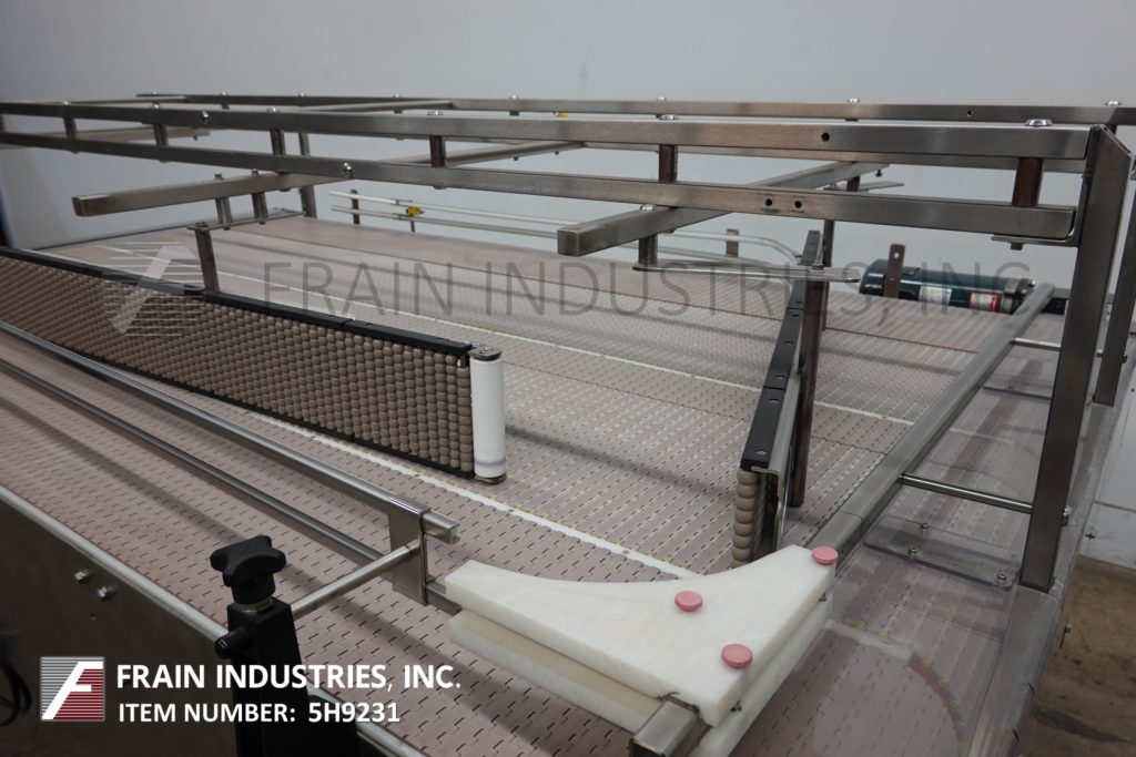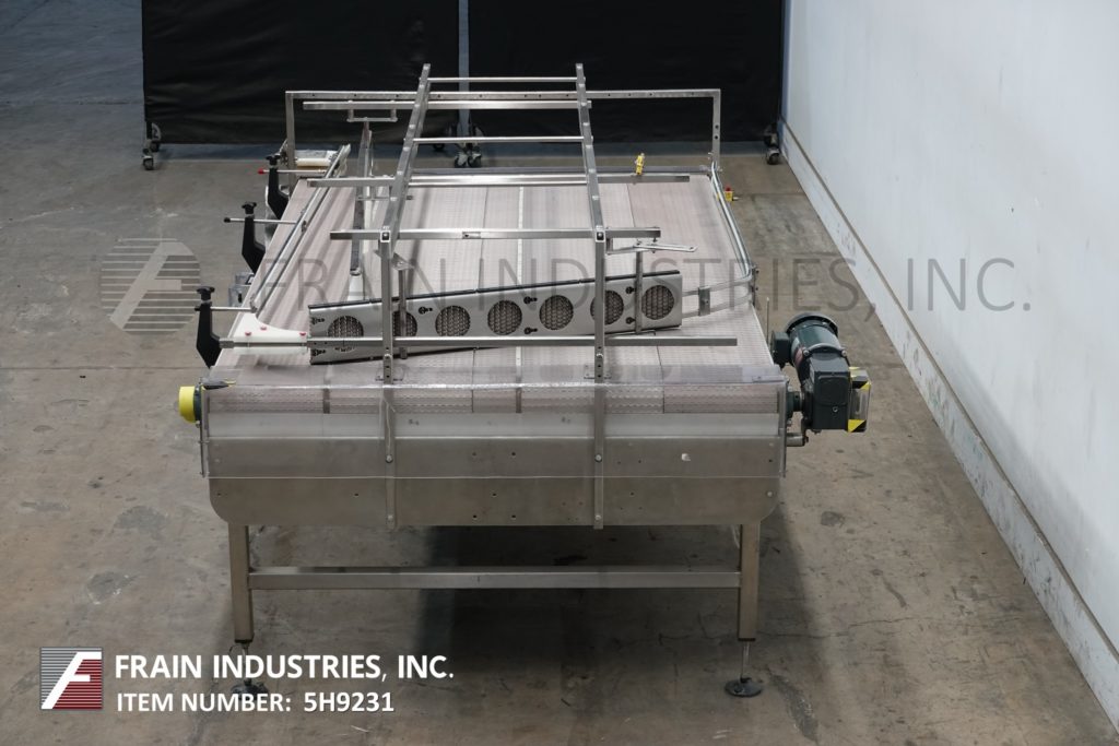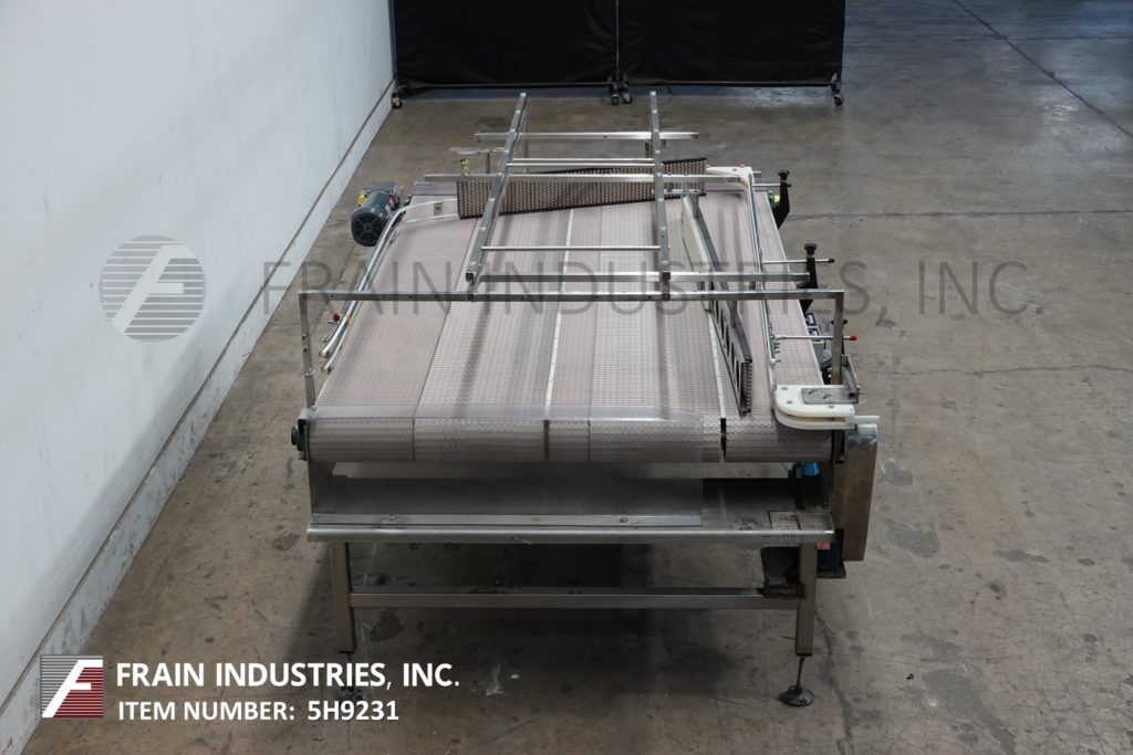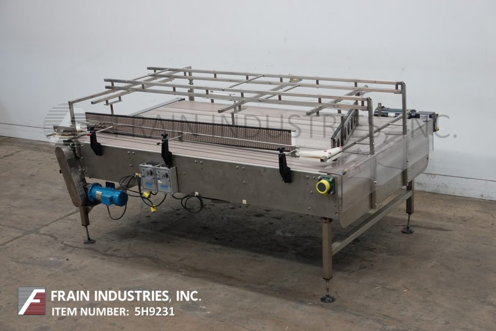 Back to All Equipment60" wide x 100" long, stainless steel bi-directional off-line accumulation table with number of containers per hour – depending on materials and application. Equipped with 60" wide x 100" long belts with variable speed controls, adjustable guide rails and 35" to 40" feed and discharge height range, (1) 1 Hp and (1) ¾ Hp motor drives with vari speed controllers. Mounted on (4) leg stainless steel frame.
