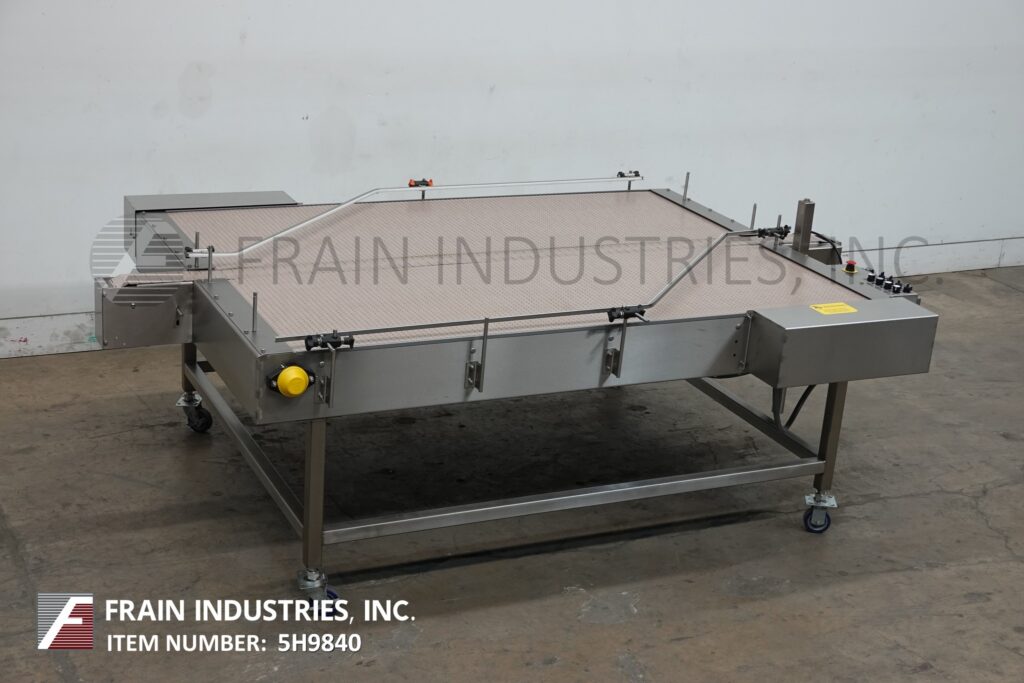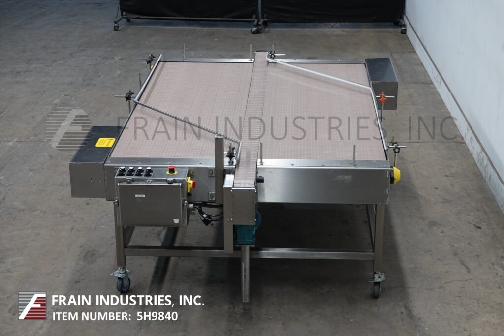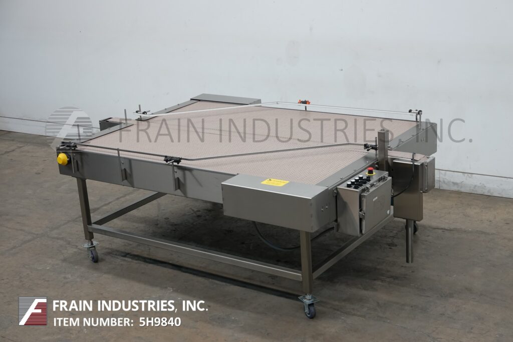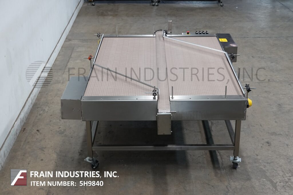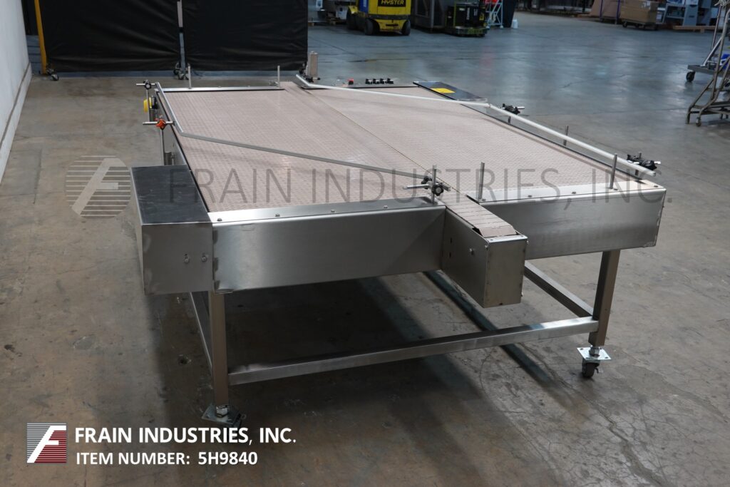 返回所有设备不锈钢台面带式堆积输送机。配备4½”宽x 115”长的Delrin产品进料输送机和(2)30”宽x 87”长的双向积累带进产品输送机。安装在不锈钢底座框架高度可调腿和脚轮与进/出料范围37“到42”。控制面板上的每个皮带都有变速刻度盘。