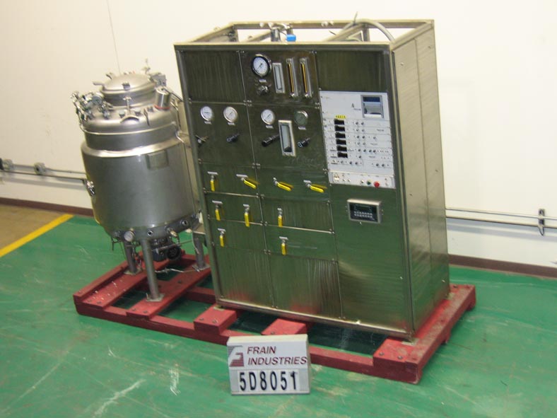 返回所有设备ABEC,500升,316不锈钢,生物反应器/发酵罐。具有36“直径X 36”侧壁船舶,额定为40Psig @ 280F,折叠夹克,额定在50Psig @ 350F和S / S控制面板,具有谷仪器控制。船只有.135“壳/头厚度,32”头圆盘半径,壳体由15个Guage 304 S / S,2 1/4“顶视牌,2 1/4”侧视玻璃,侧挡板,中央底部螺旋桨搅拌由FLENDER 8.31HP驱动器,氨基甲酸酯绝缘和罐安装在四个负载电池上,带有LED显示屏的推动纽扣替换重量控制器。控制面板具有Seco DC驱动器控制器;e-stop;用于空气,O2流动,PO2,速度,pH和温度的控制模块;按钮LED显示屏;数据记录器;背压,蒸汽,空气,O2和冷却的压力管道; and controls for cooling water, air, sparge, sparge condensate, temperature control steam, jacket steam, vessel backpressure, back pressure condensate, and jacket condensate. Mounted on stainless steel frame with height adjustable legs.