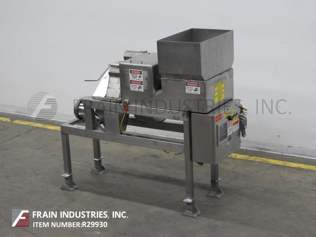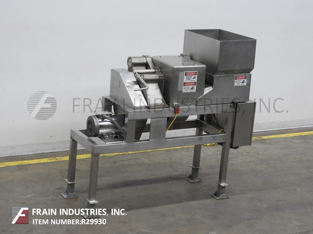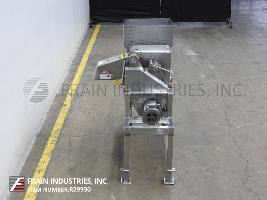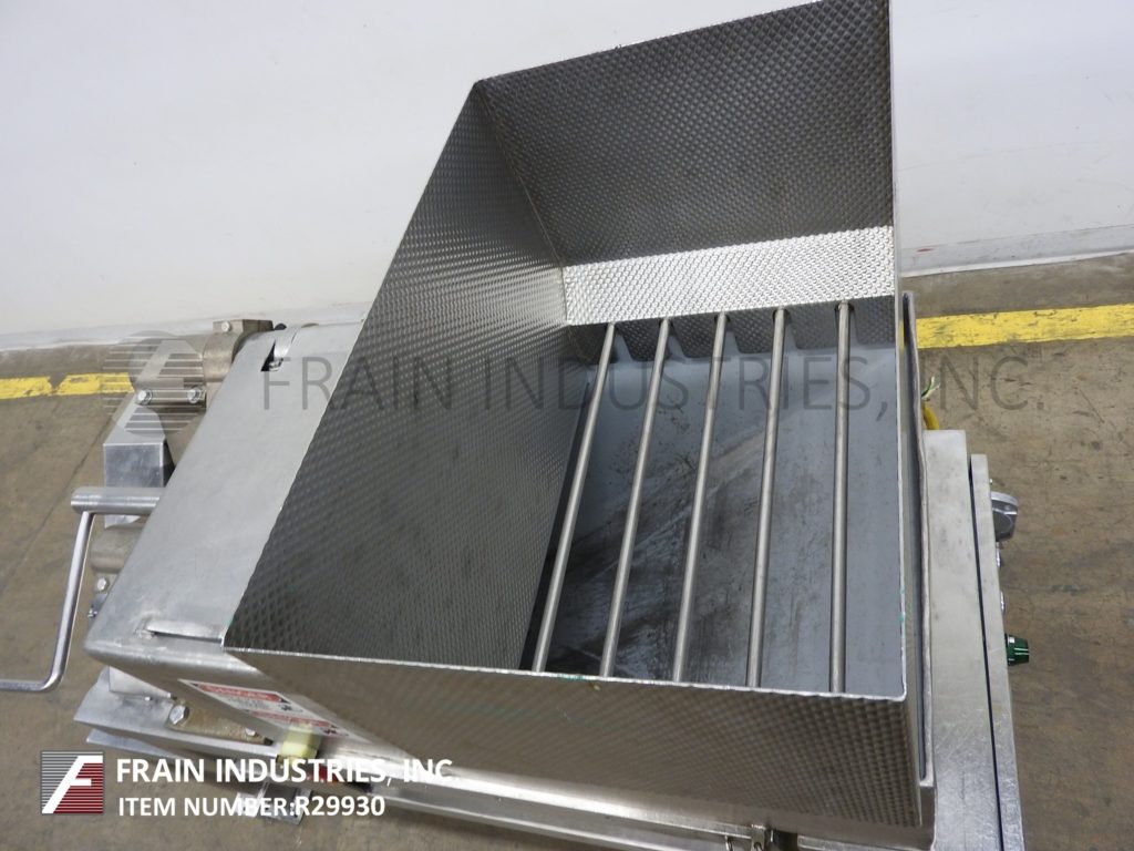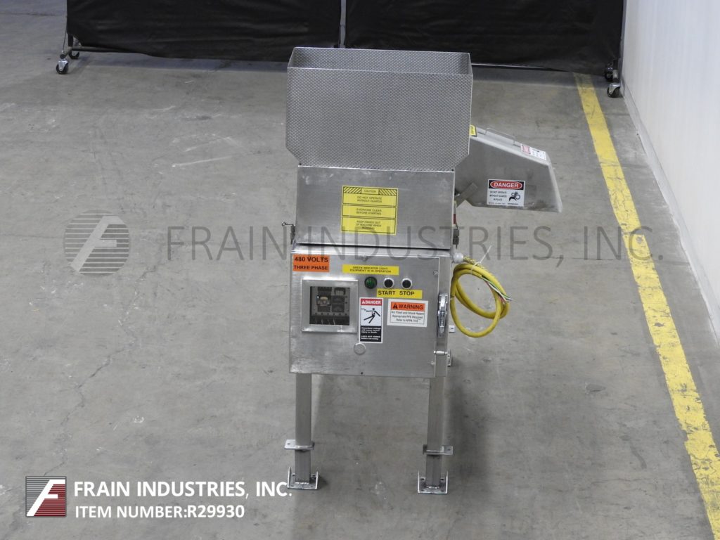 返回所有设备URSCHEL模型G,不锈钢USDA,切丁酶/切片机/切割器用于各种食品,每小时体积 - 根据材料和应用。利用切片,横切,并且圆形刀与范围:1/8" 至5/8" 片厚度,9/32" 至3" 横切,1/8" 至3" 的通知。对于不间断的生产连续运动和接受产品达5-1 / 2" 的任何尺寸。产品被馈送通料斗加入到一个旋转的叶轮进入叶片。配备不锈钢进料斗,排出滑槽,与剥离安全护卫开始/停止按钮控件。安装在不锈钢基架带脚轮。更改部件需要不同尺寸的变化。
