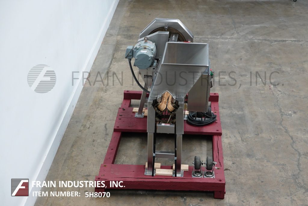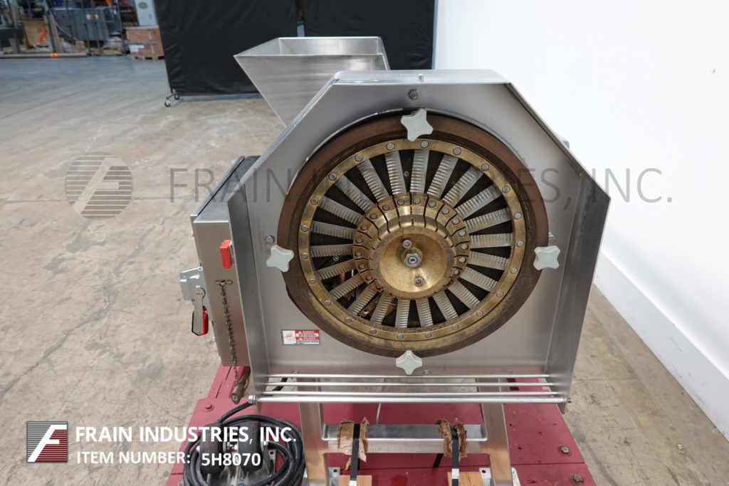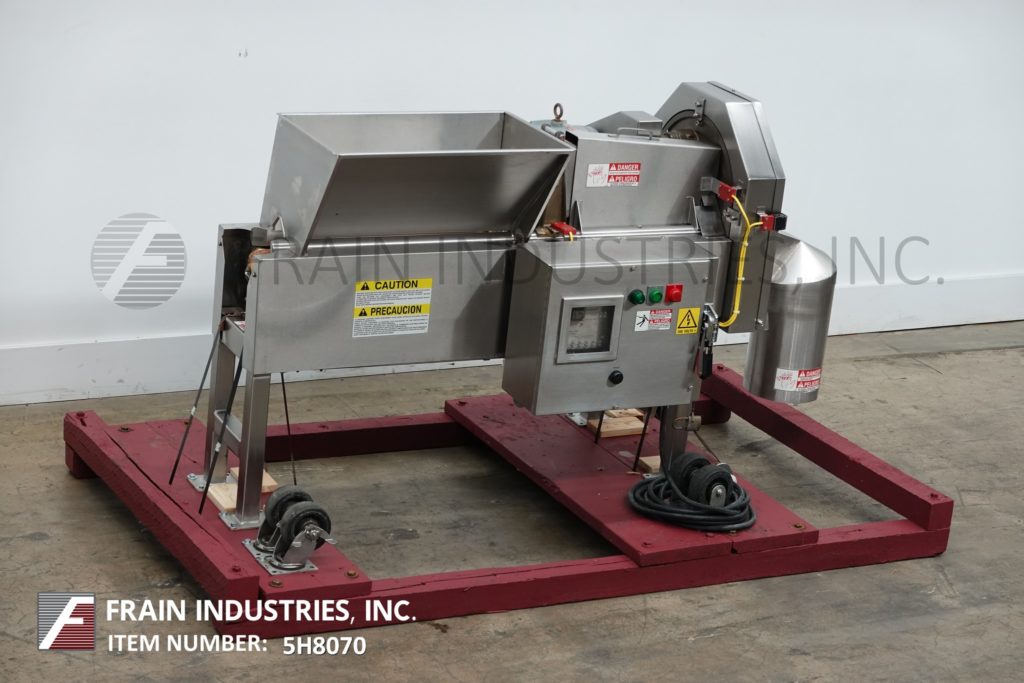 返回所有设备Urschel, OV型,自动,美国农业部批准的切片机,用于各种烘焙和零食产品的均匀的扁平或褶皱式切片每小时产品的磅数-取决于材料和应用。配备52"长的v型皮带在饲料25"长的负载区域,产品压下皮带和8½"外径放电与14"地间隙。可容纳直径达2¾”的产品,并可生产1/16”至1¾”厚的平片或褶皱片。更换零件以适应不同的尺寸和切割范围。安装在(4)不锈钢支腿上。