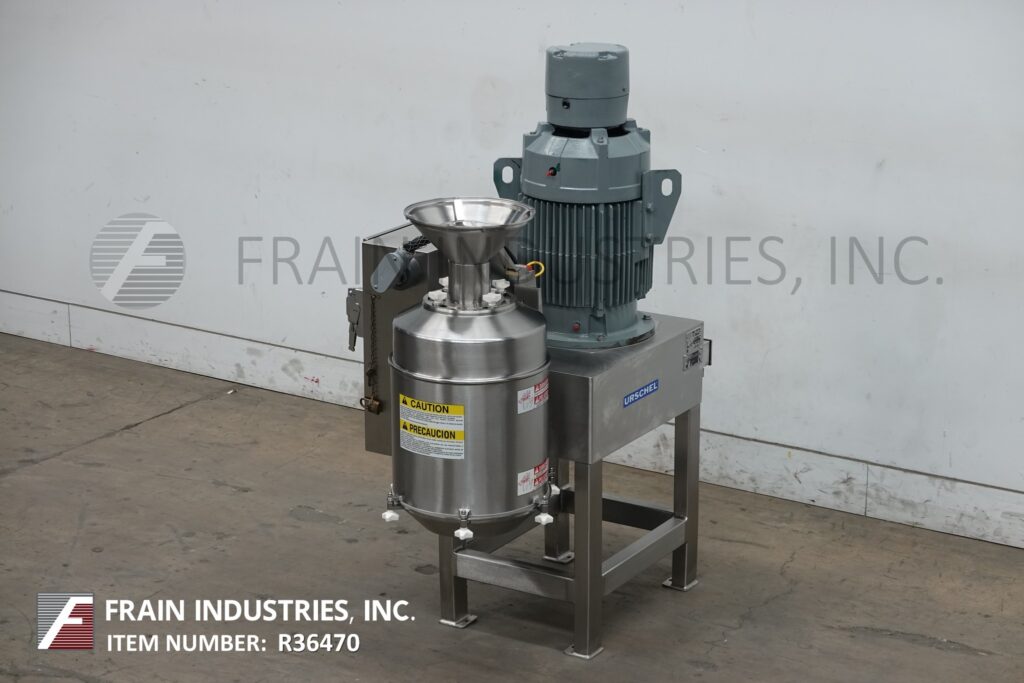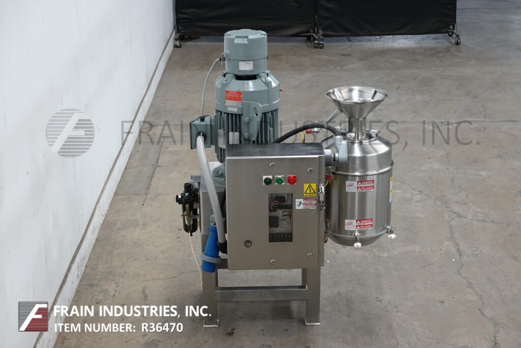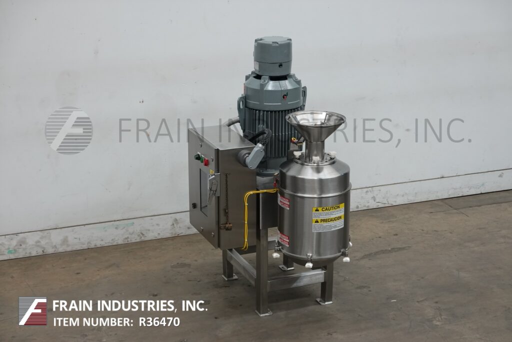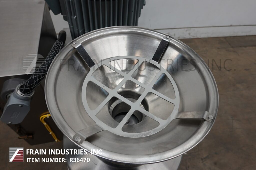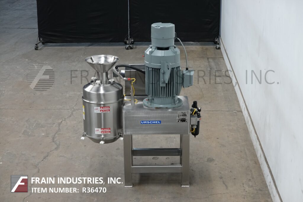 Back to All EquipmentUrschel, Model 1700 Comitrol, stainless steel, reduction mill for free flowing dry and semi-dry product with number of pounds of product per hour – depending on materials and application. Equipped with 14" ID x 7" Deep product hopper with 4½" diameter feed throat, 6" diameter x 1" deep milling chamber with (9) blade high-speed rotating impeller and cutting head with vertical blades, 11" diameter product discharge with 17" floor clearance. Powered by a 30 Hp motor drive. Control panel has push botton start / stop controls. Mounted on stainless steel base frame with casters. Operations include communiting, granulating, milling, slicing, liquifying, dispersing, and pureeing. Change parts required per application.