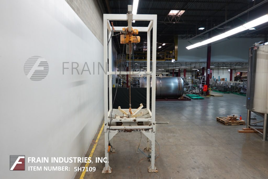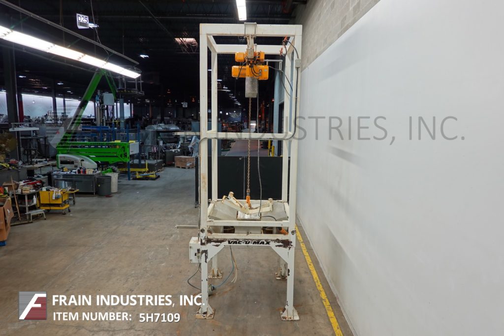 返回所有设备Vac-U-Max,散装袋,超级袋装卸载系统额定电容为3,800磅,每小时数量散装袋 - 取决于材料,应用和操作员灵活性。重型箱管结构设计具有108英寸长的I-梁延伸44英寸,超越框架,蜘蛛升降袋附件,允许提升各种尺寸的散装袋。Harrington 2吨(4000LB)容量动力提升机和带有法兰安装产品接收室的小车,配有按摩桨和51“排放高度。