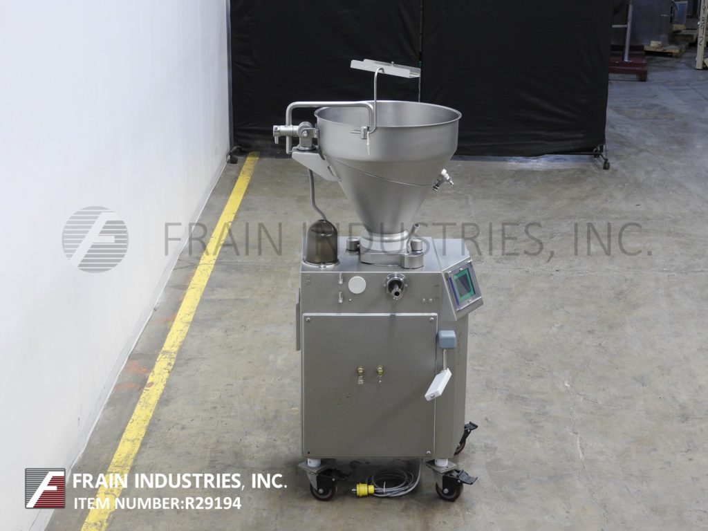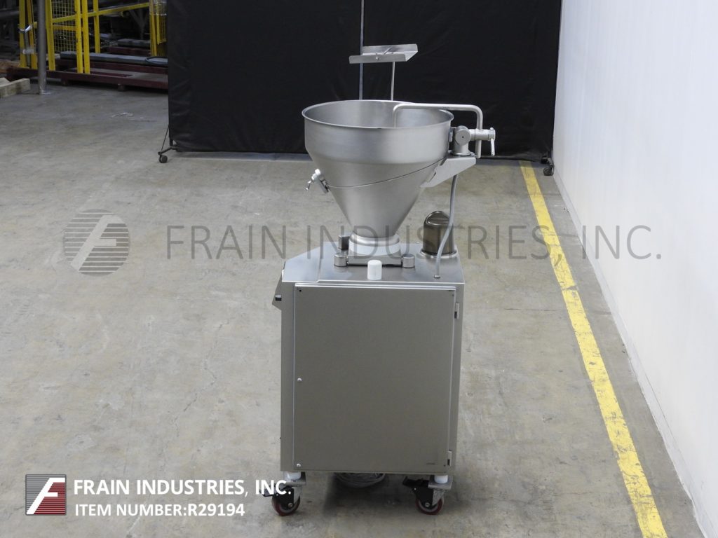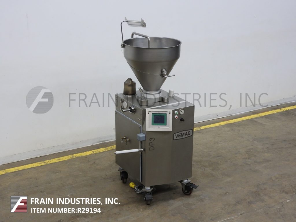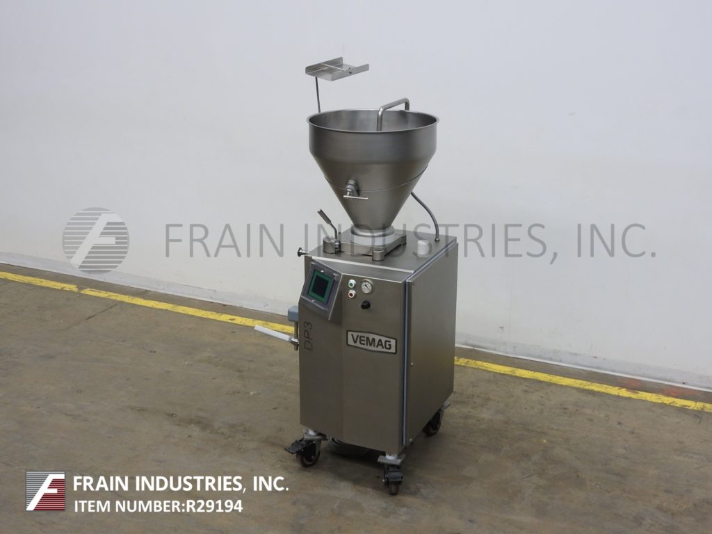 返回所有设备Vemag DP3,连续,不锈钢,旋转叶片泵,填料,切片机,专为小批量和容易清洗(频繁的产品更换)每小时的产品磅-取决于材料和应用。重量从10克到200克。配备24"直径x 24"深倾斜后分产品料斗螺杆和侧刮,旋转叶片产品进料,真空锅,塞端口和滤网,膝部水平调节杠杆,真空压力表,无油真空泵和3"外径螺纹出料口40"地板间隙。触摸屏控制器,分度和真空控制拨号和启动/停止按钮。速度取决于材料,应用和机器配置。(例如:每分钟多达140份,每份10克。)安装在施法者。